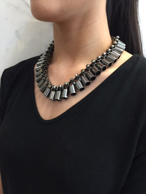 MAWI's signature Sun Ray Tube necklace has been updated bigger and bolder. Hematite-plated tube necklace. Swarovski crystal embellishment. Fold-over clasp fastening. Designer-stamped box clasp closure in hematite-plated brass and crystals.