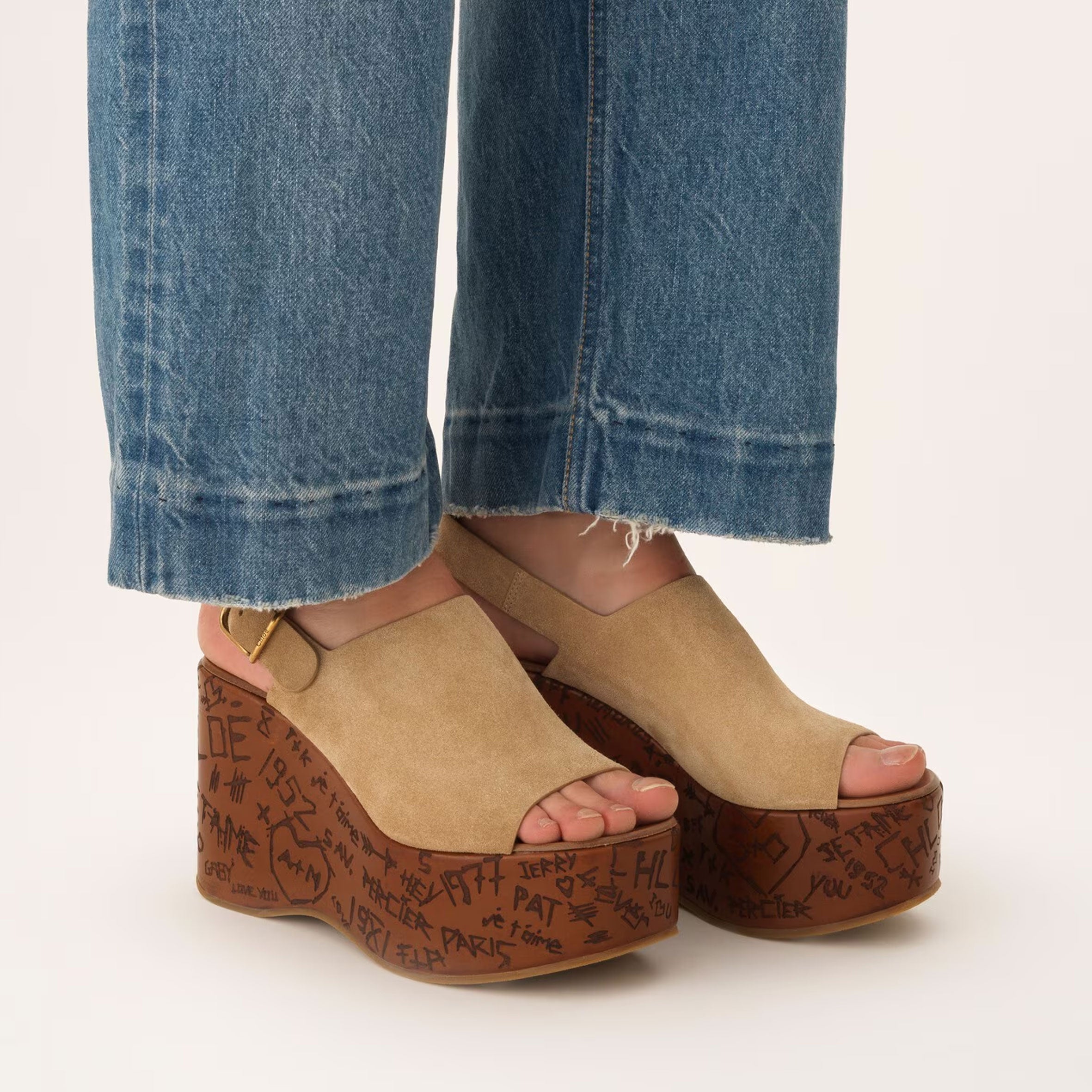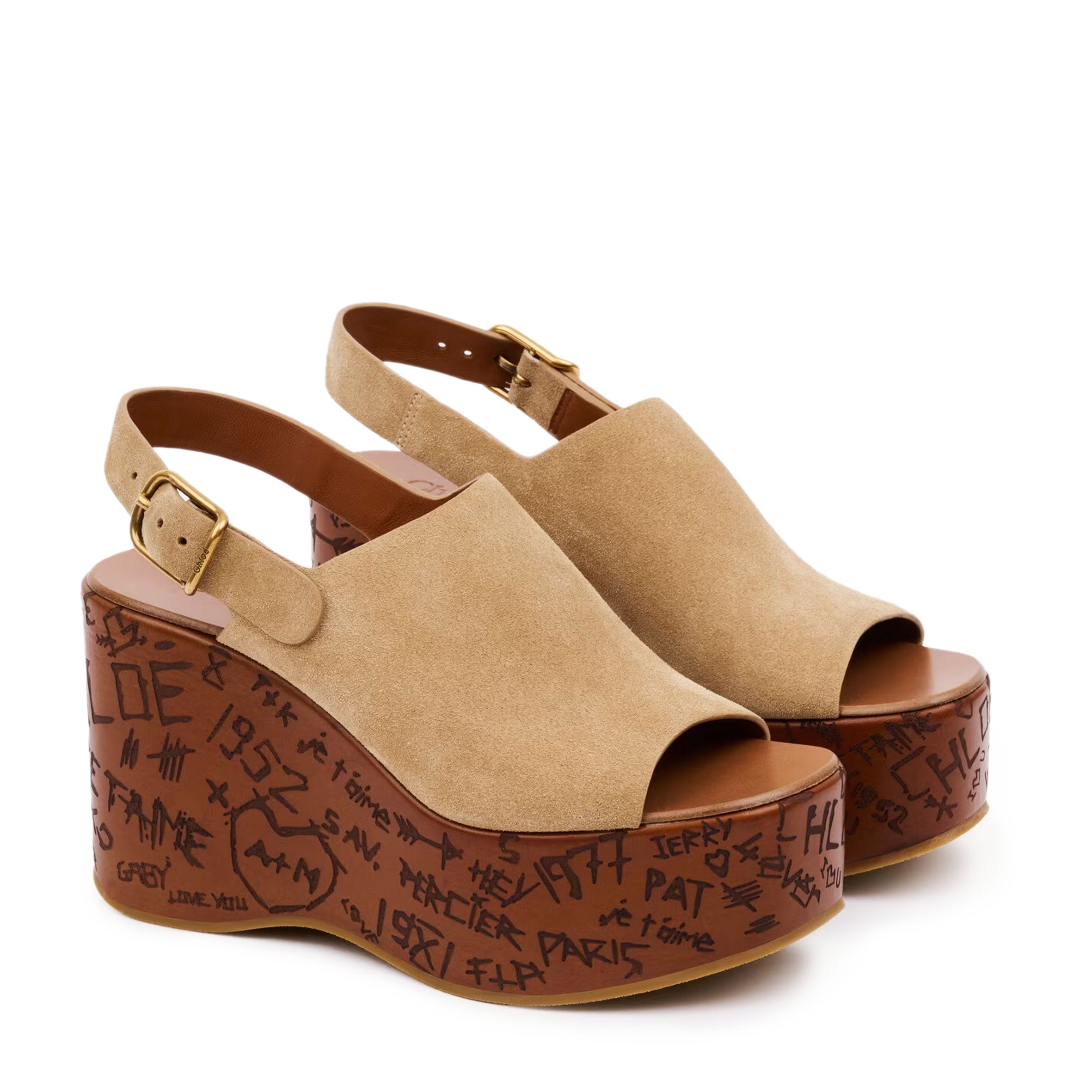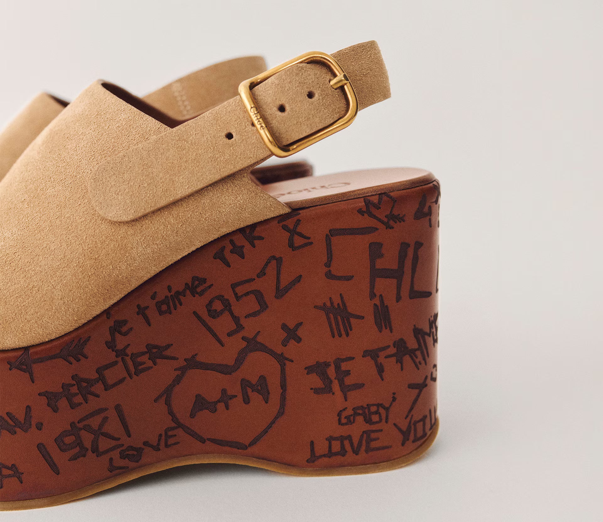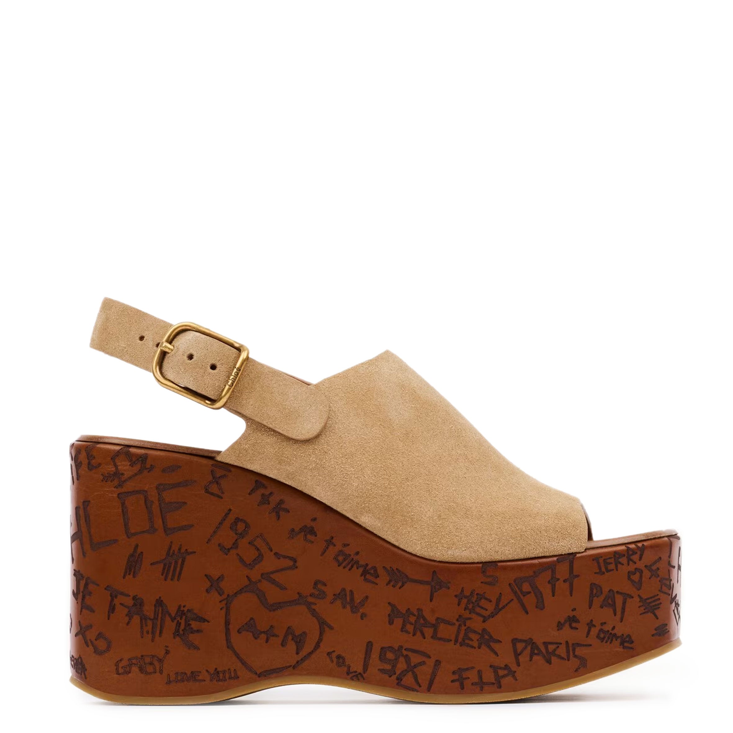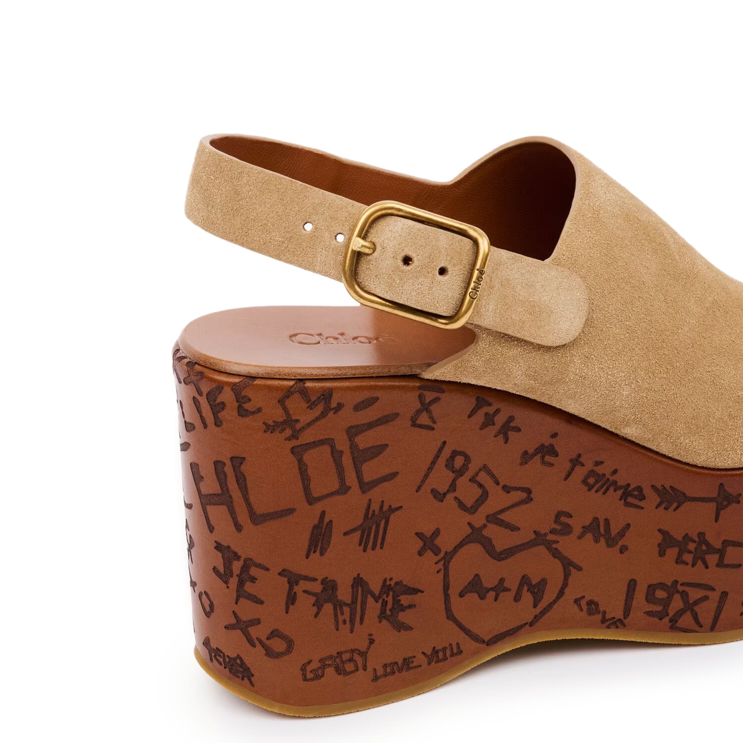 The sole references the Maison's heritage like engraved love notes on trees. A Chloé-engraved buckle finishes these sandals for a comfortable fit.