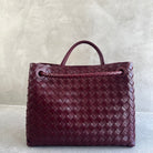 Medium Intrecciato leather top handle bag with sliding cross-body strap • Compartmented interior with one zipped pocket, two open pockets • Magnetic closure