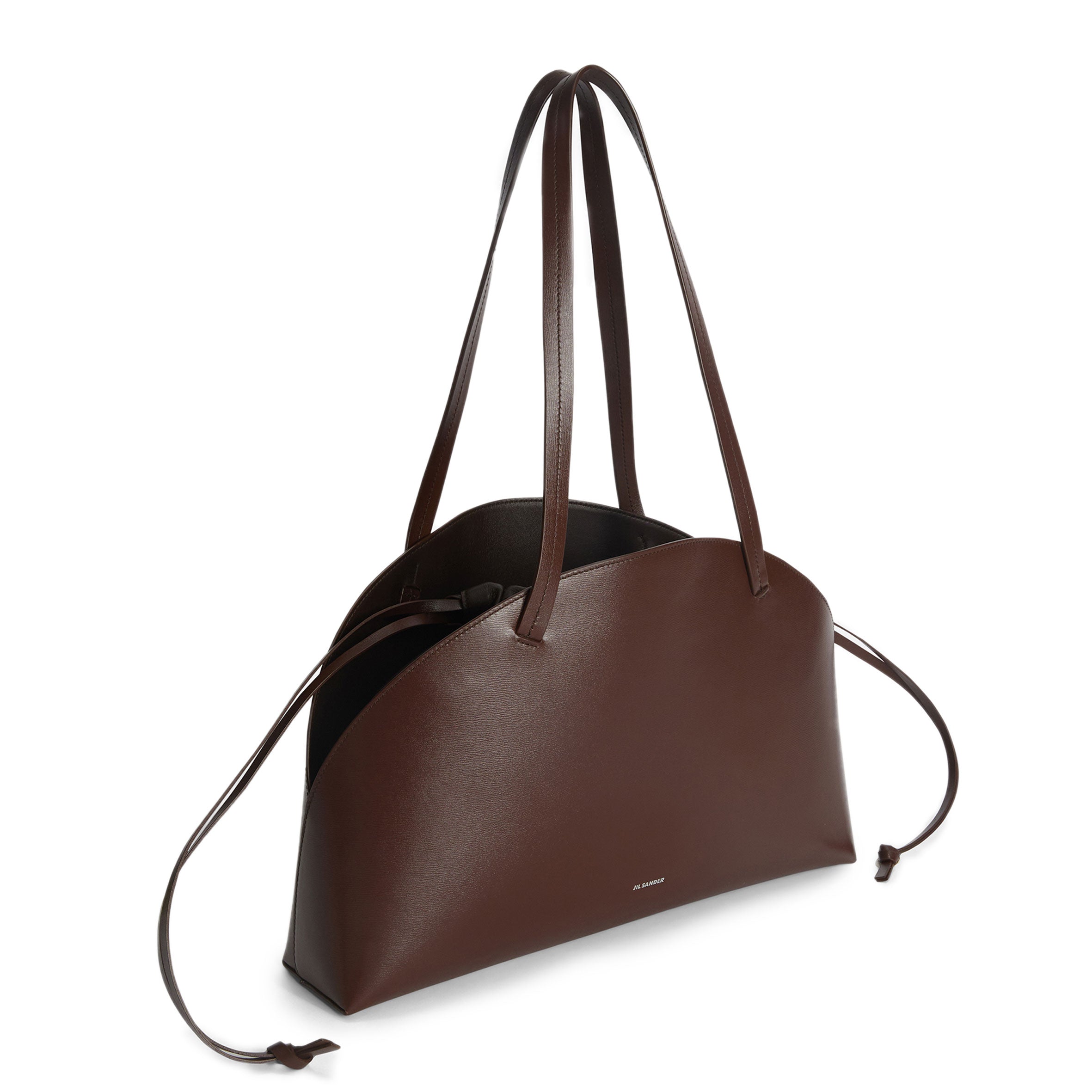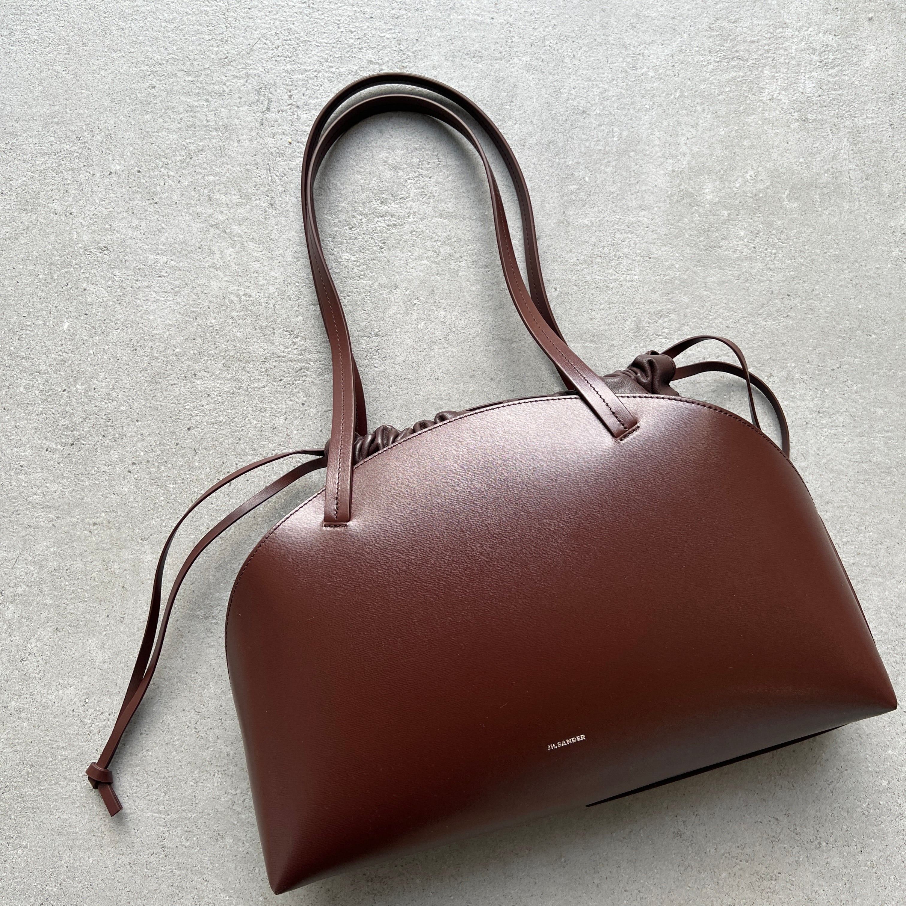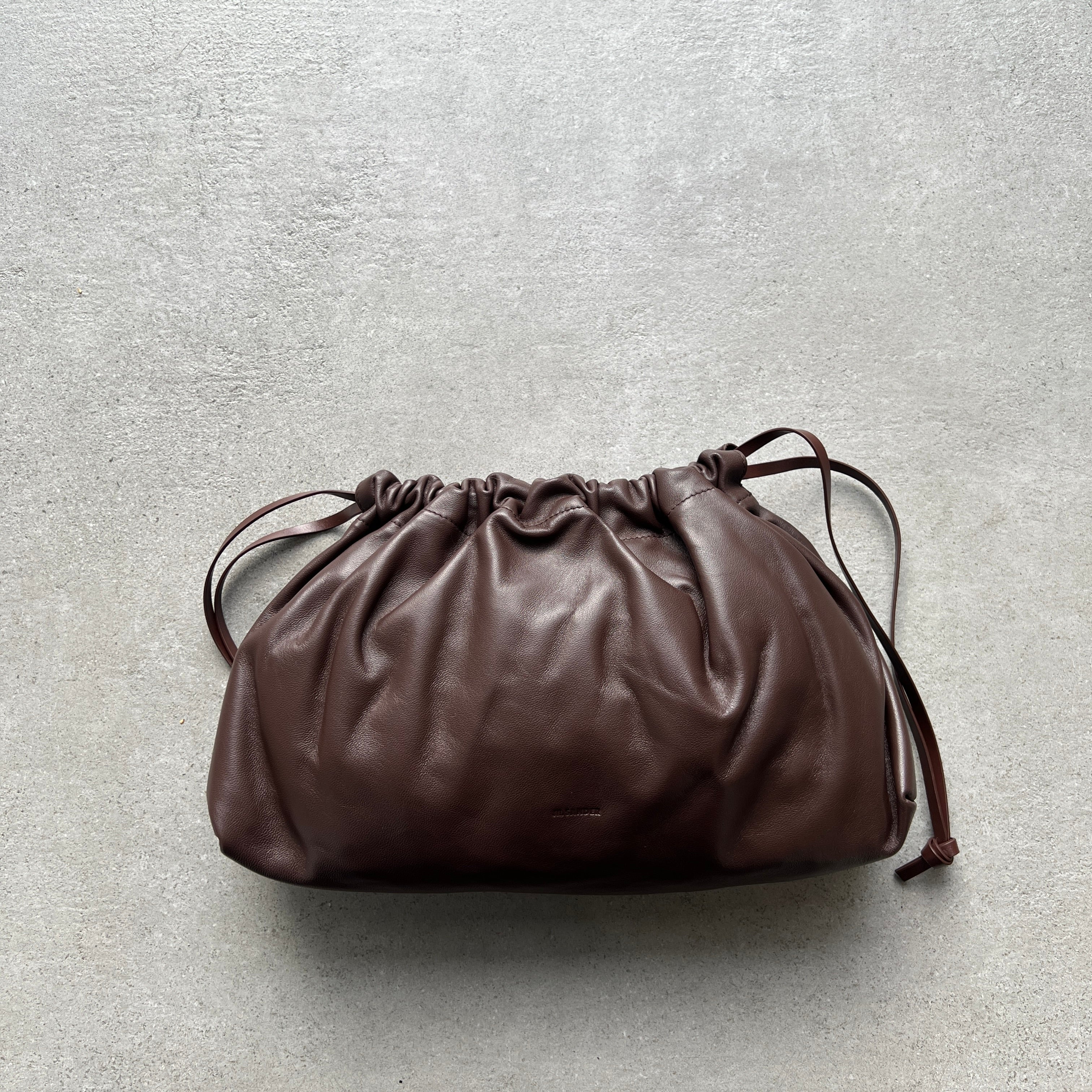 Medium-sized leather shoulder bag with embossed Jil Sander logo. Features a detachable inner pouch with drawstring closure.
