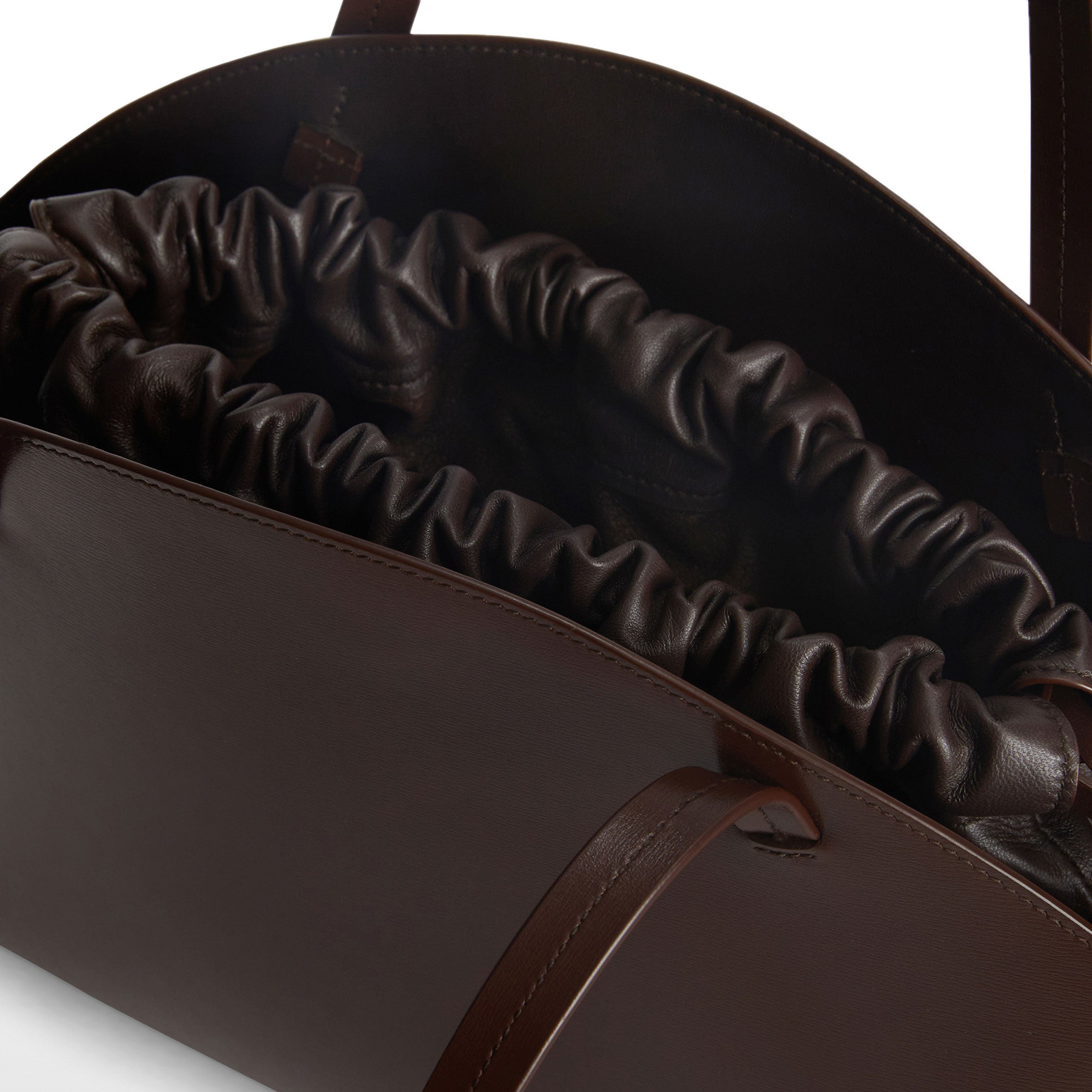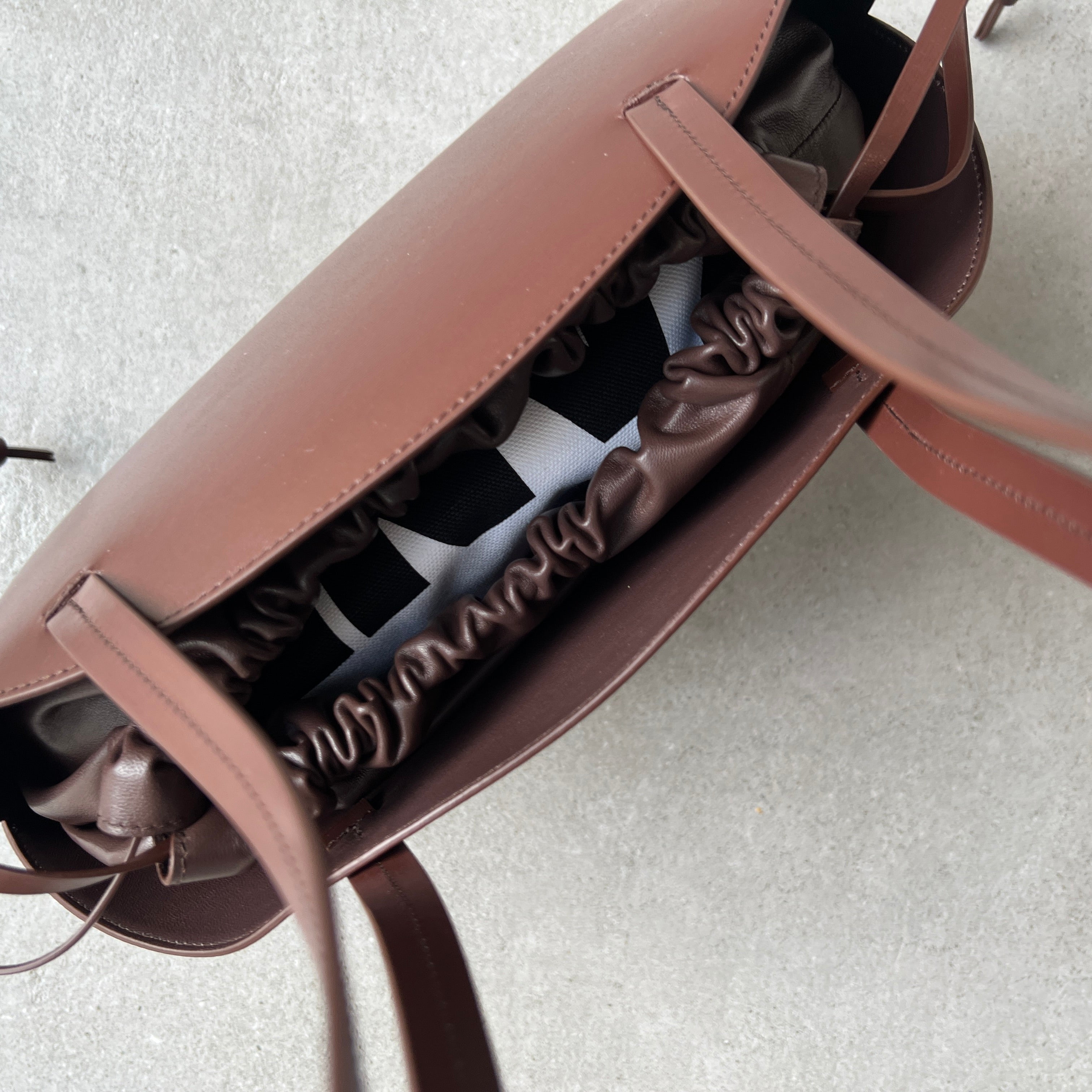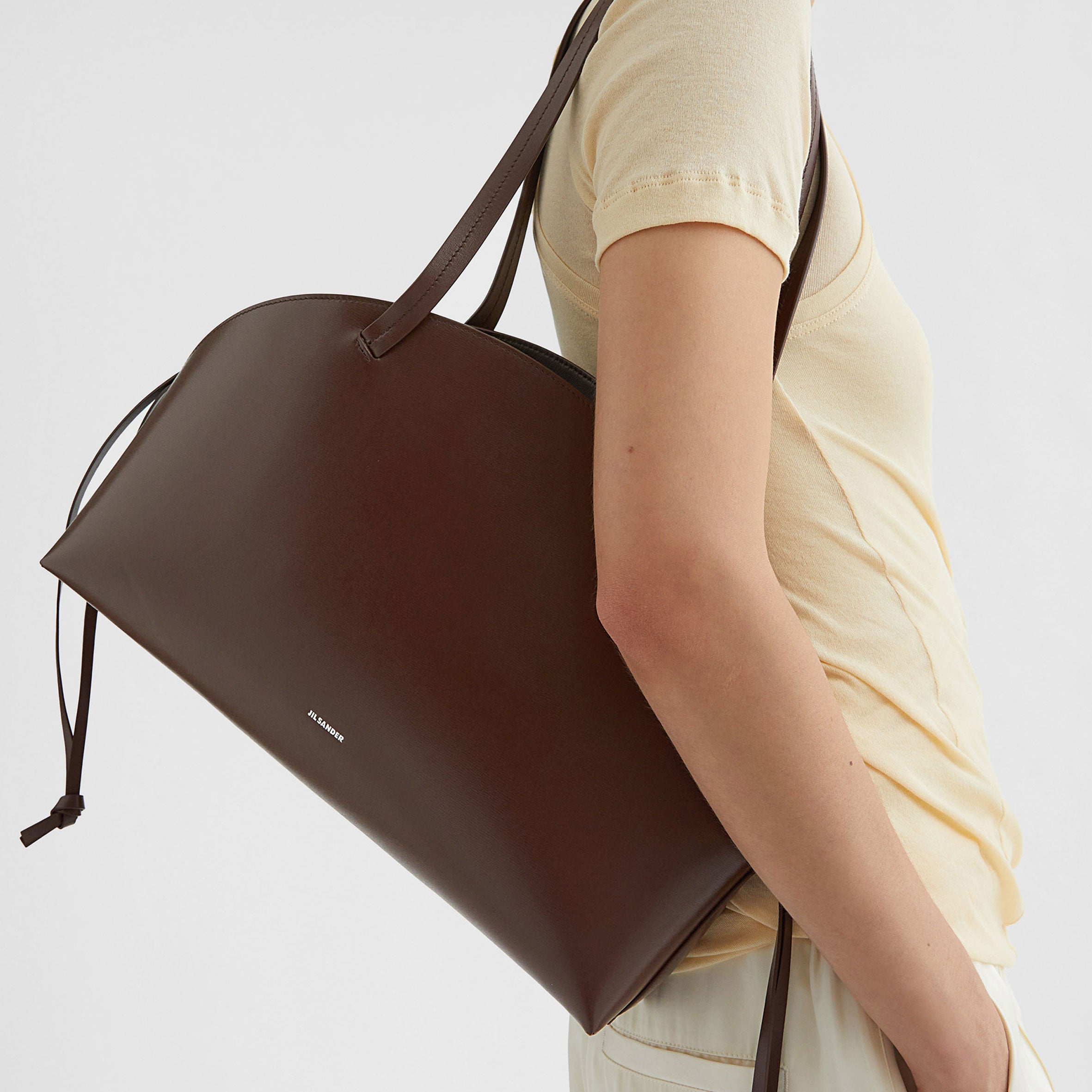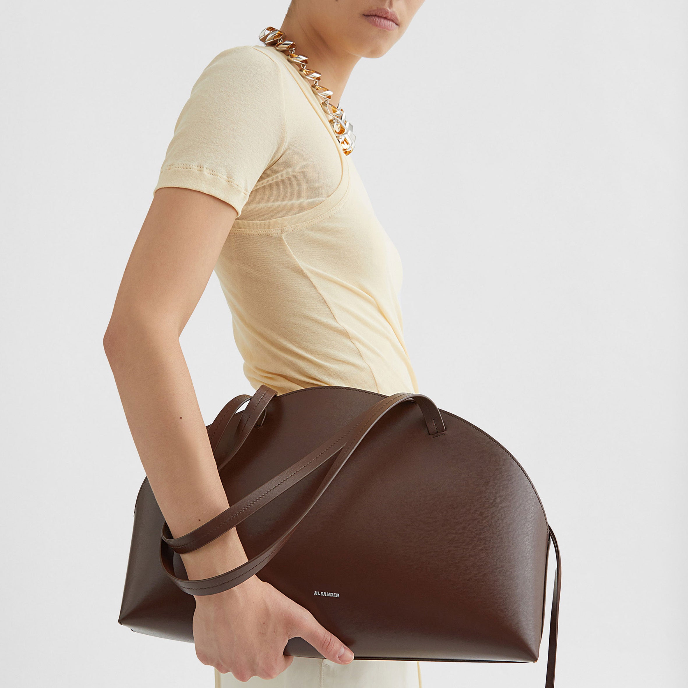 Medium-sized leather shoulder bag with embossed Jil Sander logo. Features a detachable inner pouch with drawstring closure.