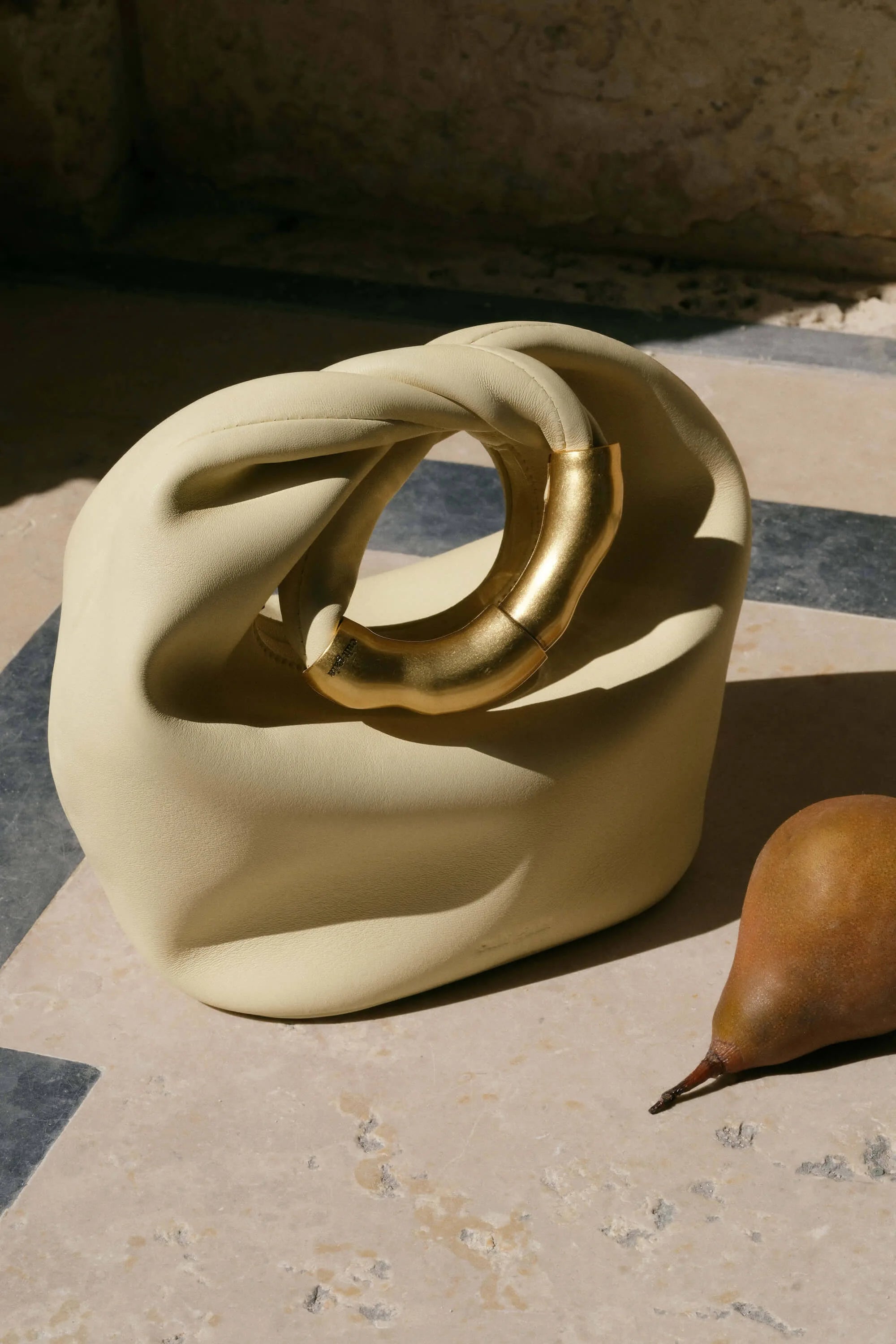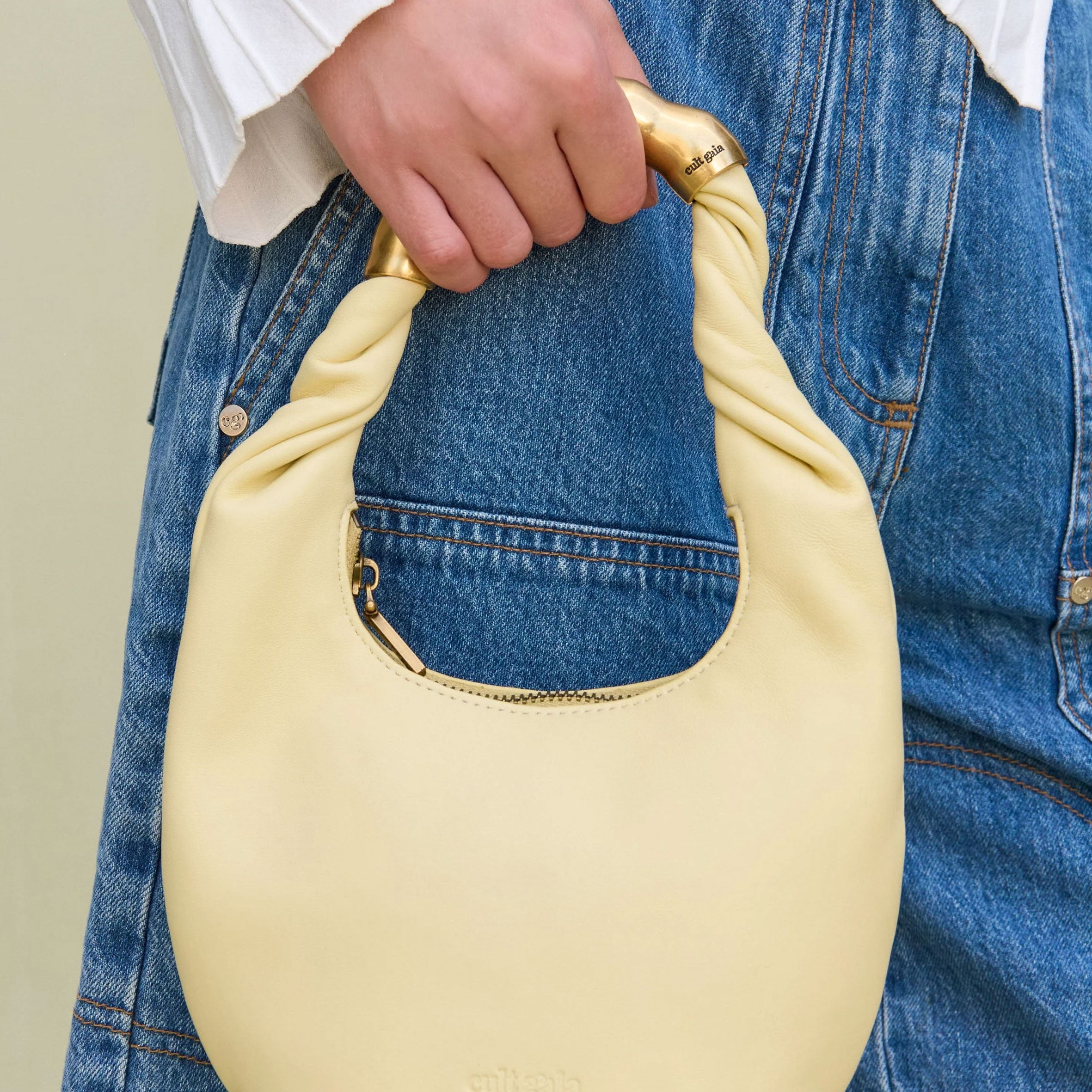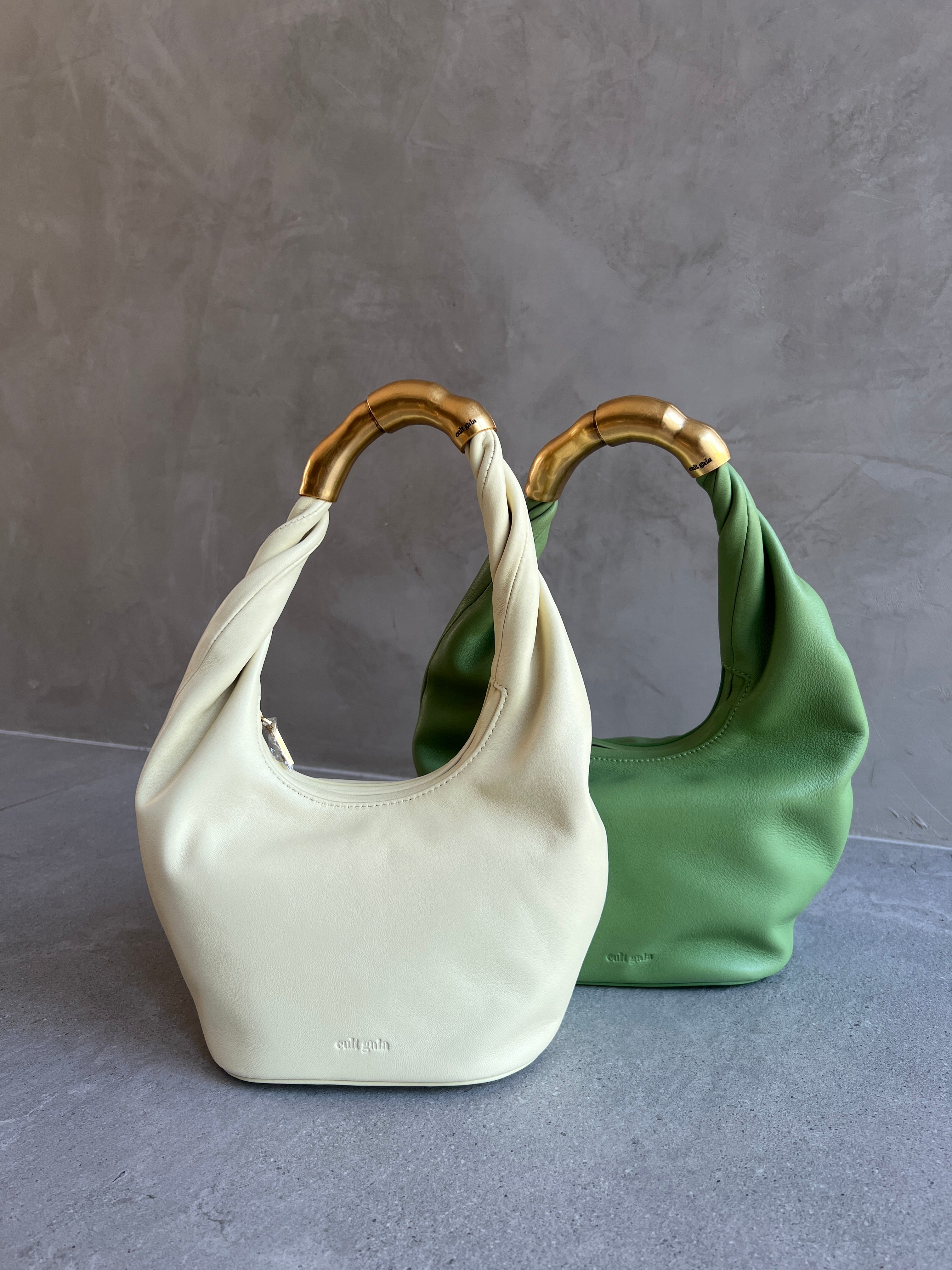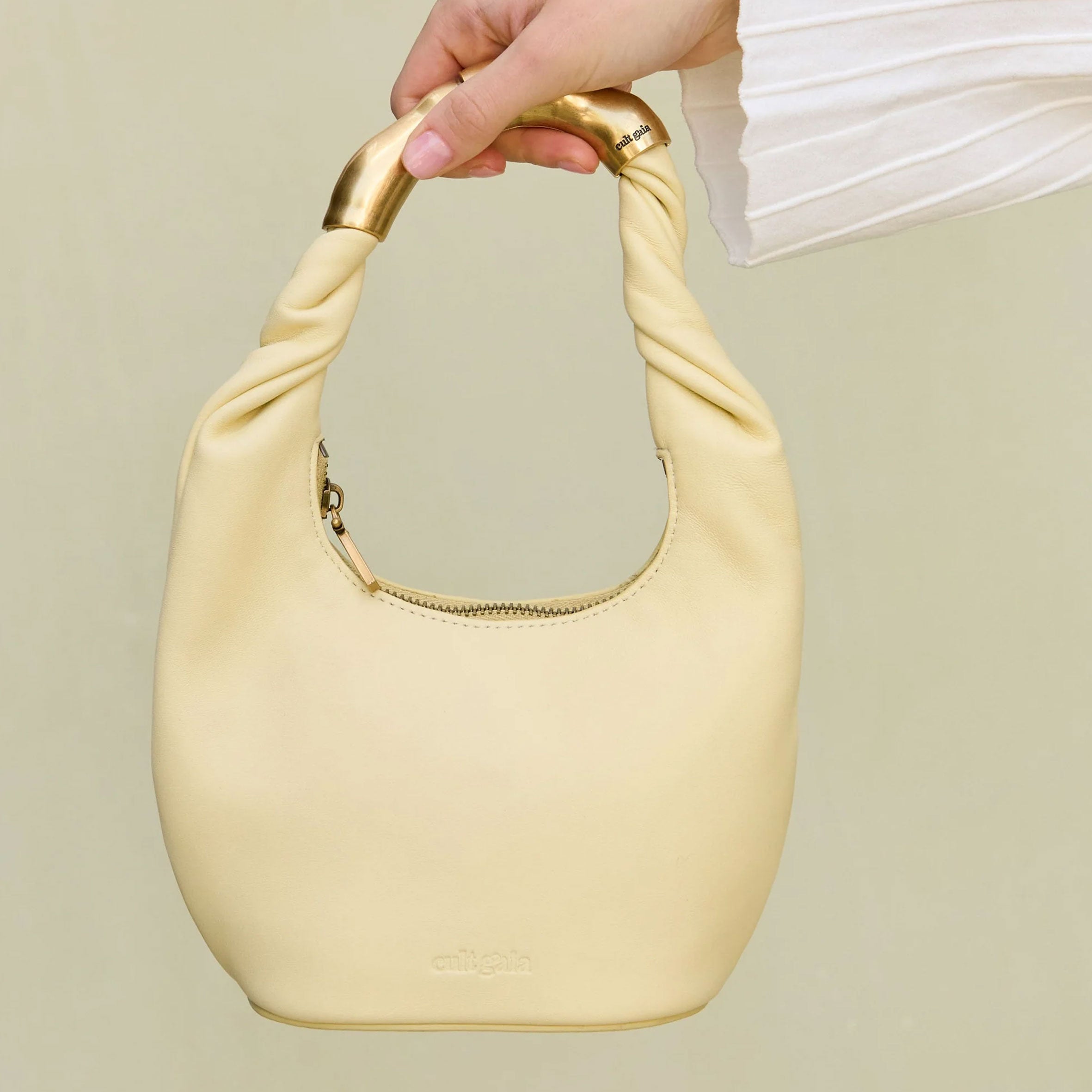 A slouchy mini bag crafted in leather with an abstract gold-toned top handle.