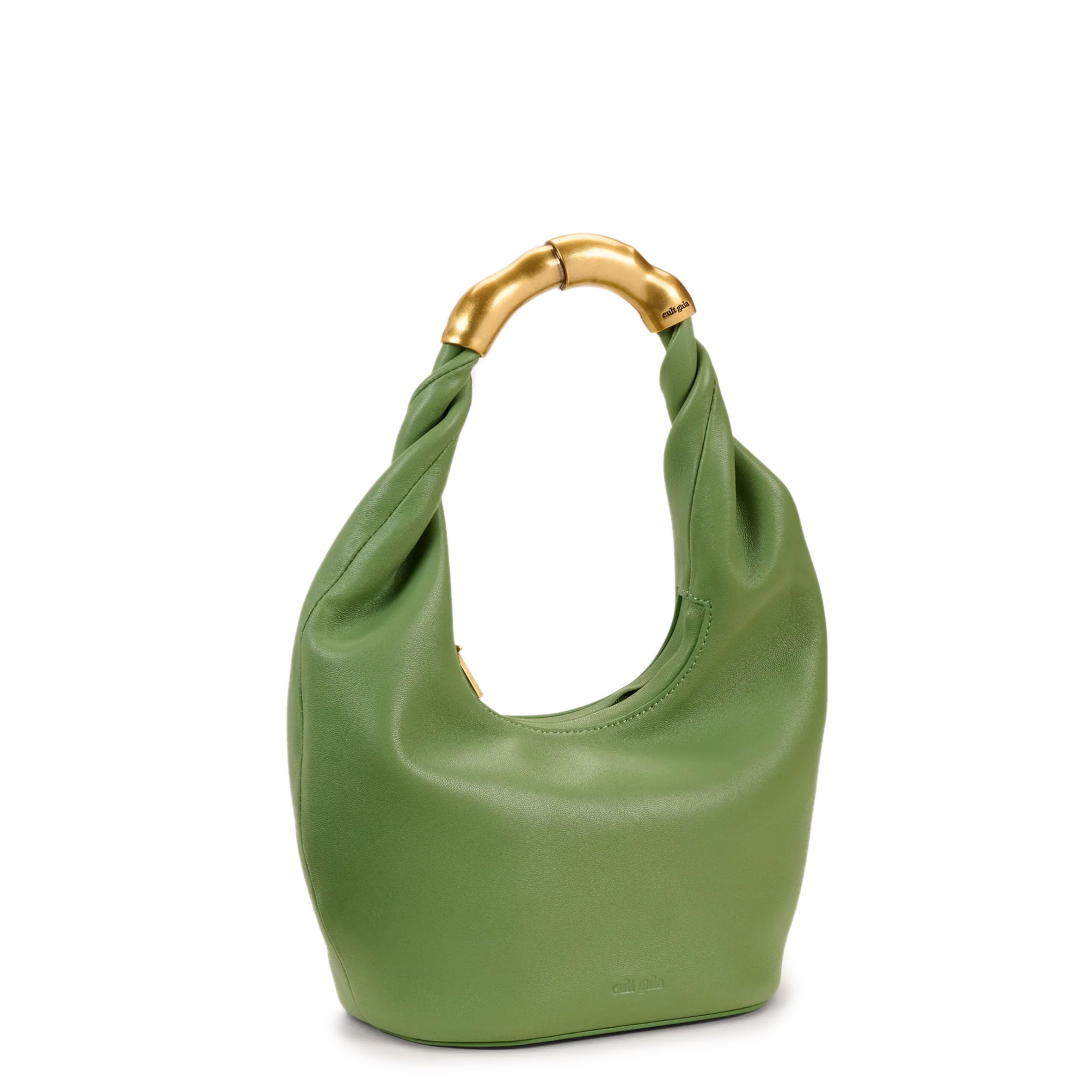 A slouchy mini bag crafted in leather with an abstract gold-toned top handle.