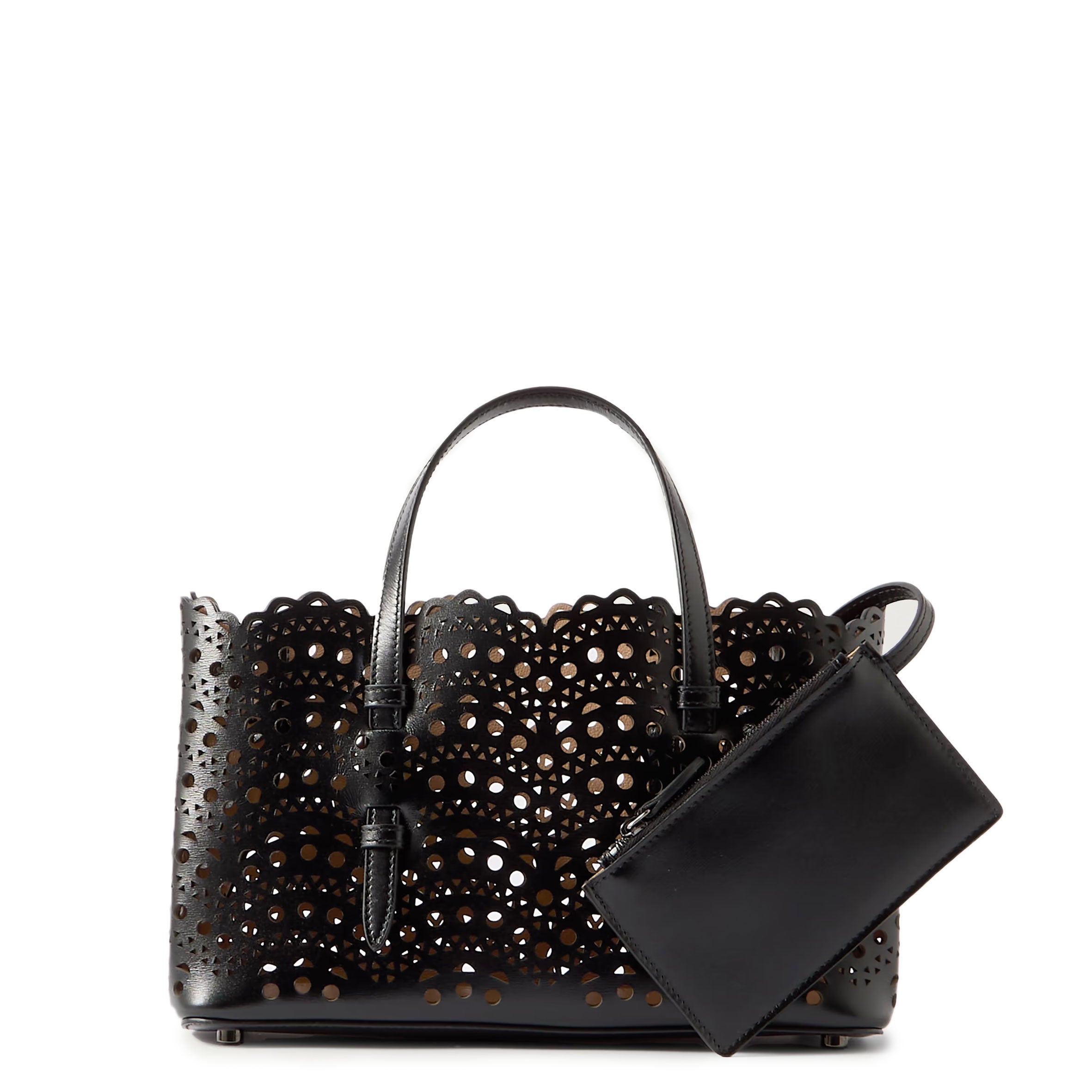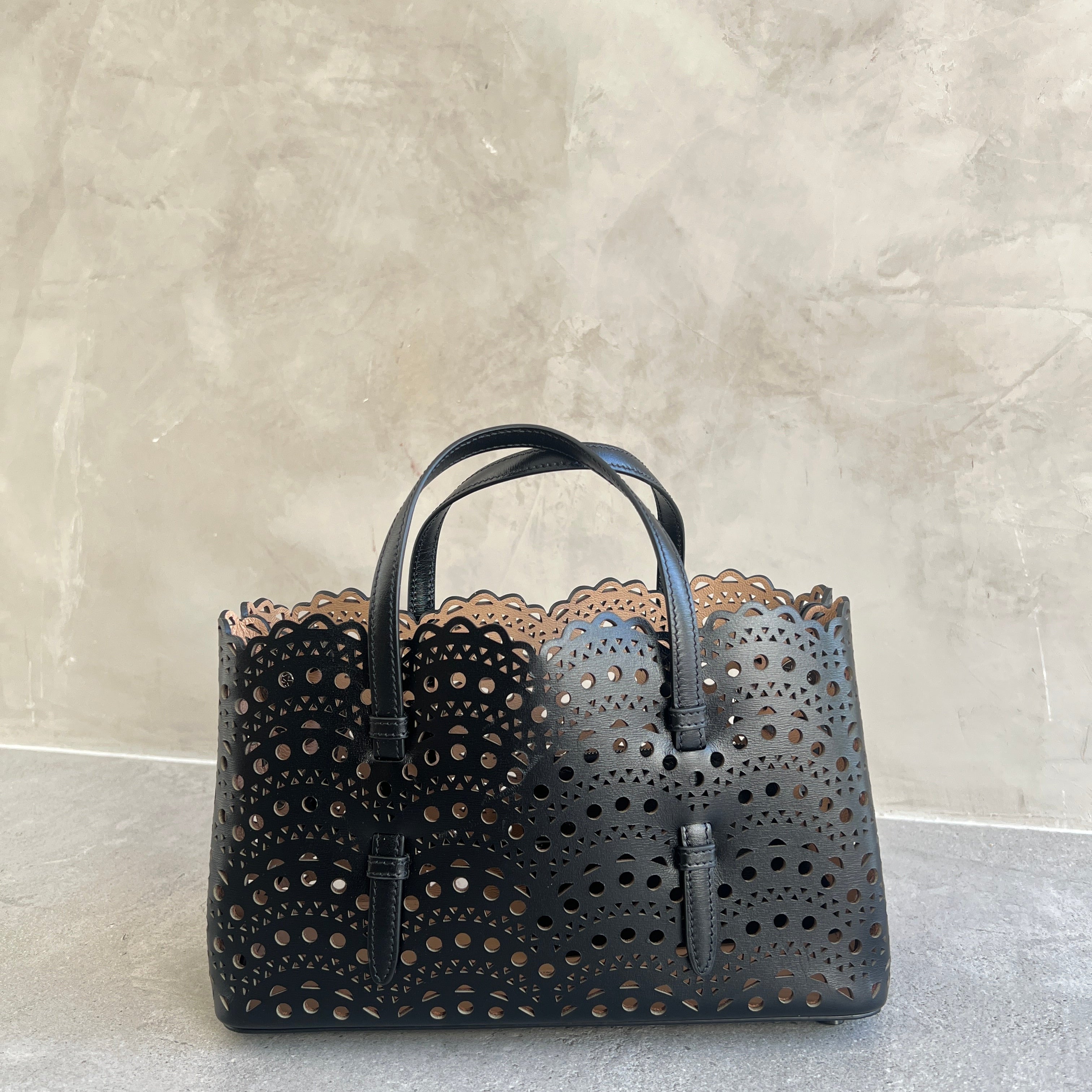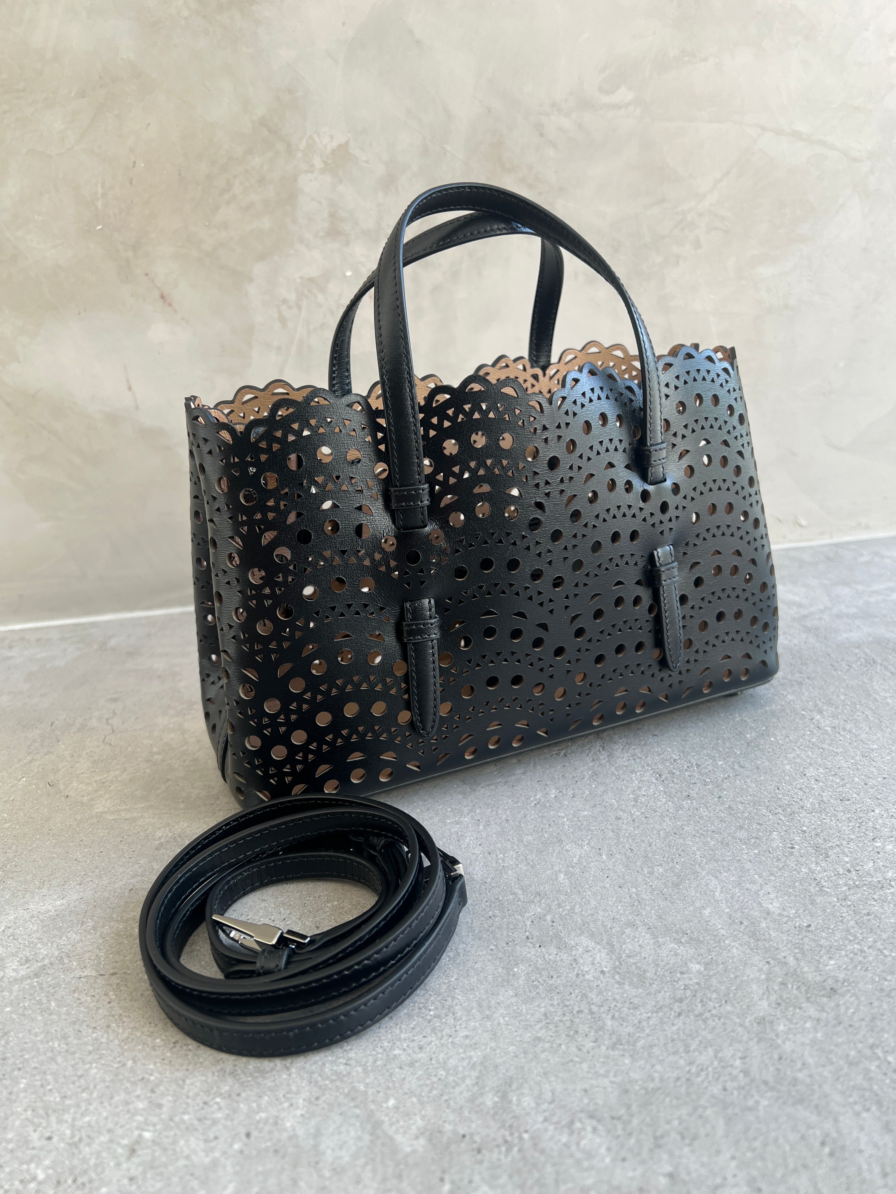 Discover the Alaia Tote Bag in Wave Pattern – a blend of lace-inspired beauty and architectural elegance. Its snap-fastening gusseted sides expand, and it comes with a leather pouch and galvanized silver hardware. Effortlessly chic for hand carry.