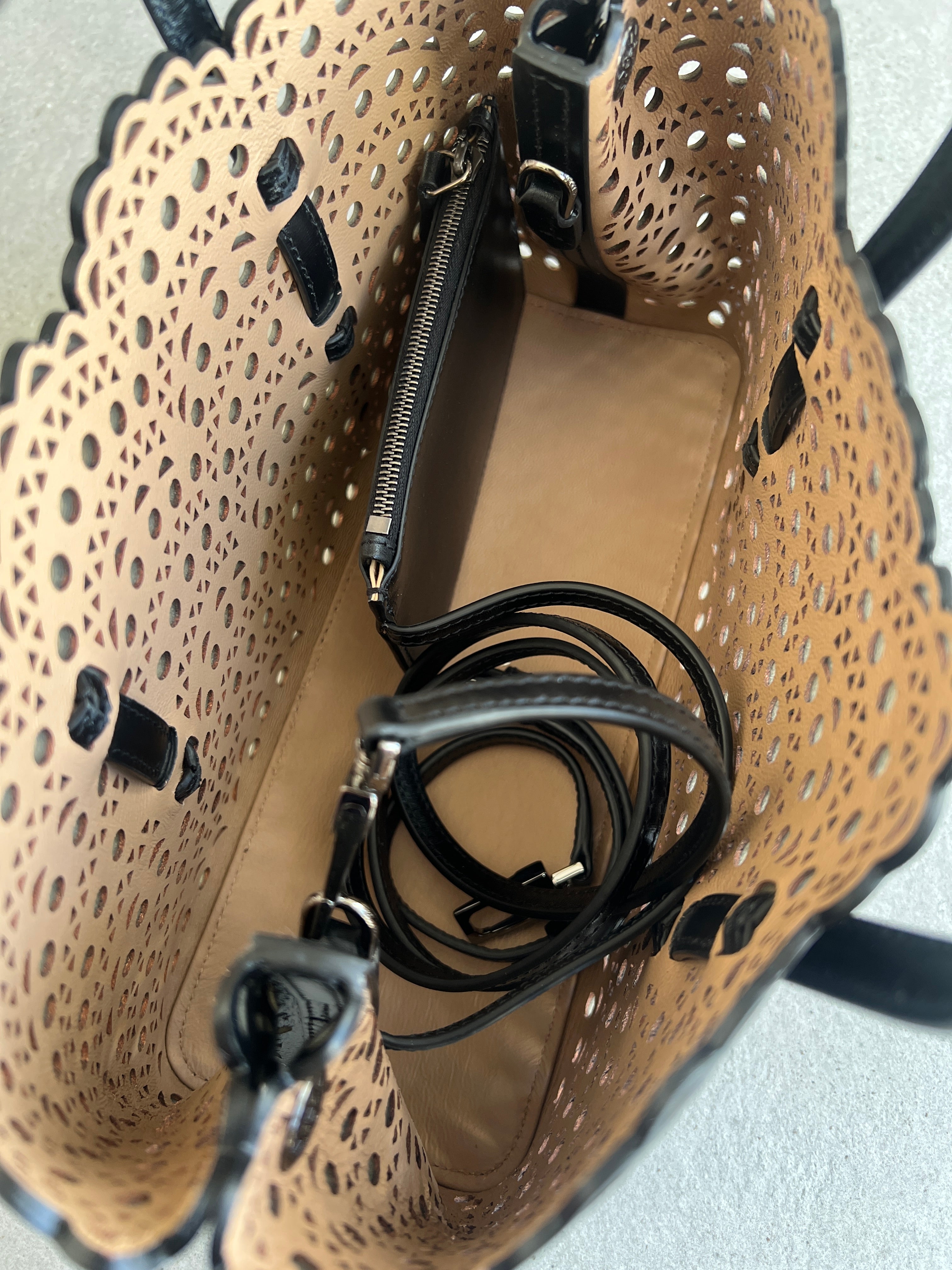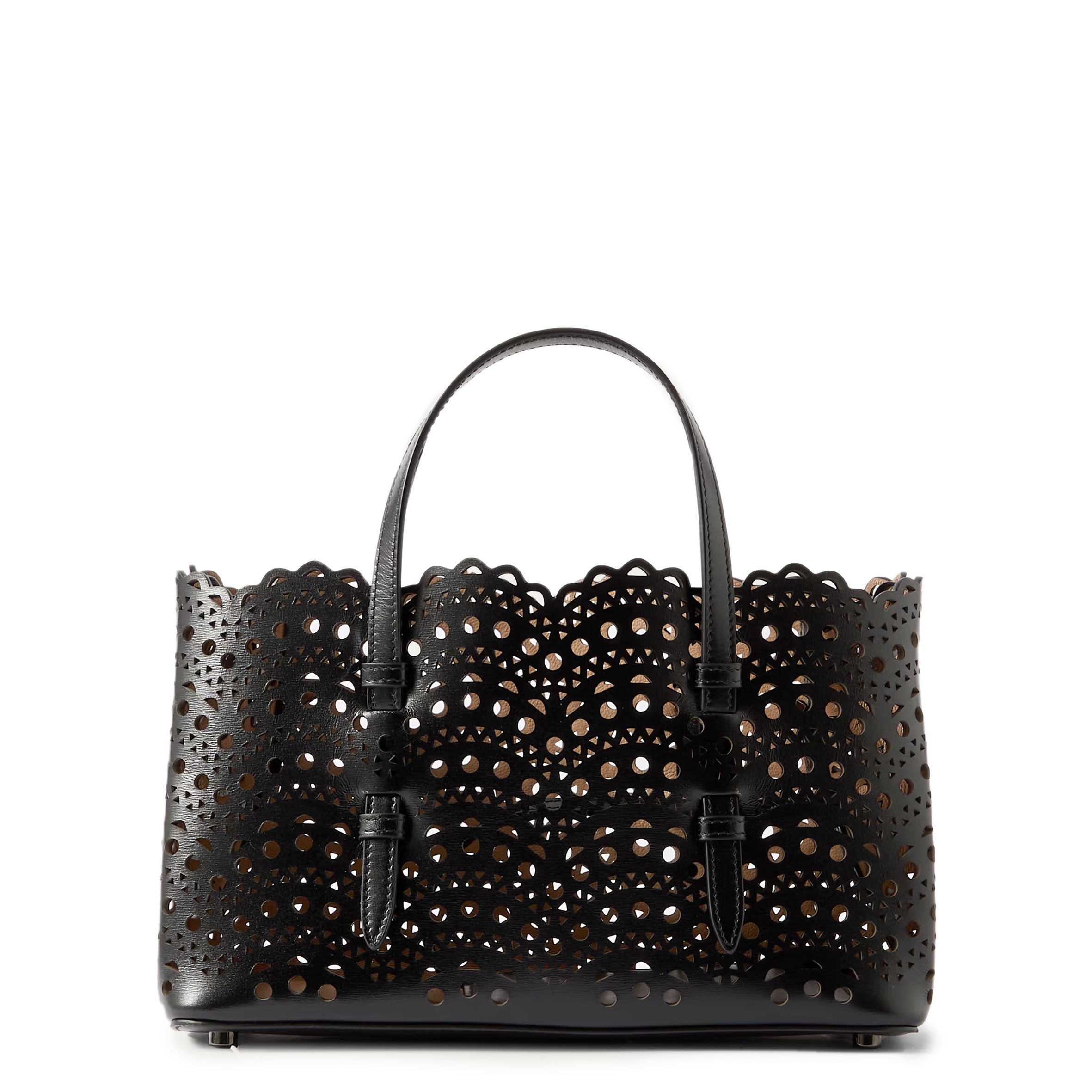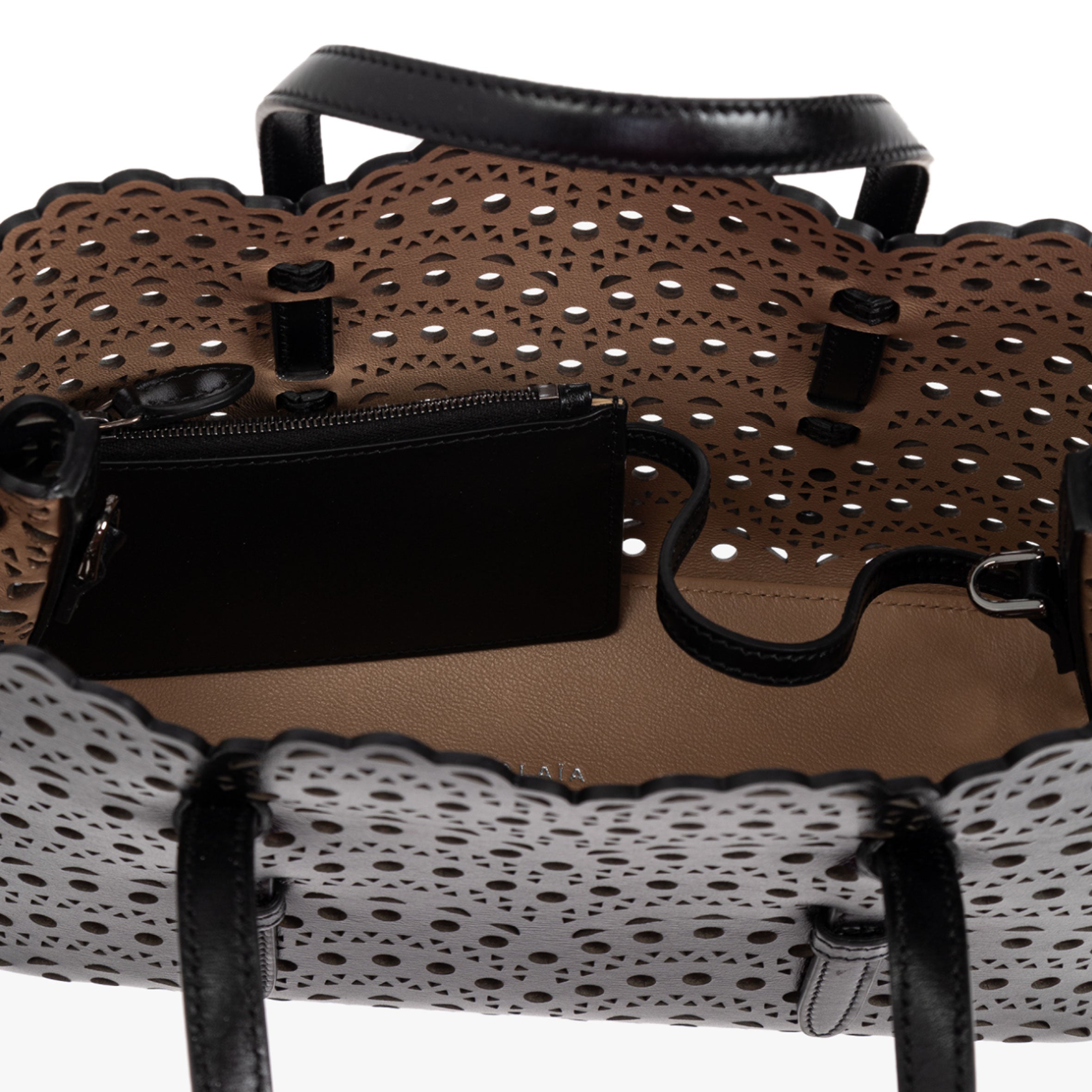 Discover the Alaia Tote Bag in Wave Pattern – a blend of lace-inspired beauty and architectural elegance. Its snap-fastening gusseted sides expand, and it comes with a leather pouch and galvanized silver hardware. Effortlessly chic for hand carry.