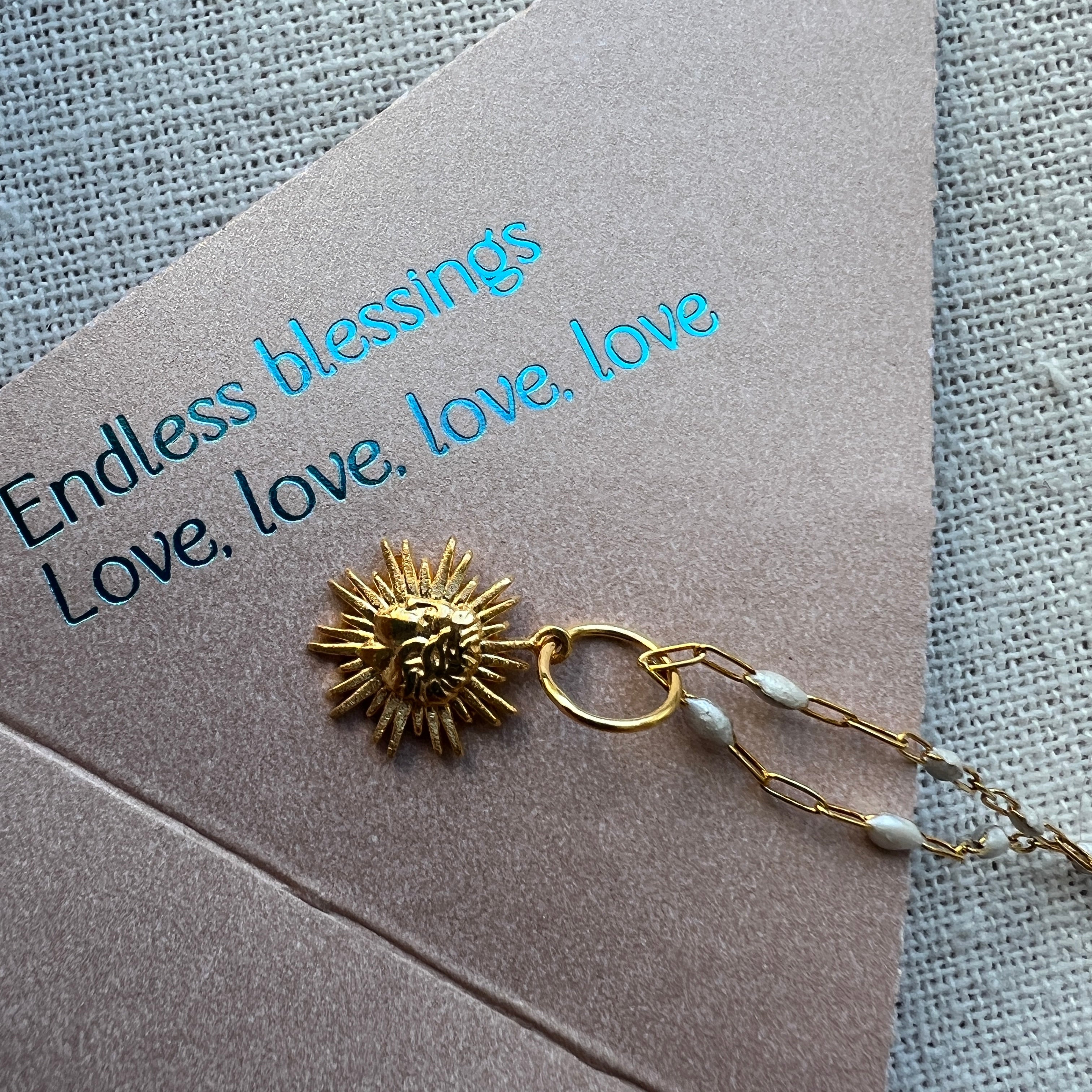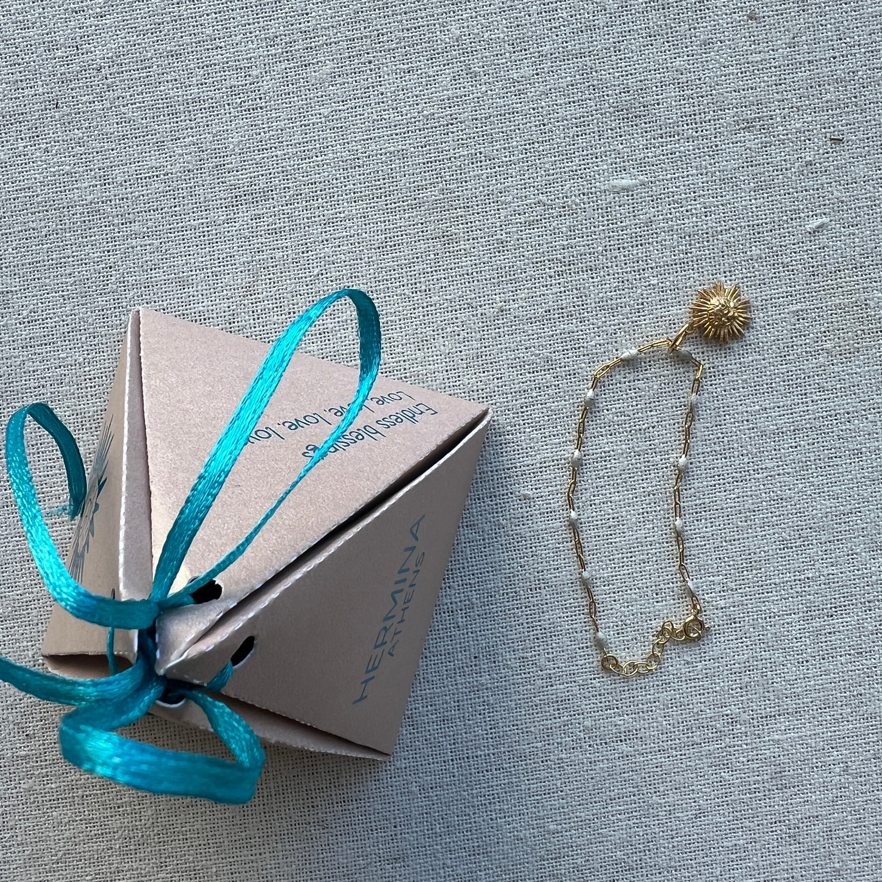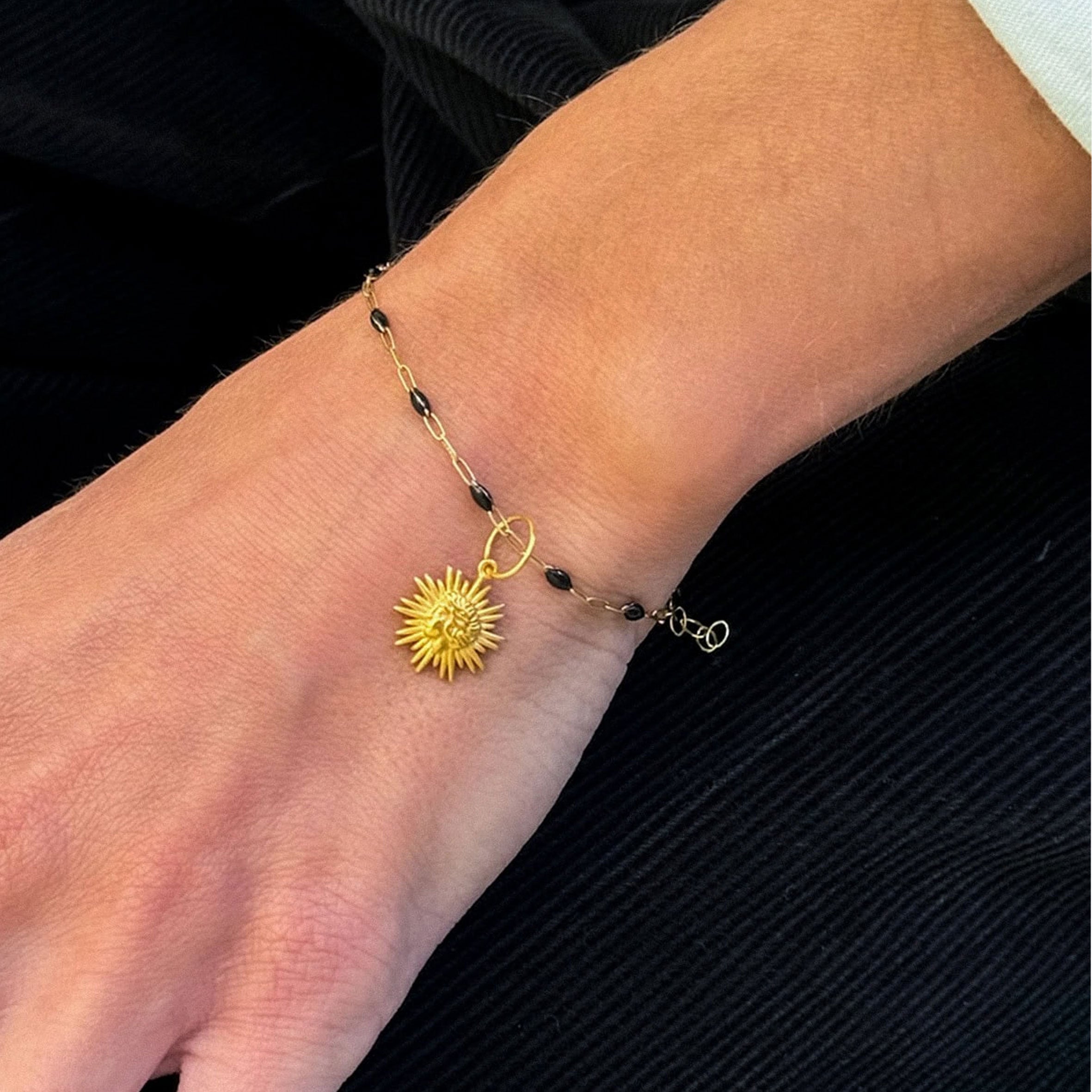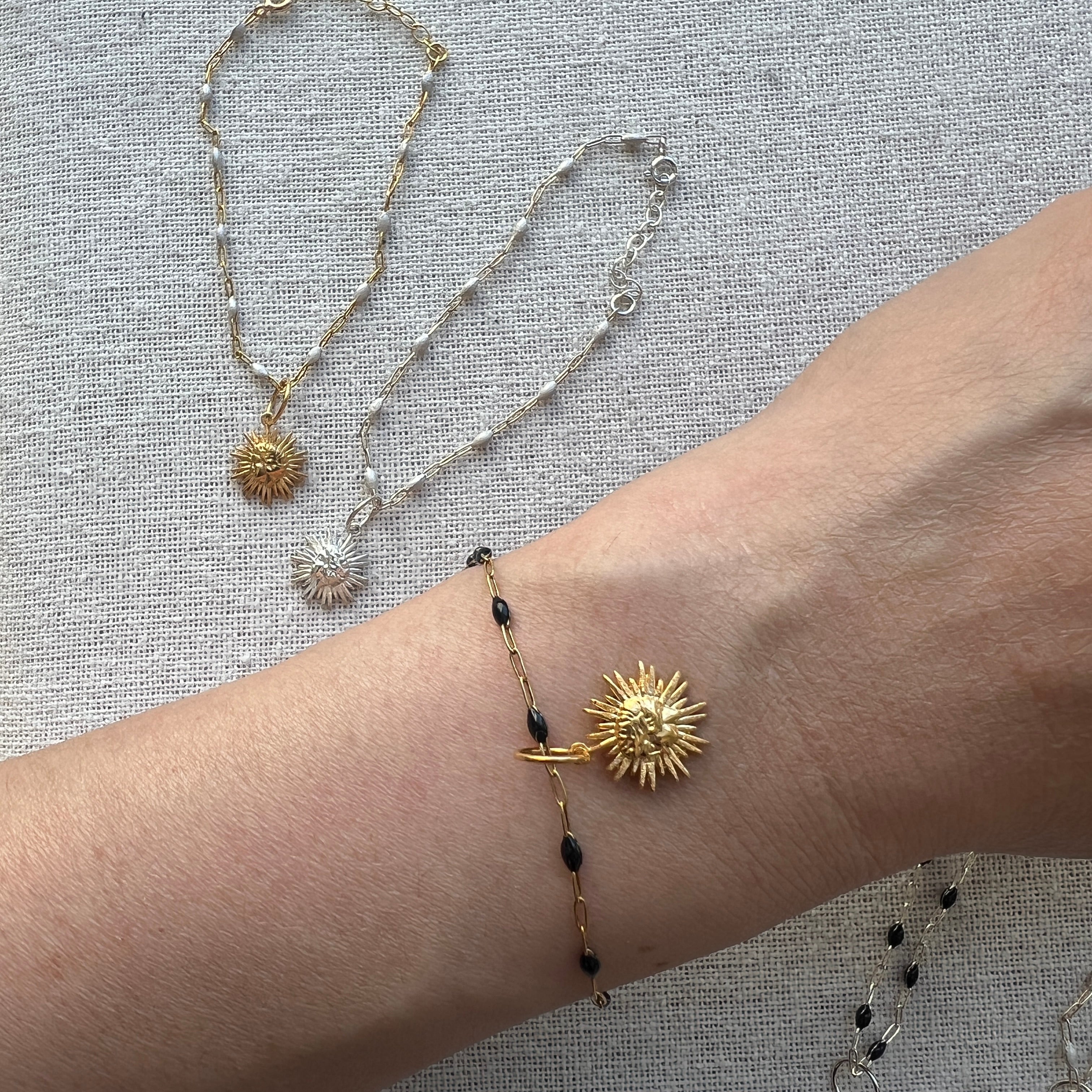 A delicate, enamel chain bracelet adorned with a tiny solar-shaped charm, every bit as merry as the sun. The ultimate symbol of passion and divinity, the sun stands for all the great things in life.