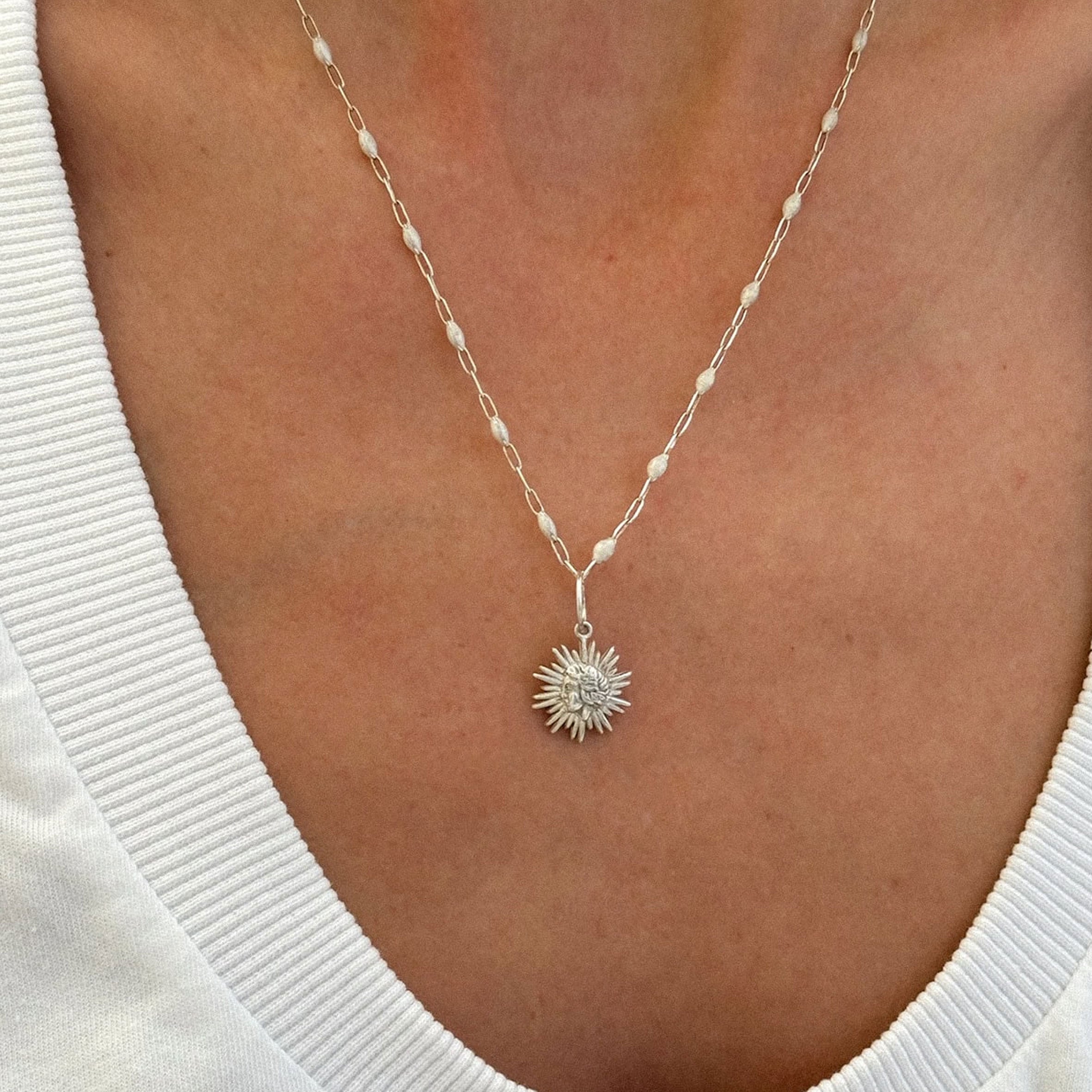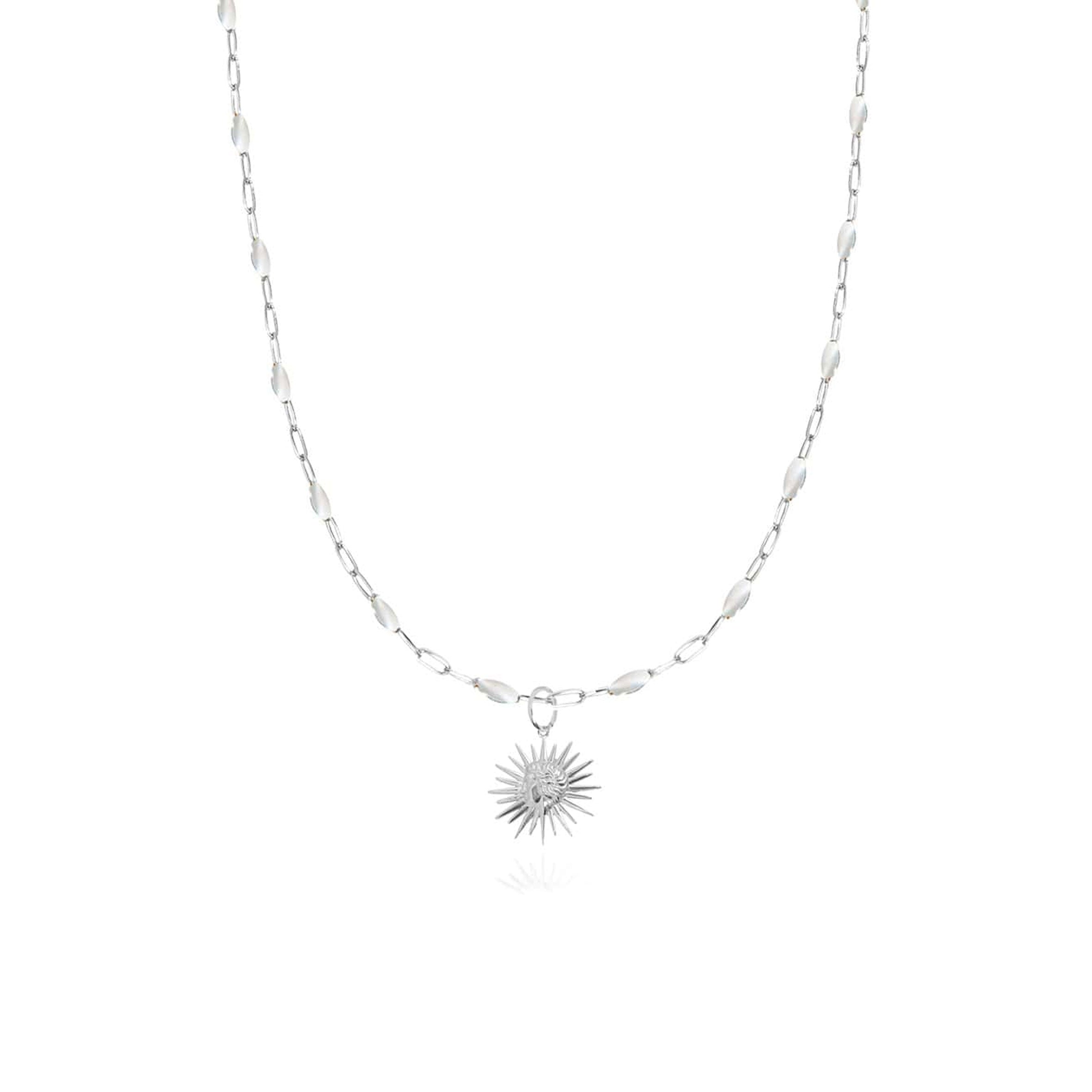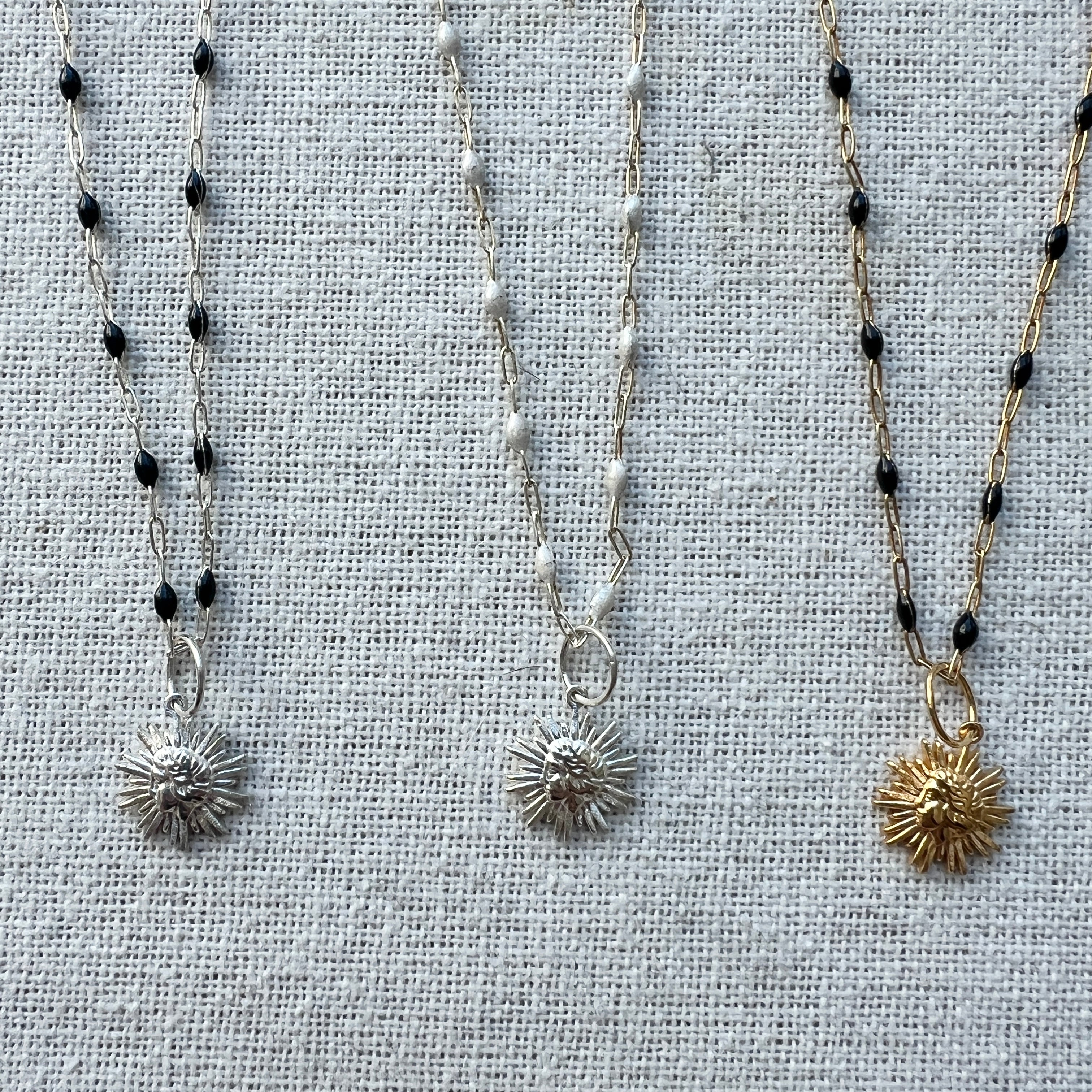 A delicate, enamel chain adorned with a tiny solar-shaped charm, every bit as merry as the sun. The ultimate symbol of passion and divinity, the sun stands for all the great things in life. Perfect worn solo or with other chains.