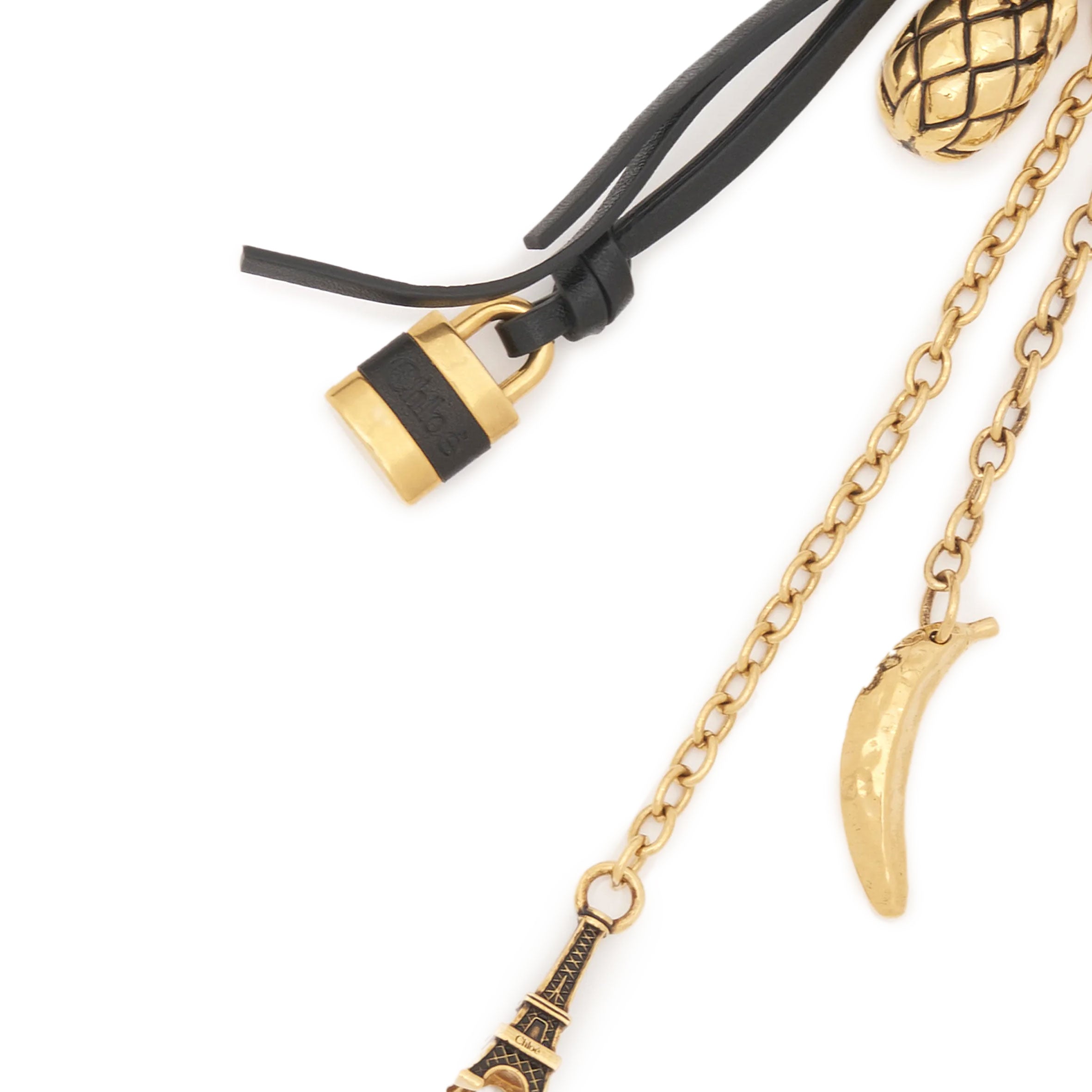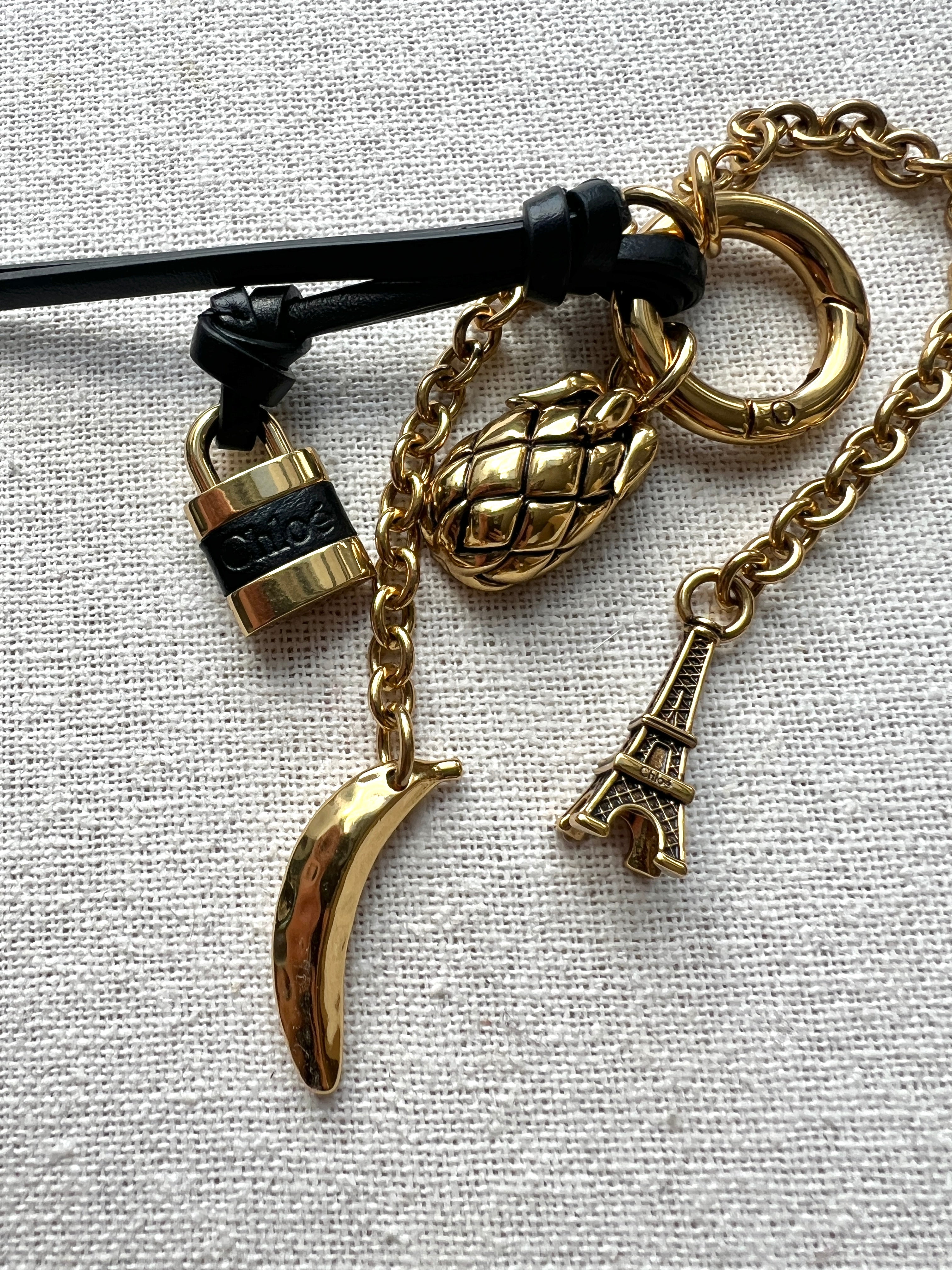 Crafted from brass and calfskin, this Miniatures bag charm features dangling chains and multiple pendants inspired by the Maison's heritage.