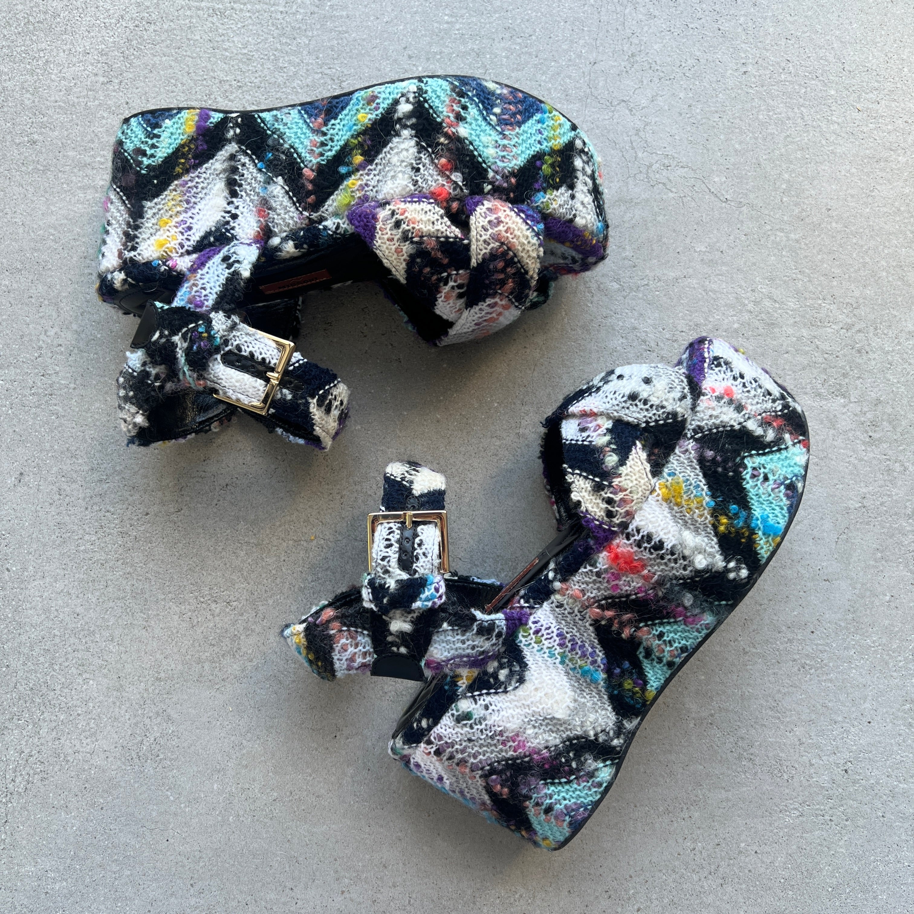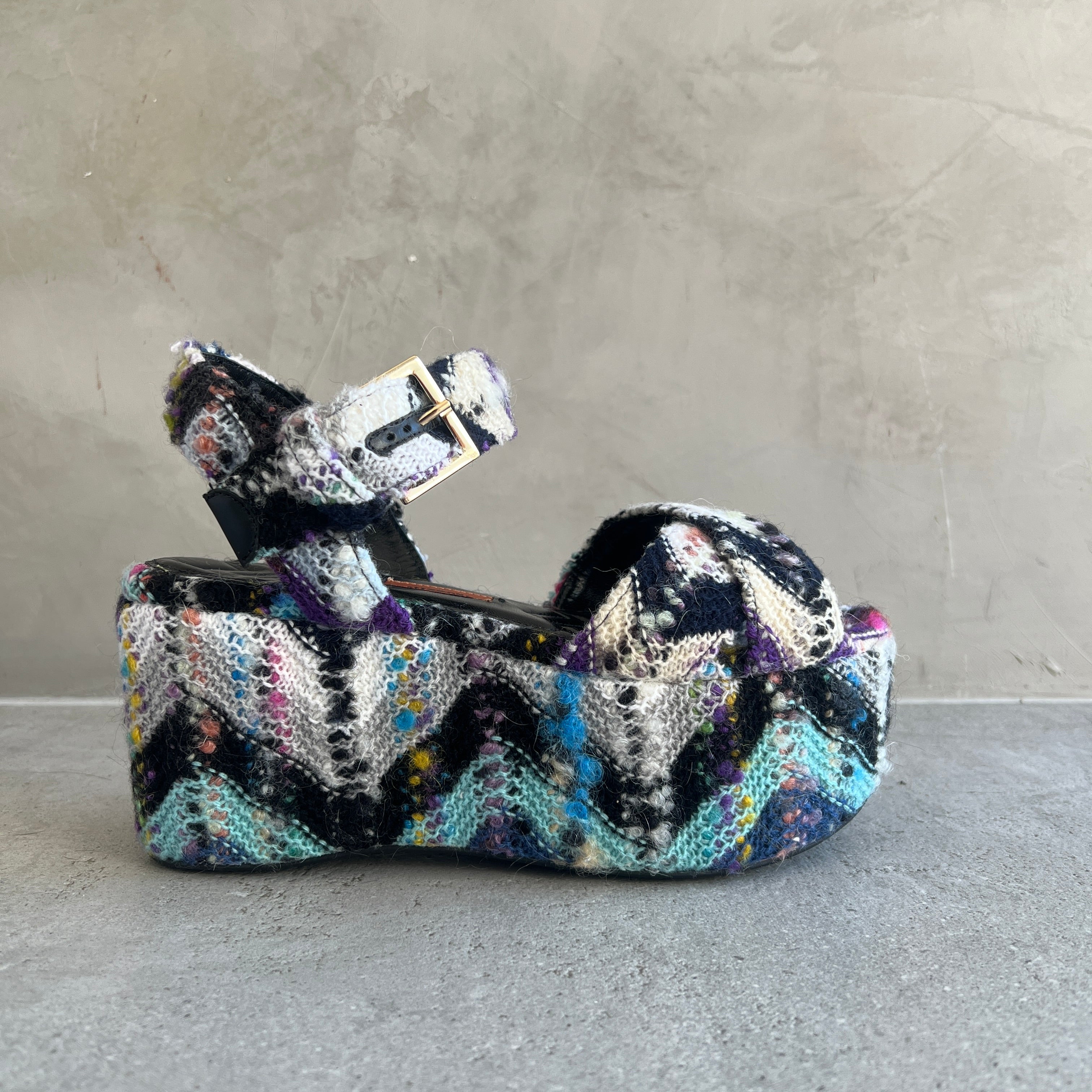 The Julia platform wedge features the signature Missoni wave pattern in mohair.