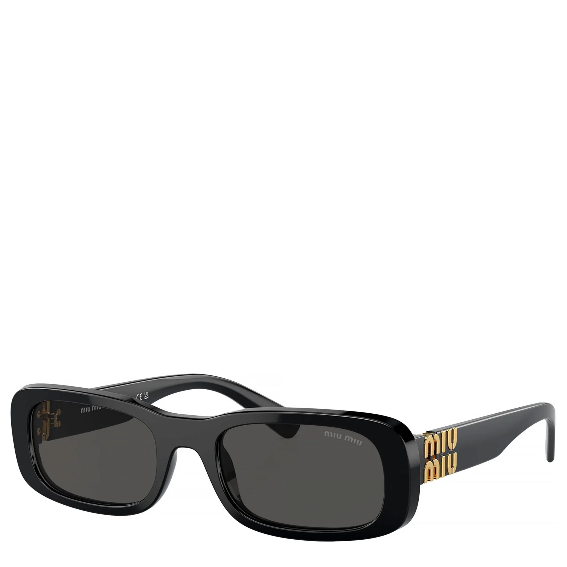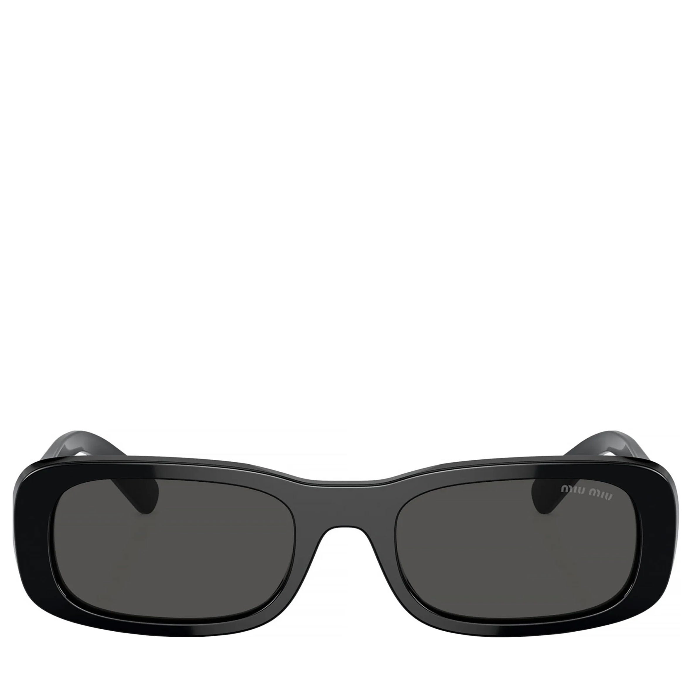 Miu Miu Irreverently Sophisticated sunglasses collection model MU 08ZS black full rim rectangle acetate frame with dark grey lenses.