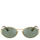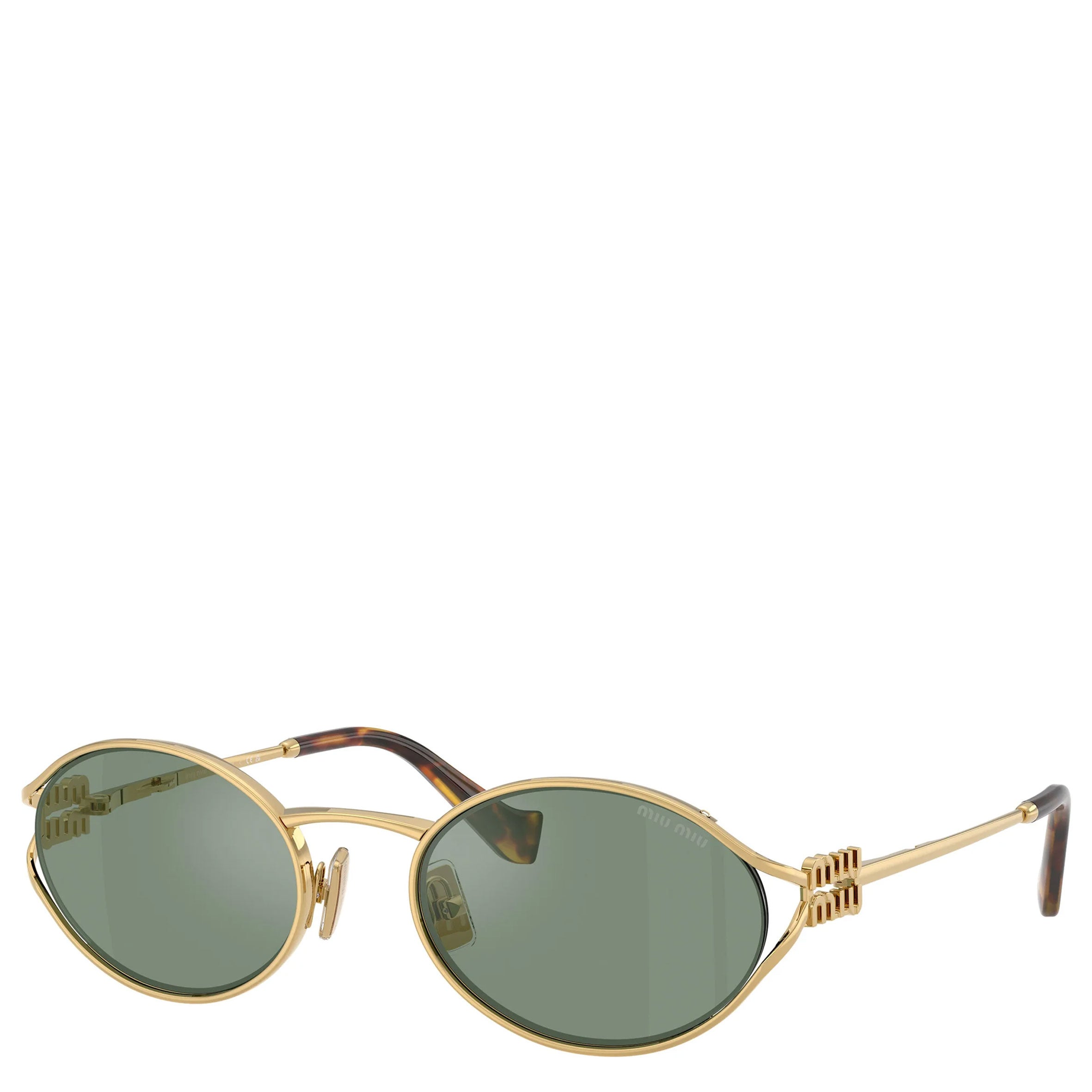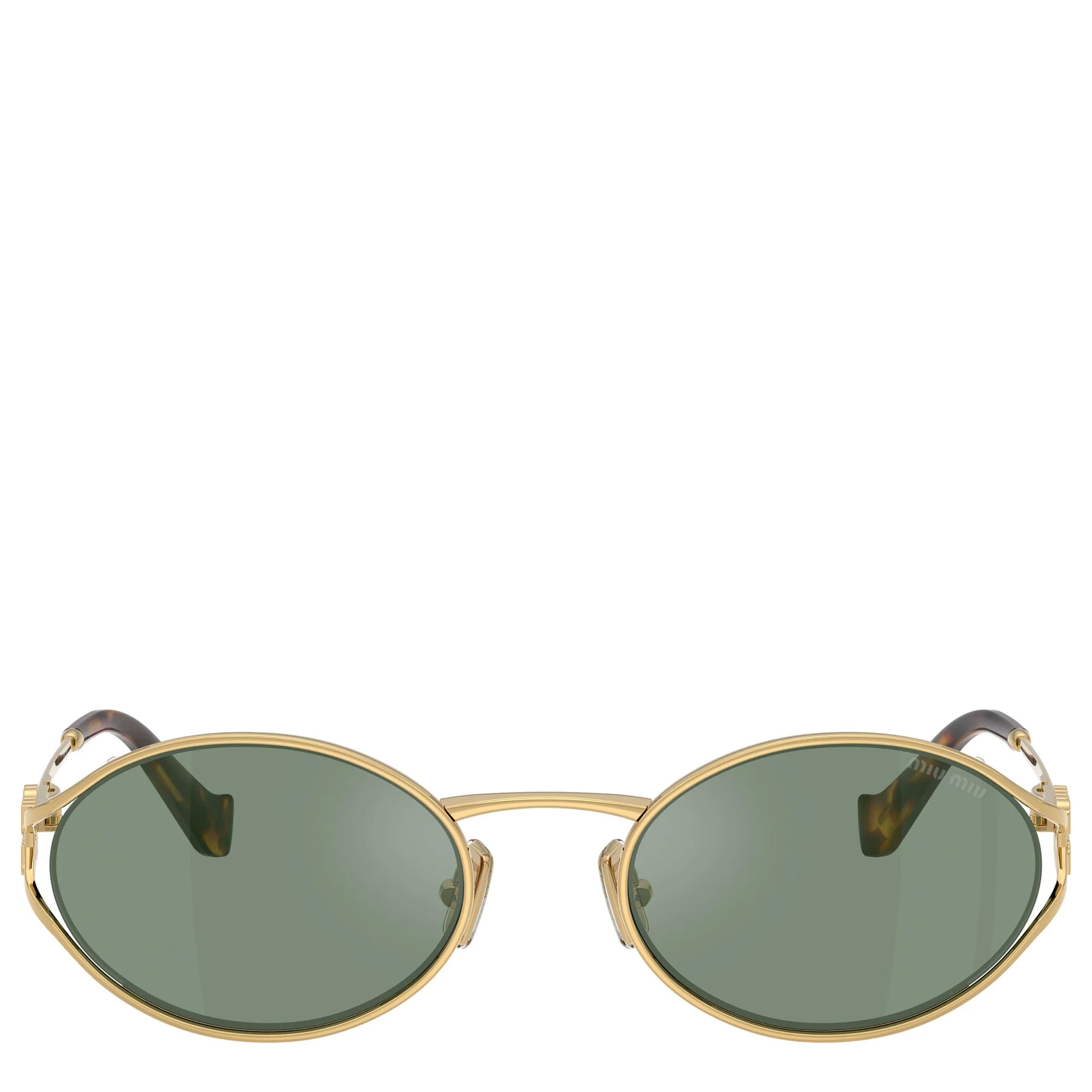 Miu Miu sunglasses model MU 52YS featuring gold full rim metal frame and green mirror lenses.