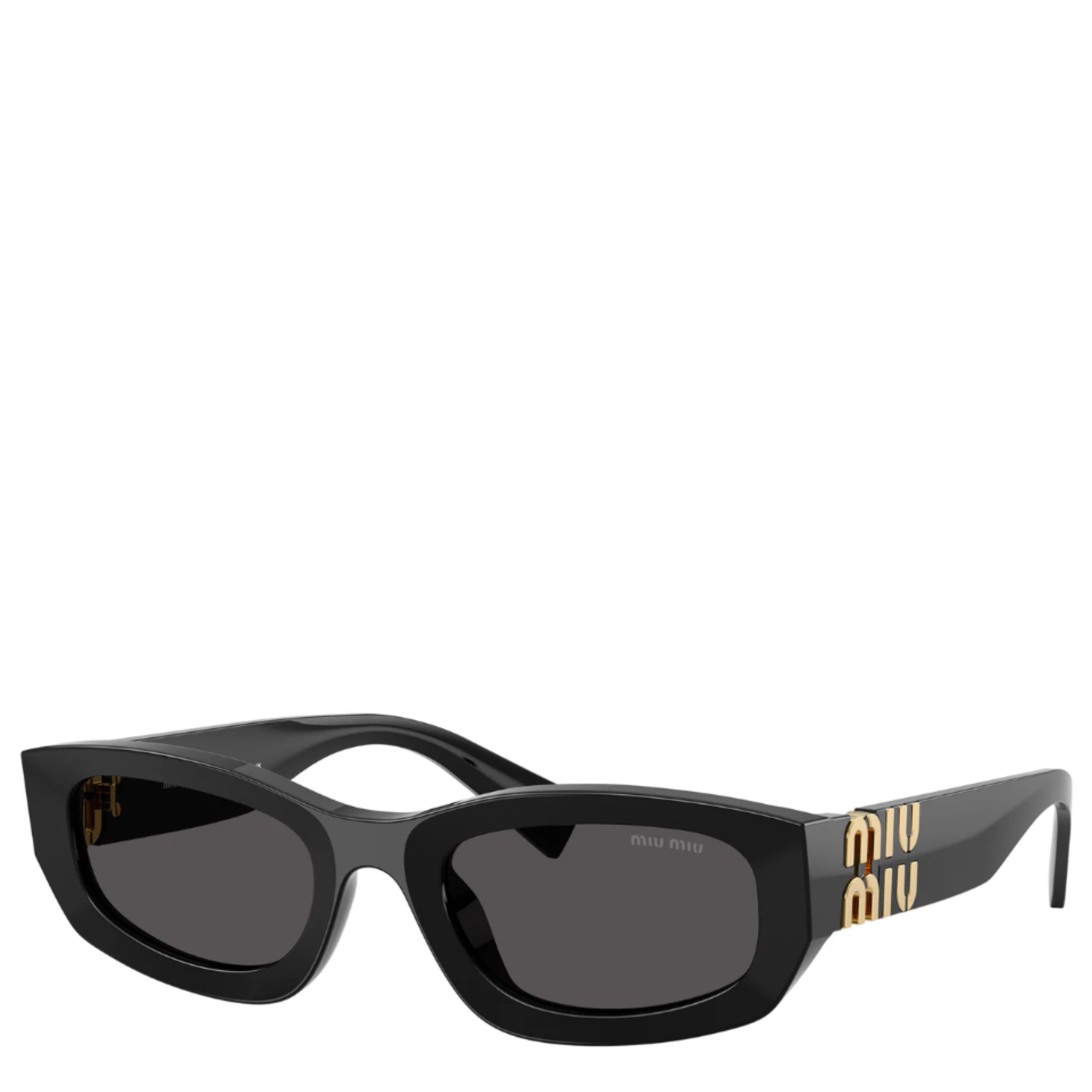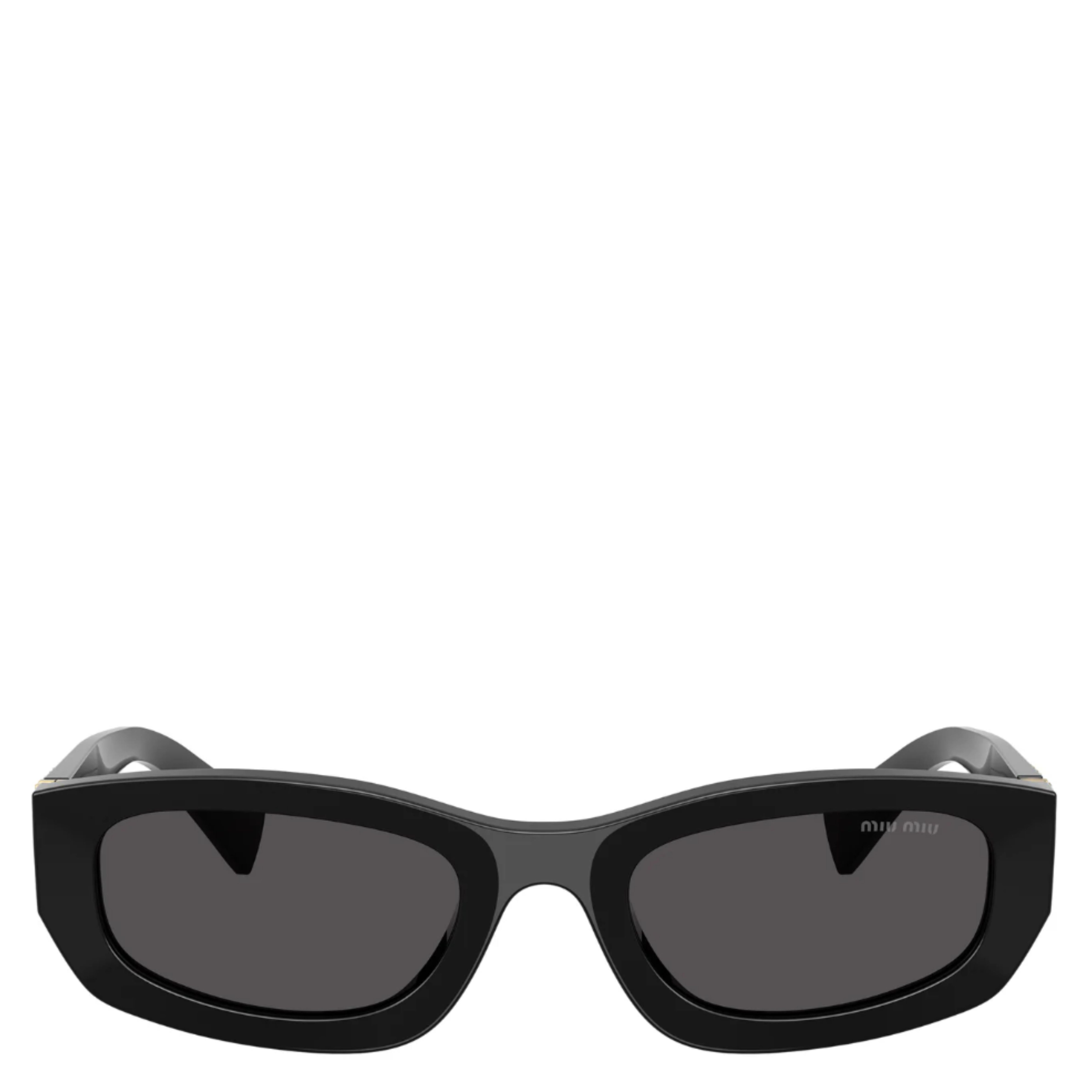 The Miu Glimpse sunglasses feature a geometric design and bold volumes. The oversized acetate frame showcases striking profiles, accented by the iconic vertical Miu Miu logo integrated into the hinge of the thick temples.