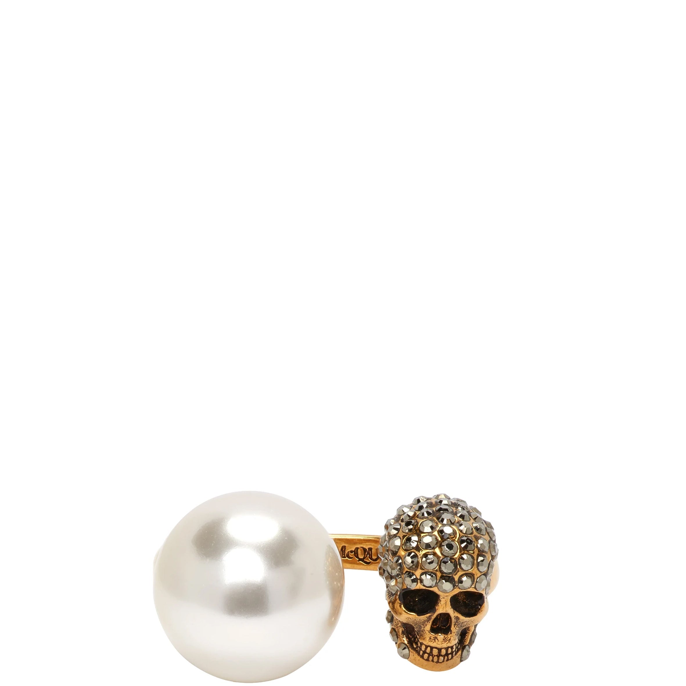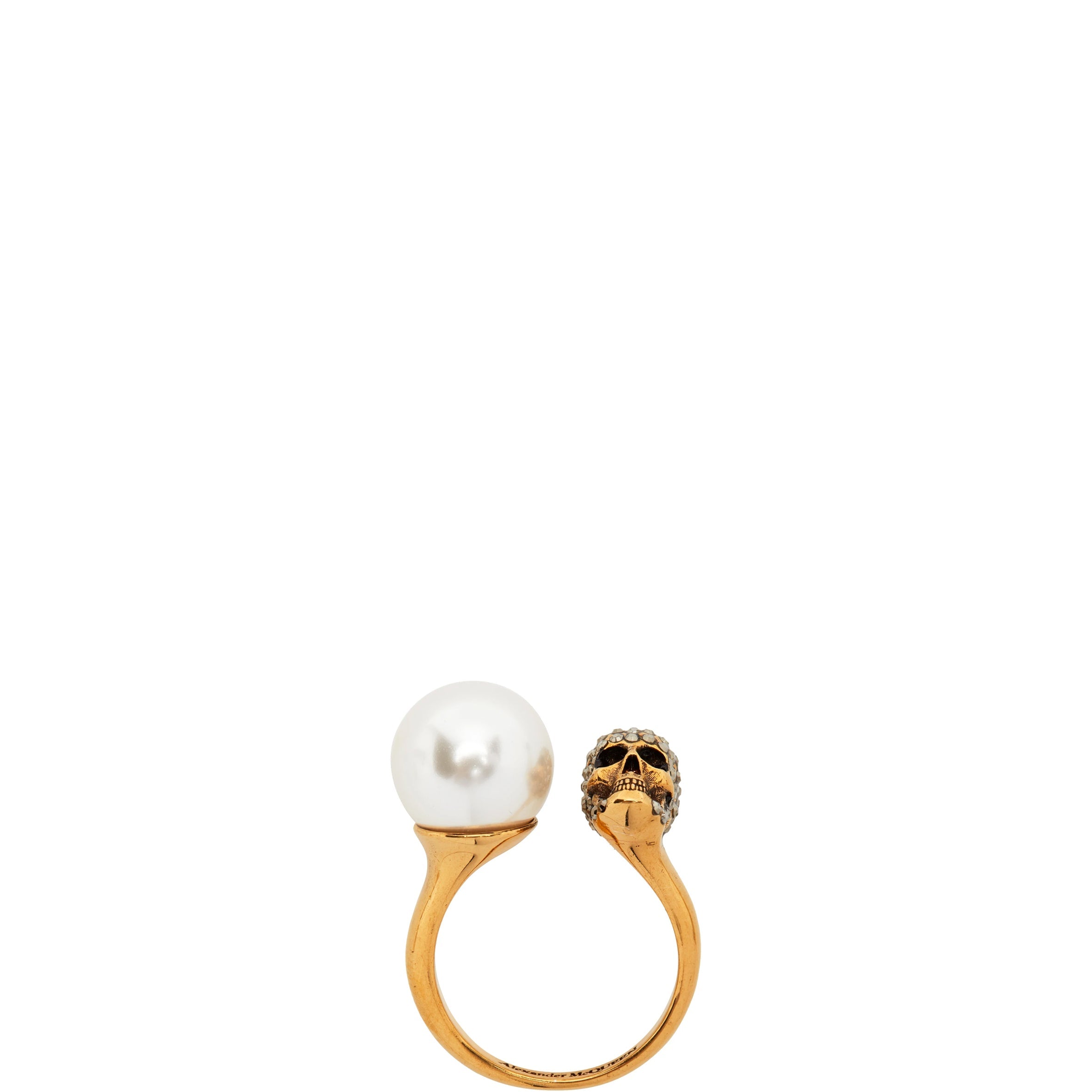 Brass ring in gold-tone. Faux-pearl and skull with signature Swarovski crystal-cut detailing at opening. Logo engraved at inner band.