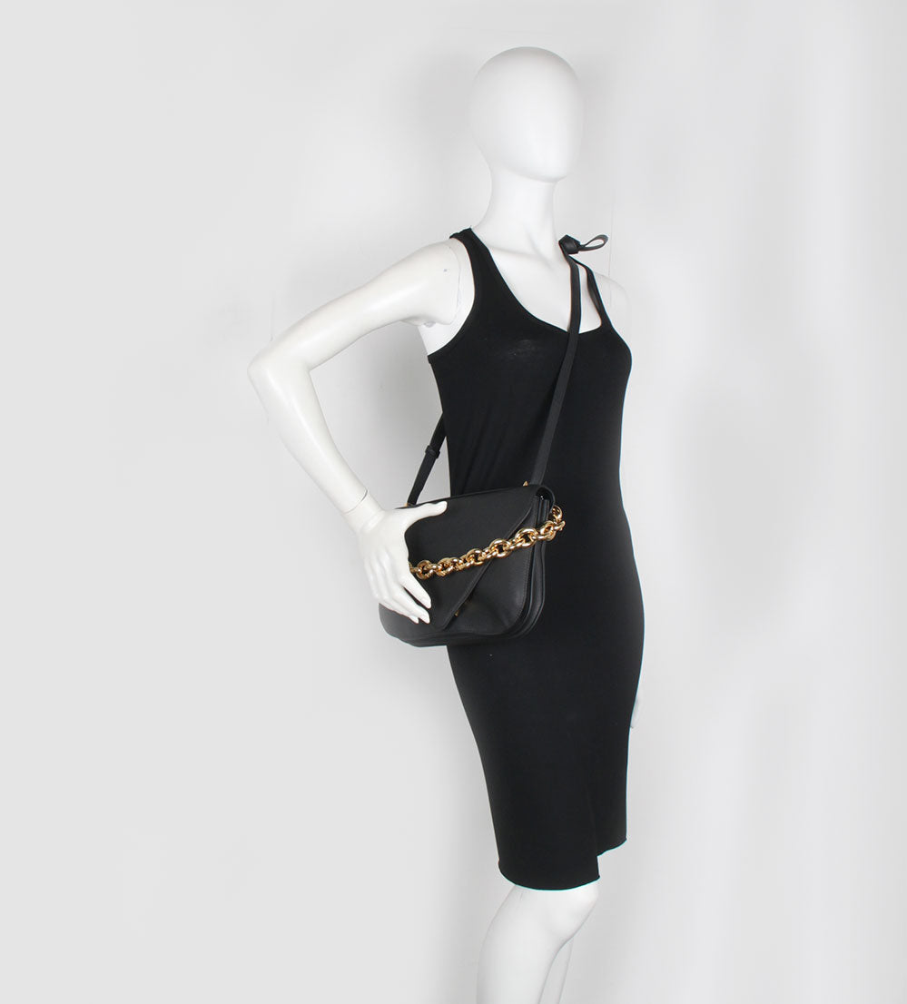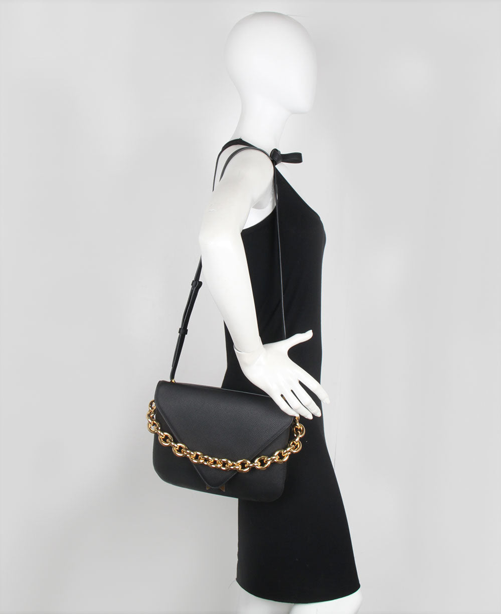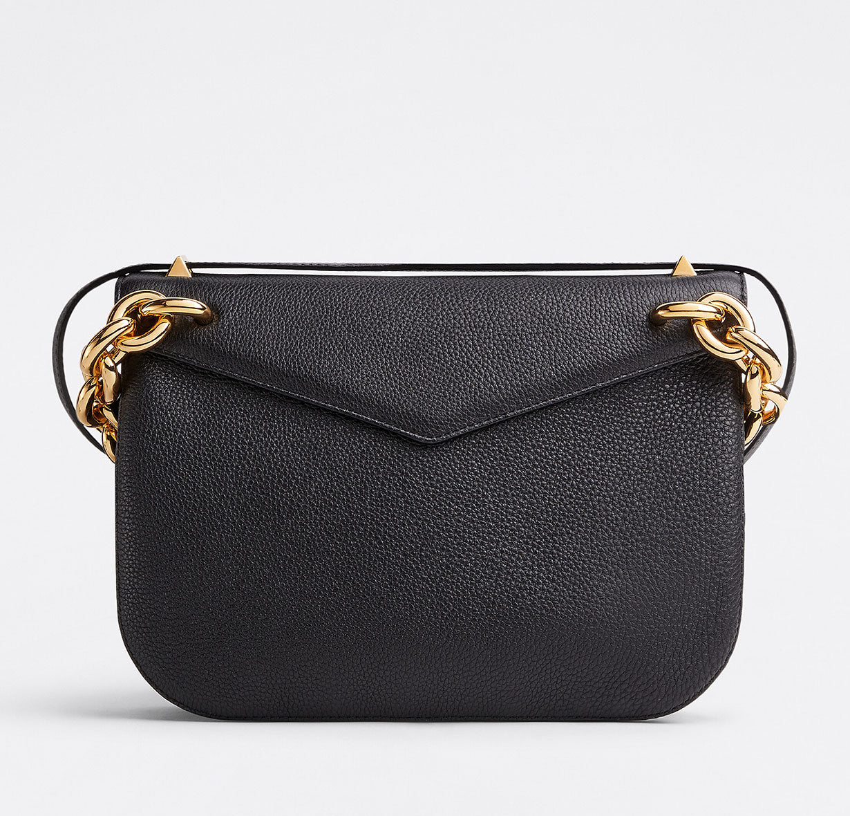 Bottega Veneta uses "V" shaped design details to reference its name in the Mount bag. Crafted from Grained leather, the bag features a triangular top flap and chunky gold chain-link handle which can be worn with either the leather shoulder strap or the golden chain. Features and internal zip pocket. metal closure and detachable leather shoulder strap.
