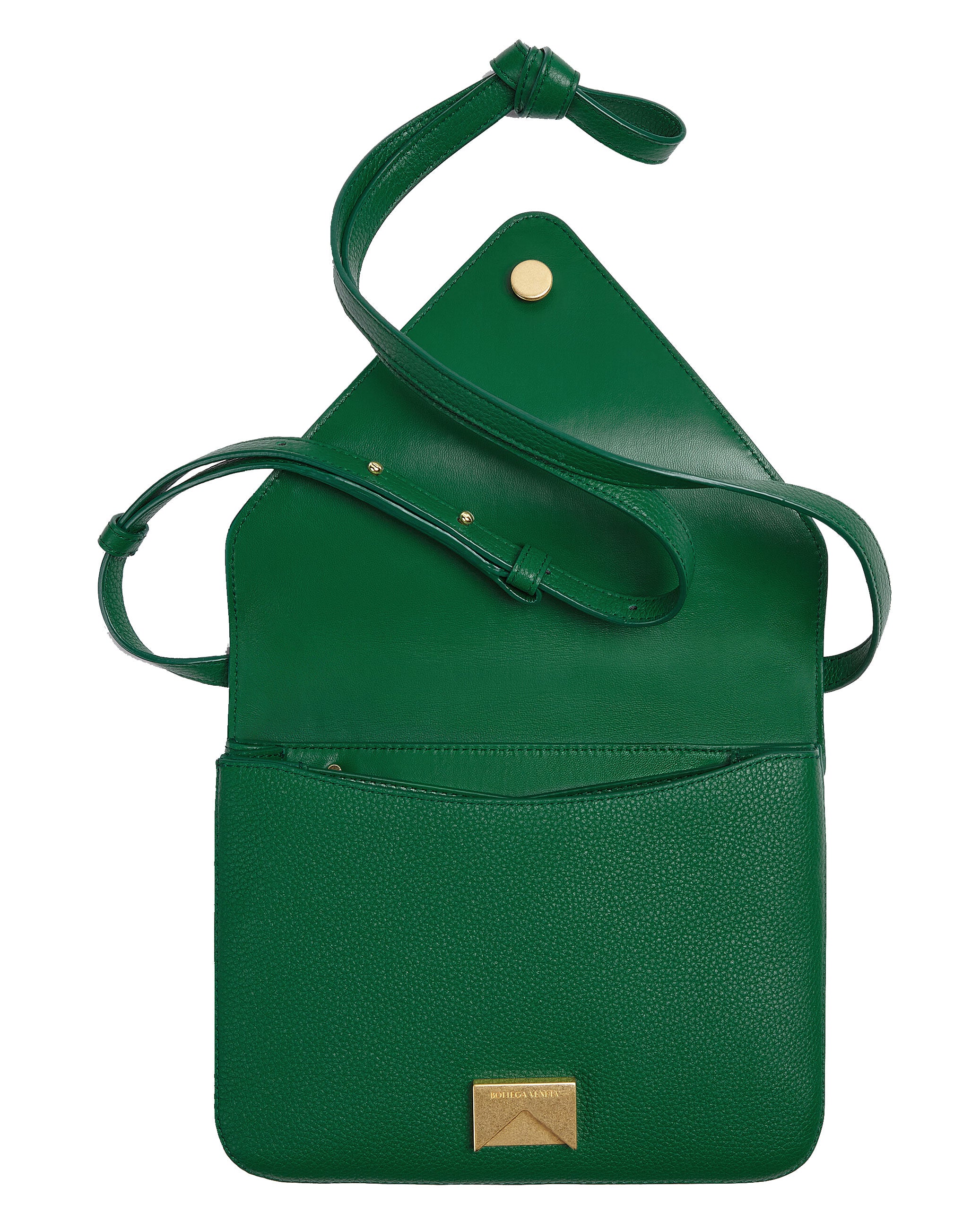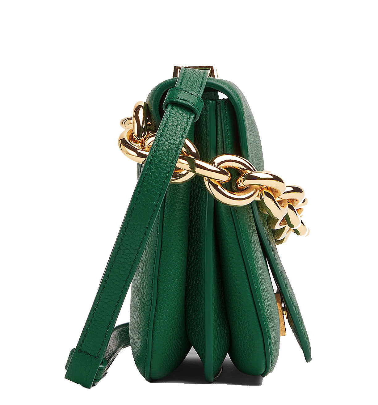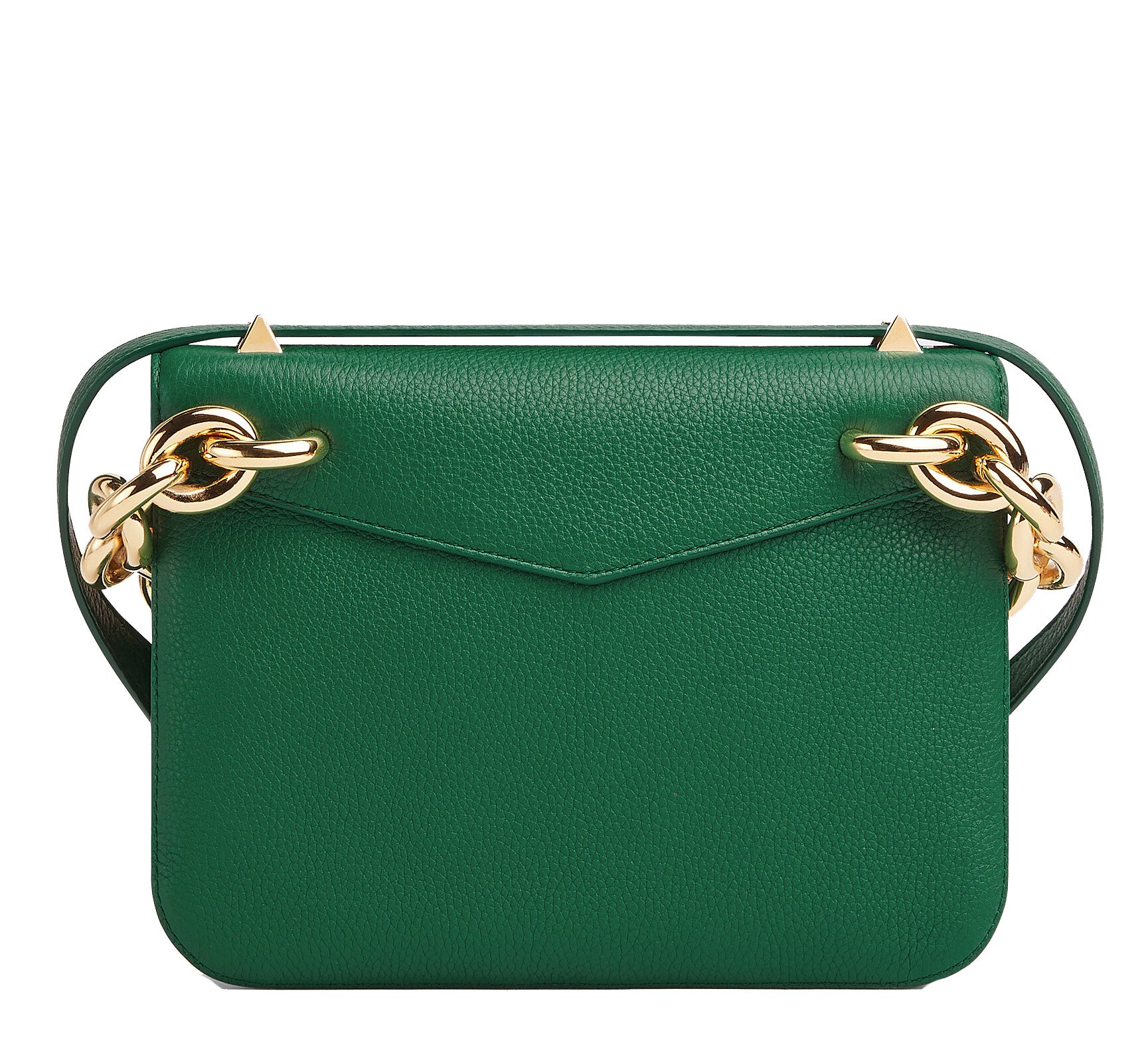 Bottega Veneta uses "V" shaped design details to reference its name in the Mount bag. Crafted from Emerald Green Suede, the bag features a triangular top flap and chunky gold chain-link handle which can be worn with either the leather shoulder strap or the golden chain. Features and internal zip pocket. metal closure and detachable leather shoulder strap.