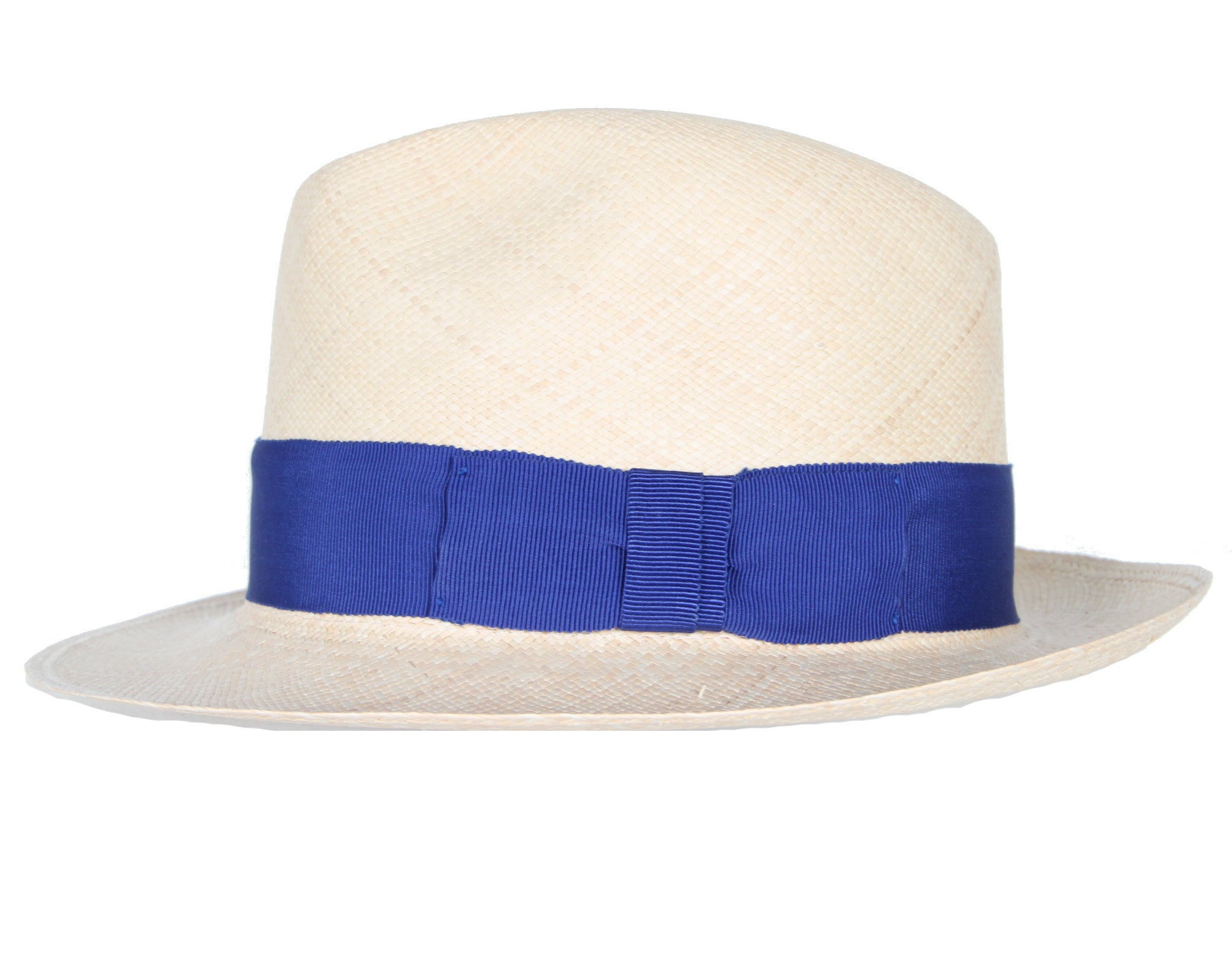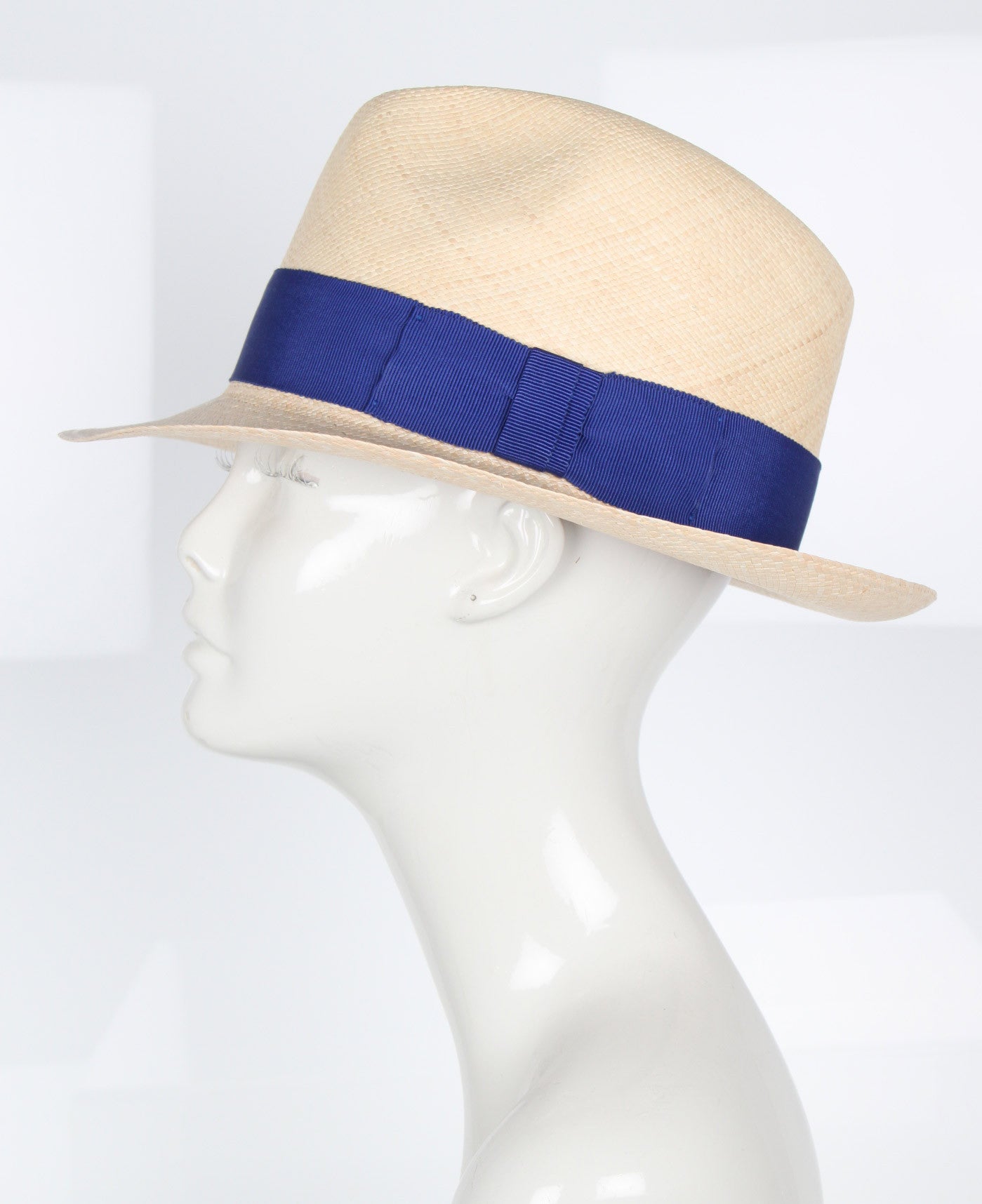 This item is only available in store. Natural "Fedora" straw hat with a blue ribbon. Comes with short red "B" hat pin. Made in Ecuador.