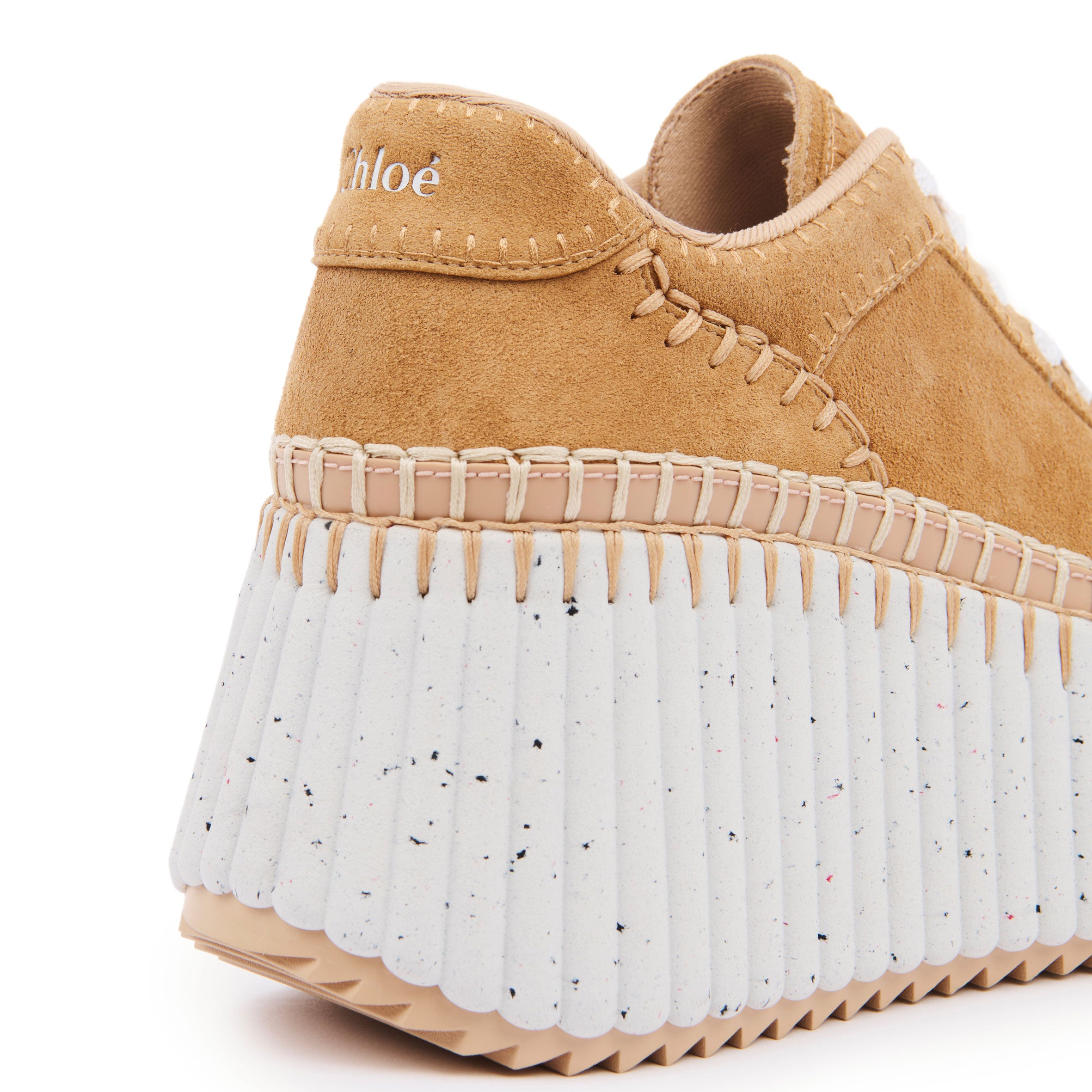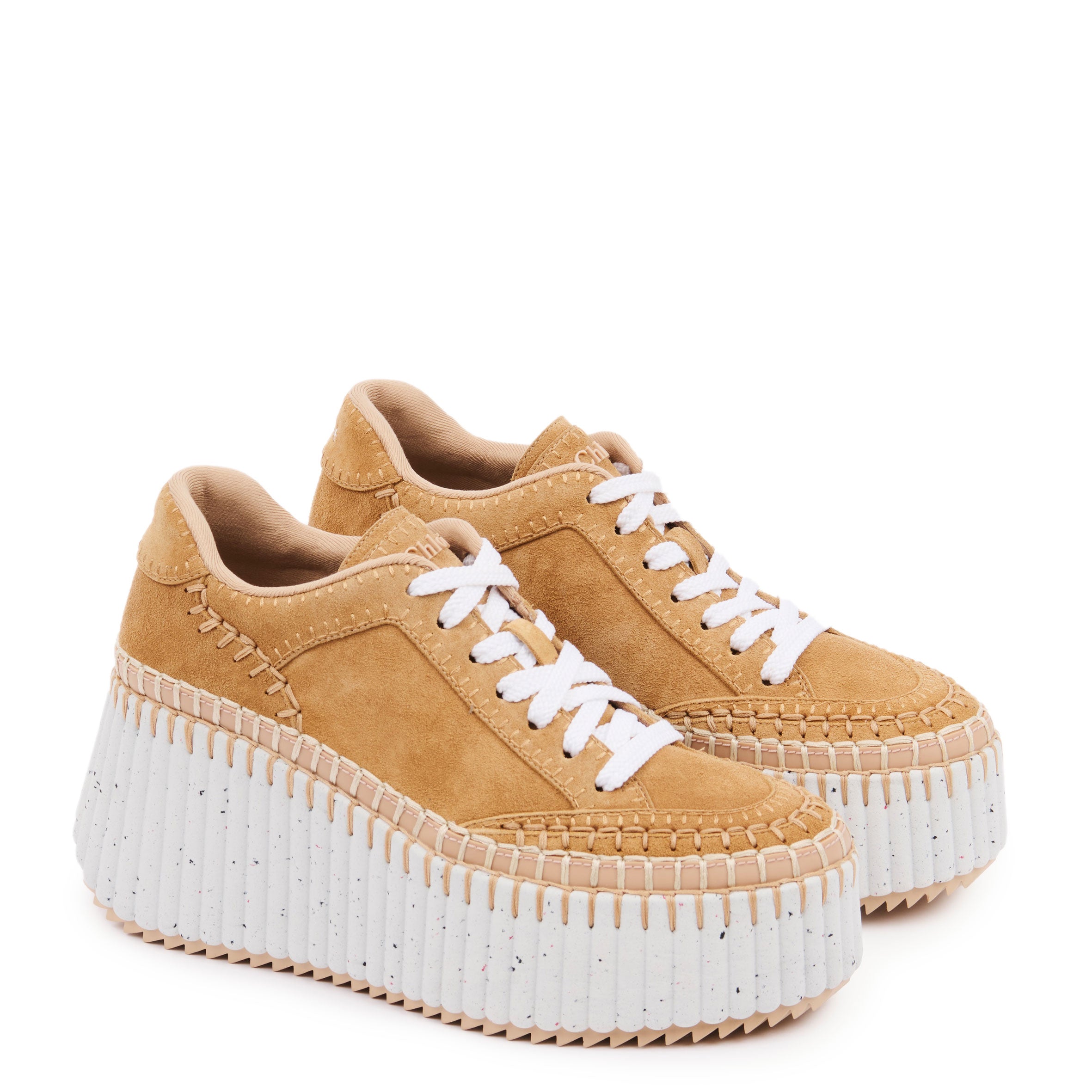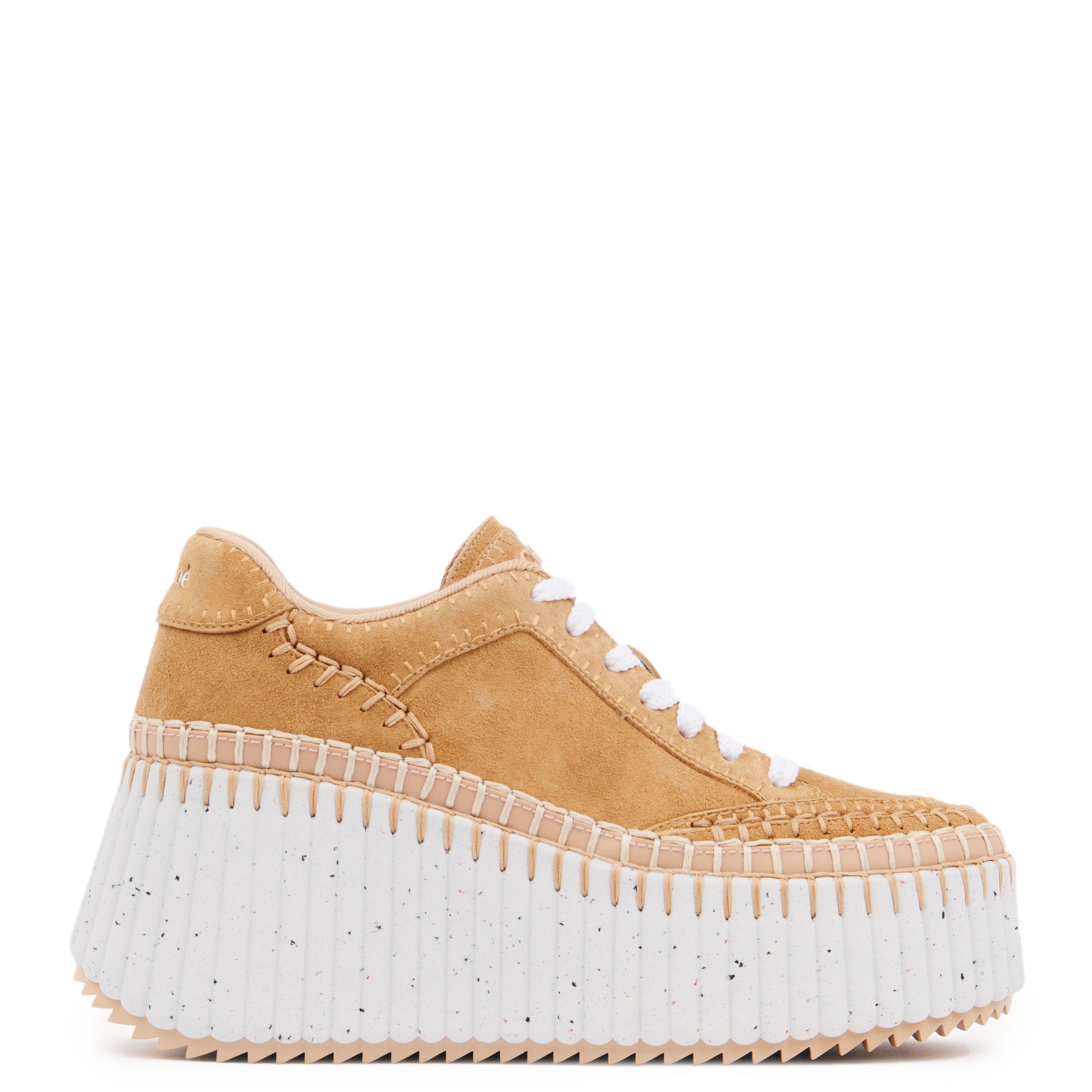 Crafted from smooth and suede cowhide, these Nama wedge sneakers are set on an iconic, lightweight and ultra-comfortable recycled sole with a speckled effect. They are finished with immaculate blanket stitching which takes 4.5 hours to complete by hand. A 3D rubber Chloé logo signs the tongue while a debossed logo finishes the back.