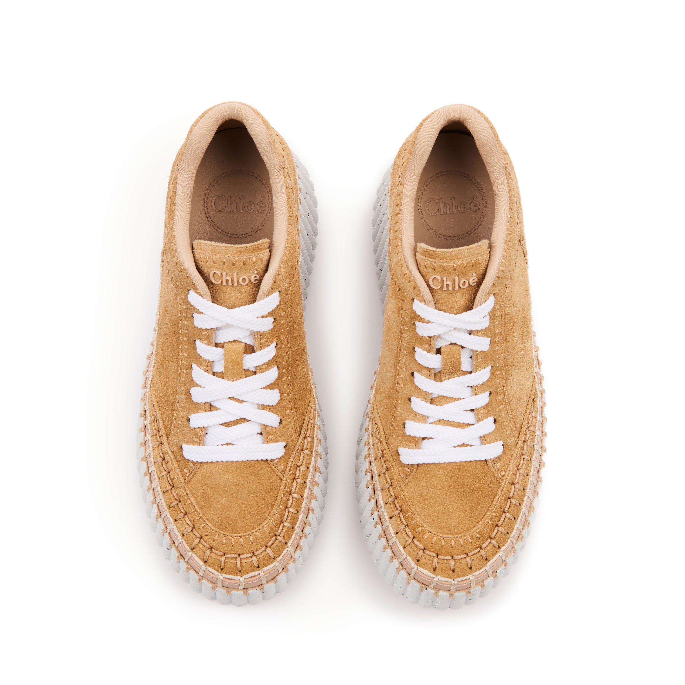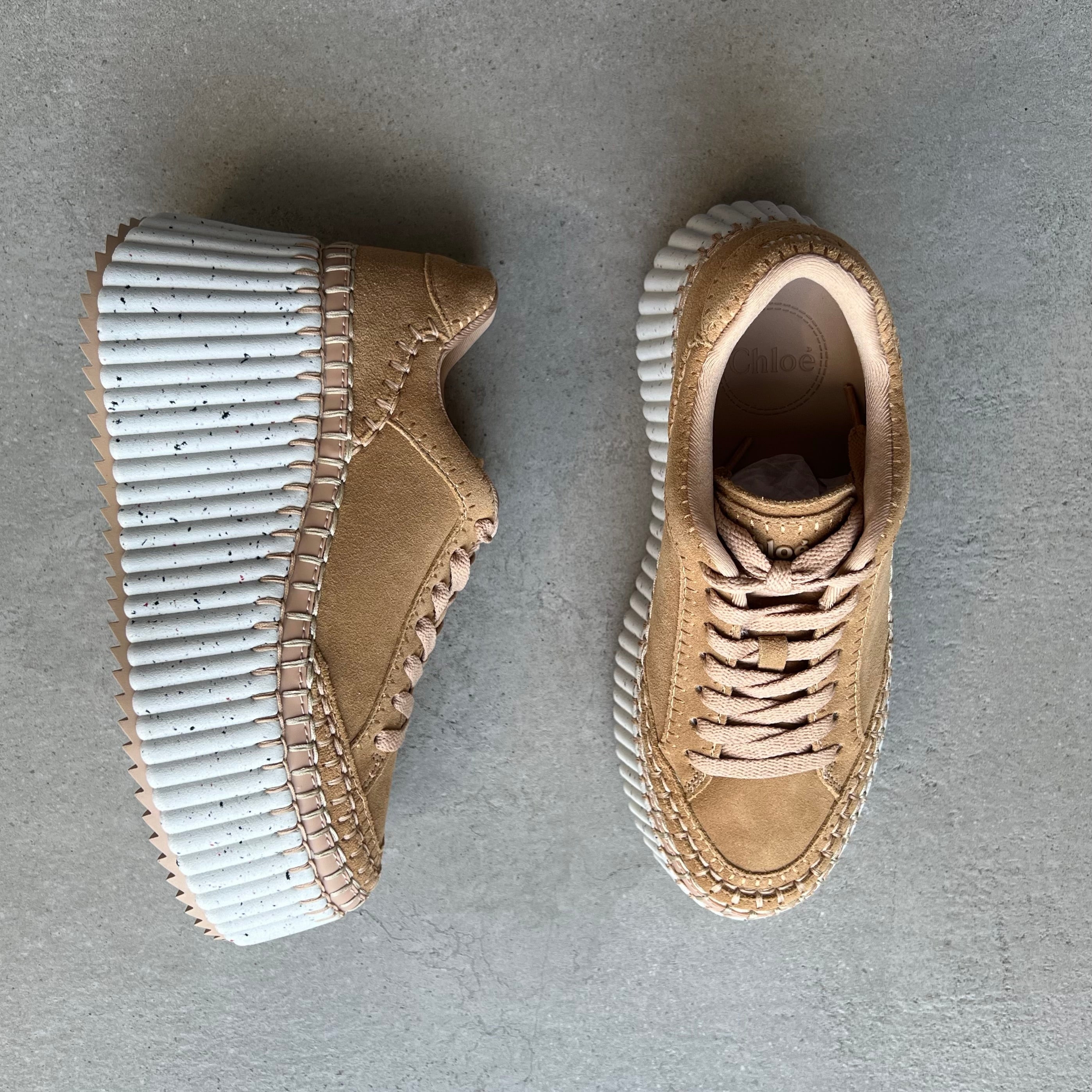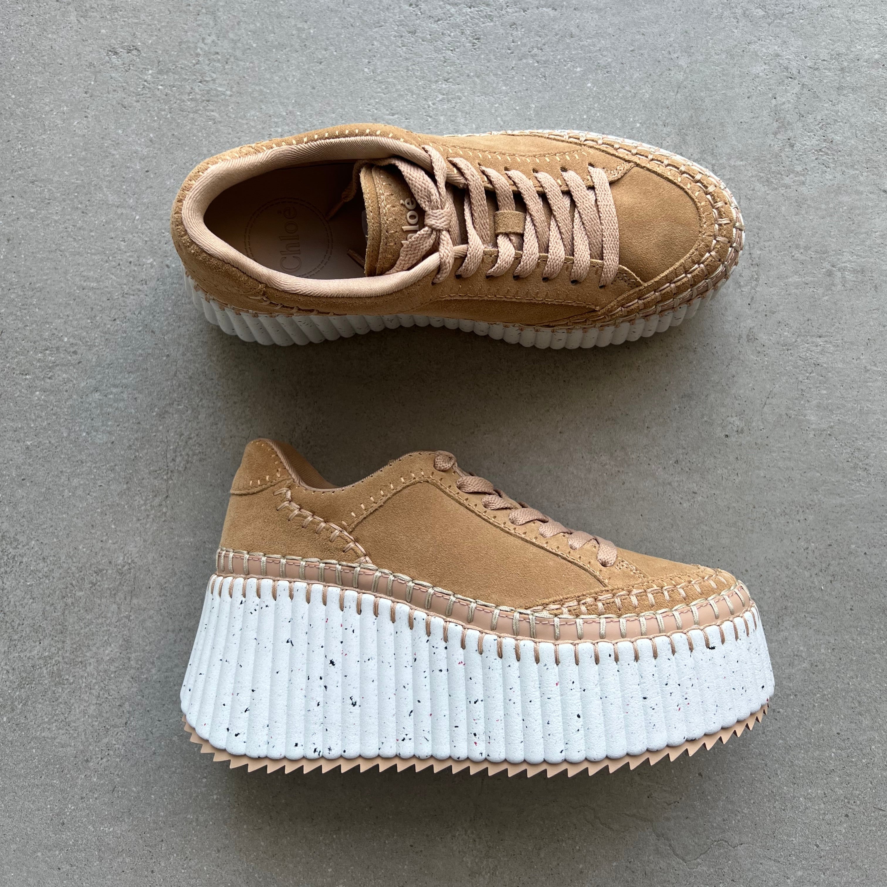 Crafted from smooth and suede cowhide, these Nama wedge sneakers are set on an iconic, lightweight and ultra-comfortable recycled sole with a speckled effect. They are finished with immaculate blanket stitching which takes 4.5 hours to complete by hand. A 3D rubber Chloé logo signs the tongue while a debossed logo finishes the back.