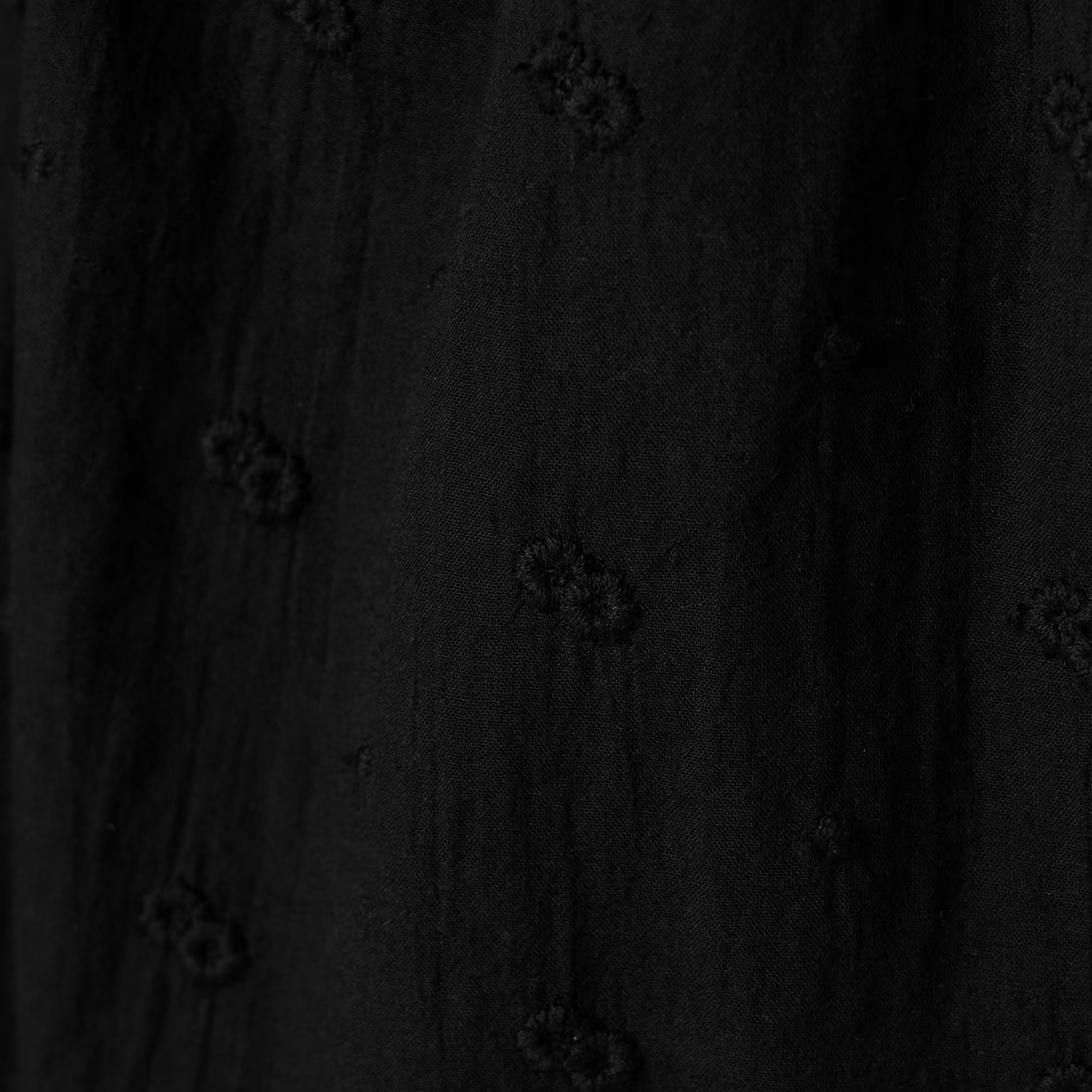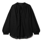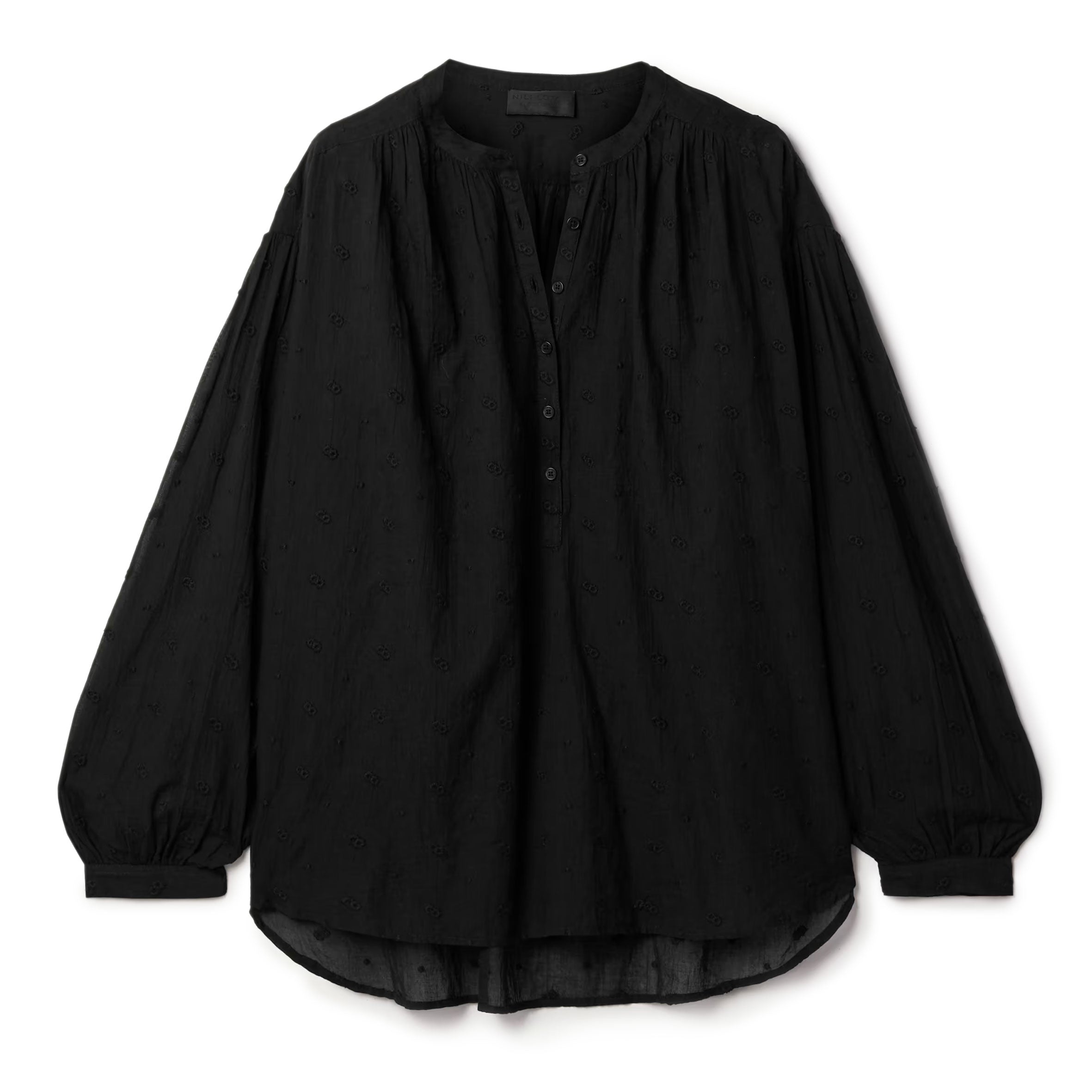 Voluminous pullover blouse in Indian embroidered voile. Mandarin collar. Dropped shoulder. Shirring at shoulder, sleeve cap and sleeve. Shirttail detailing. Troka buttons. Slightly longer in the back.