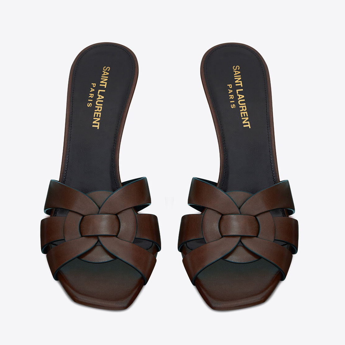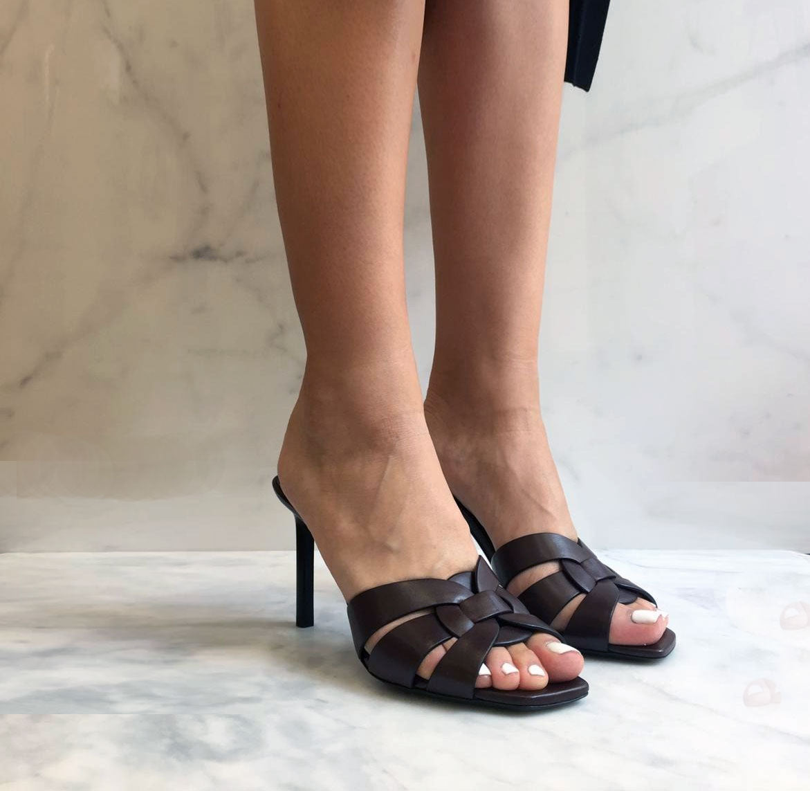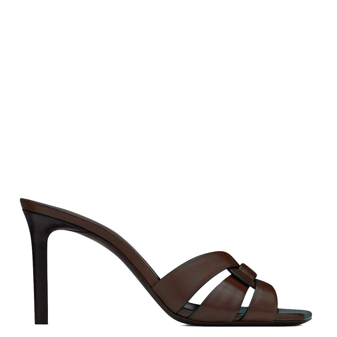 Tribute heeled mules in smooth leather. Open toe with intertwining straps, a squared toe and stiletto heel. Comfortable 85mm heel height.