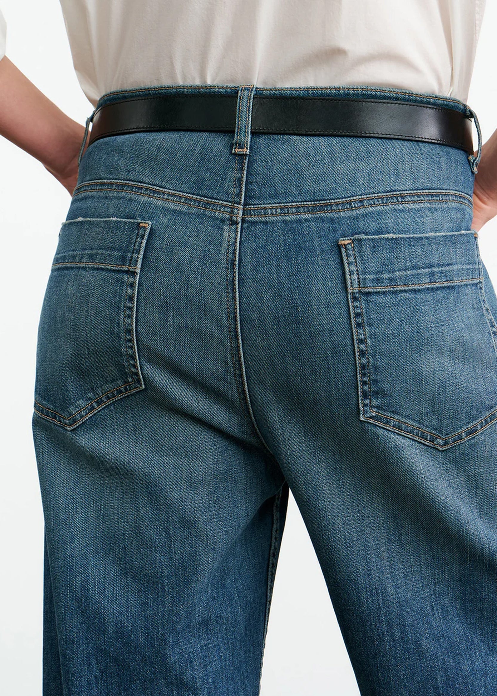 Relaxed mid-rise fit with a softly curved silhouette. Zip fly. Shank closure. Top-stitched front and back patch pockets. Belt loops.