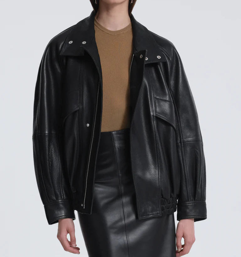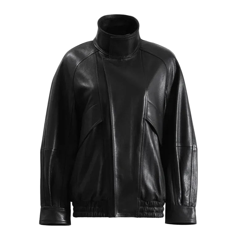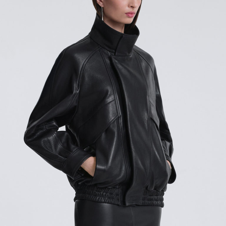 A fluid leather jacket, gracefully enveloping in shape and finish. Defined by a high collar, dropped shoulders, and curved seams. Fastens with zip and button. Softly cinched at hem.
