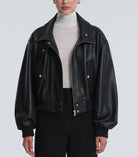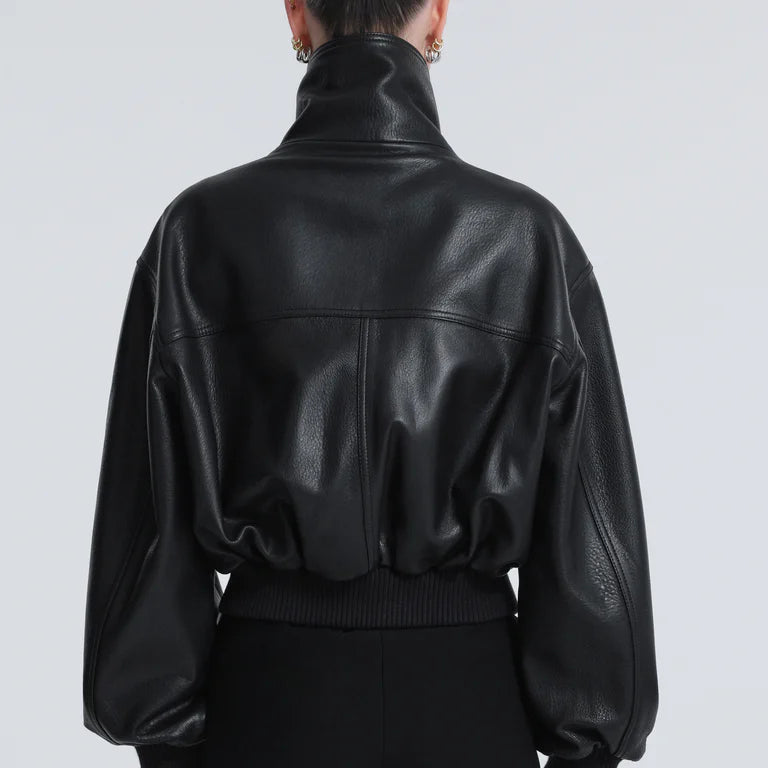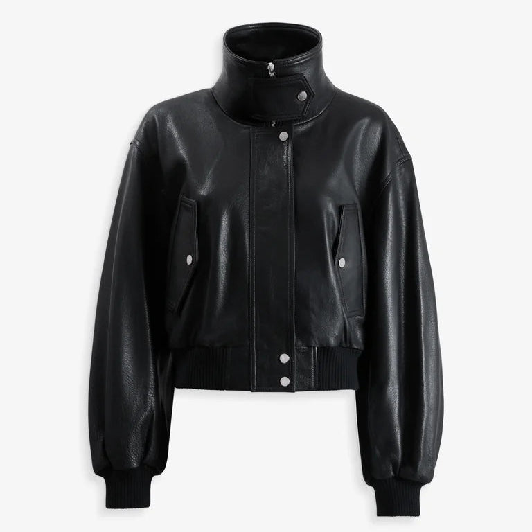 A cropped bomber made in buttery soft lambskin leather. Features a stand collar, elasticated ribbing, and wide, sculptural sleeves. Blending soft structure with everyday ease.