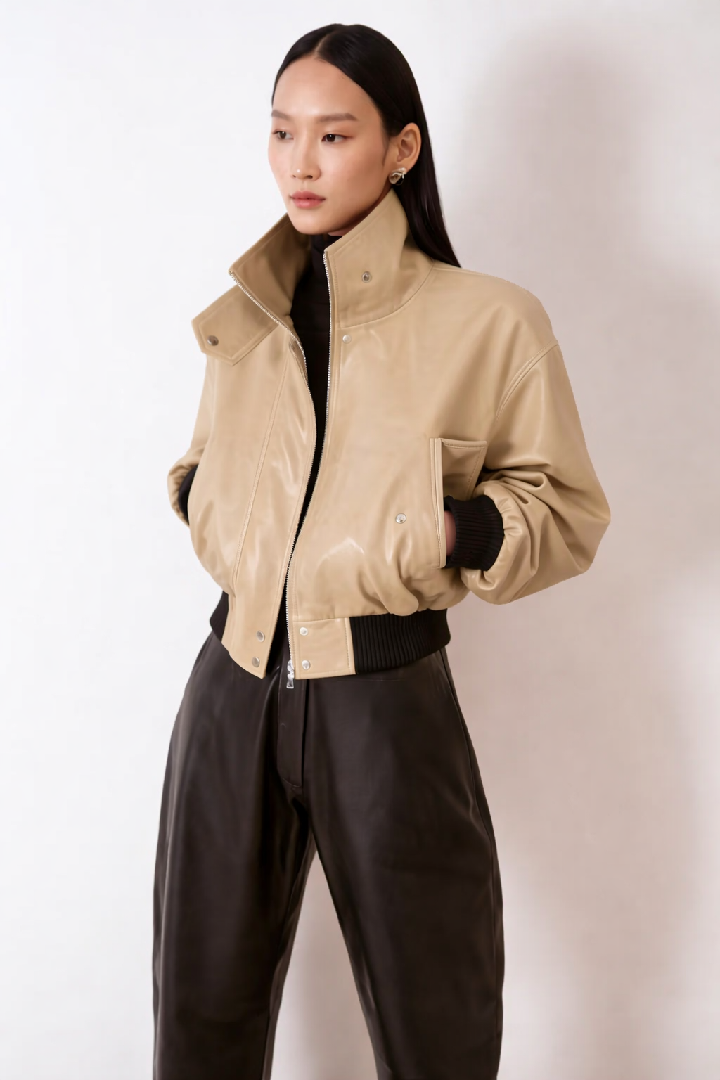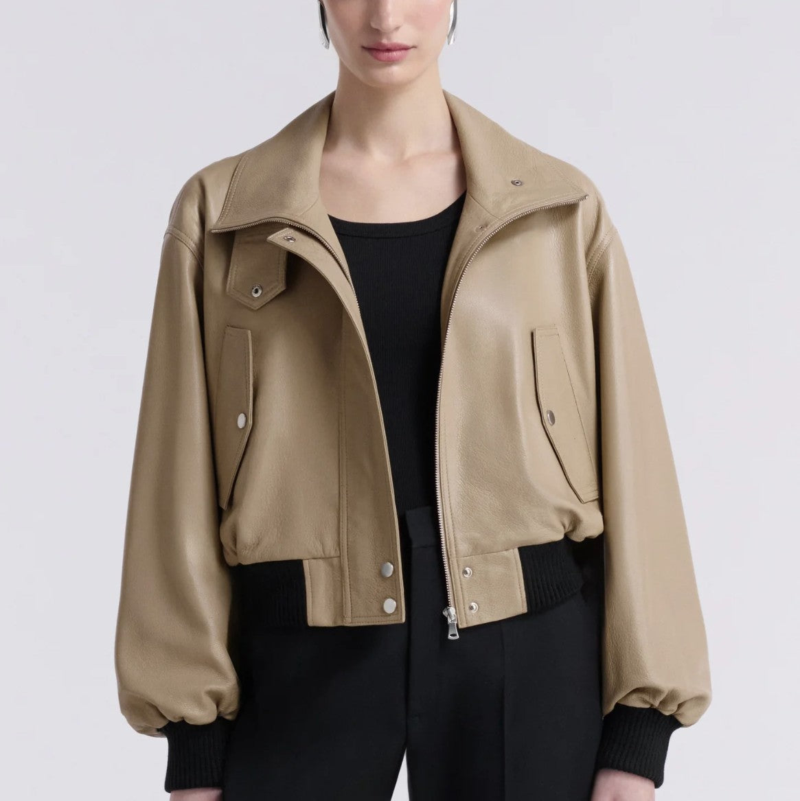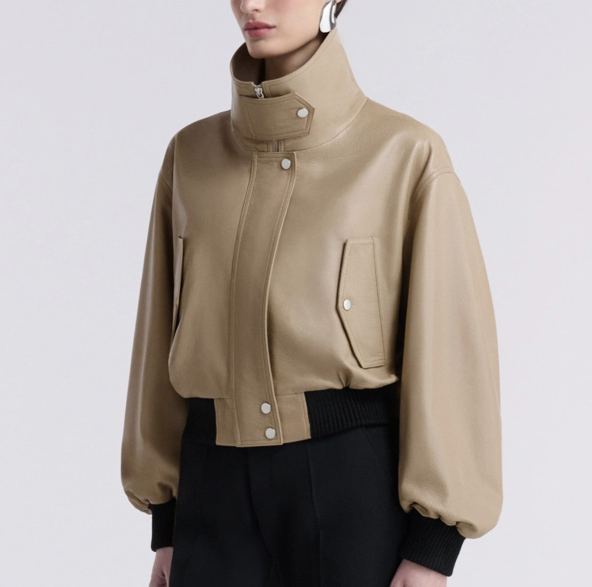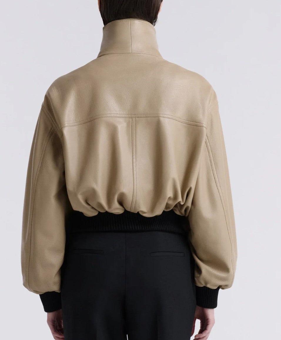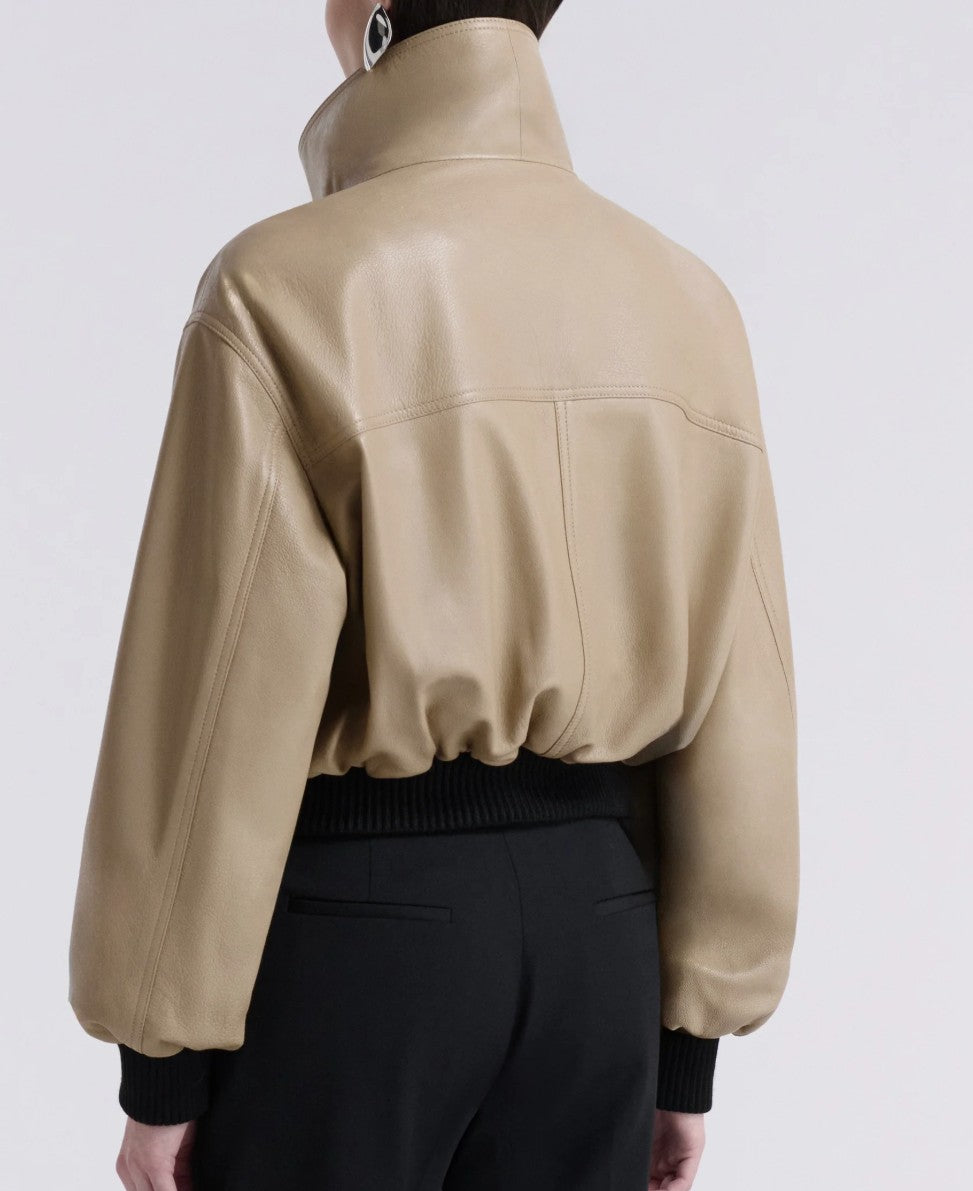 A cropped bomber made in buttery soft lambskin leather. Features a stand collar, elasticated ribbing, and wide, sculptural sleeves. Blending soft structure with everyday ease.