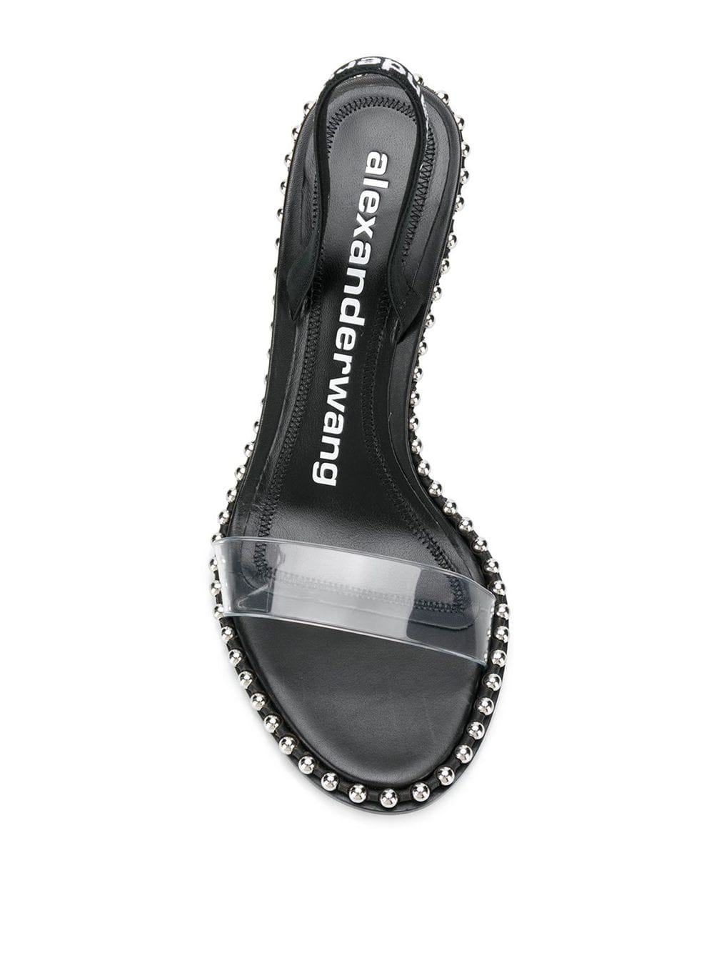 Nova high heel sling-back sandal with metal ball chain trim around sole edge. Leather logo covered elastic back strap and clear front strap. Wrapped leather heel and leather outsole. True to size.