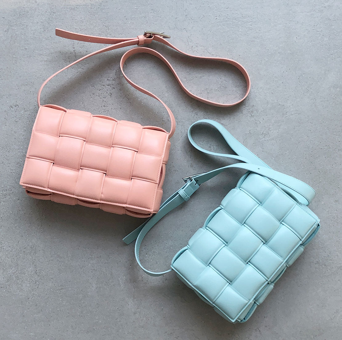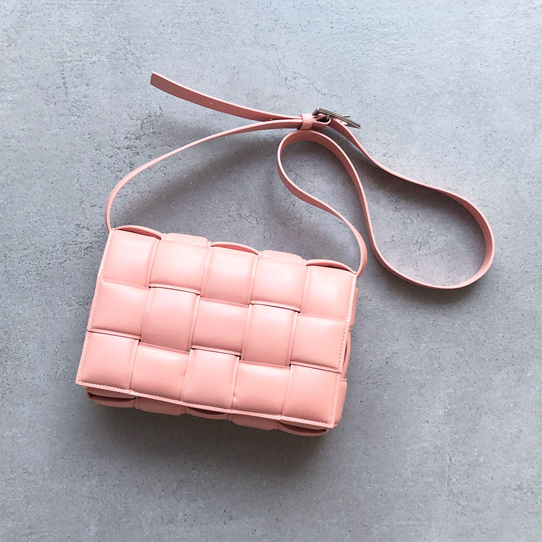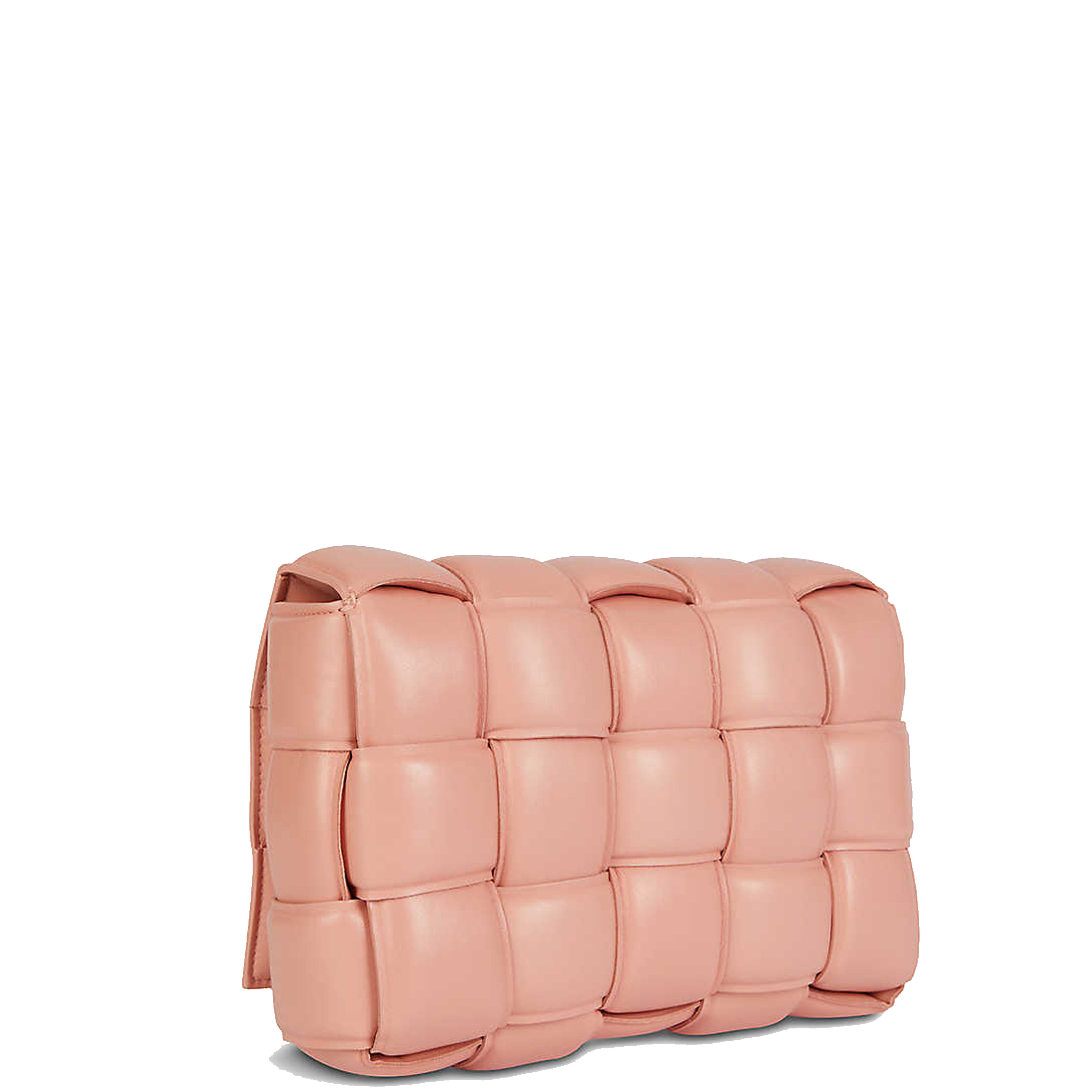 Crossbody bag in a double-face maxi weave. Made with wide double-face Nappa strips in an orthogonal weave. Interior is identical to exterior; fitted with a zipped pocket and magnetic closure. Adjustable shoulder strap folds inside the bag to carry as a clutch.