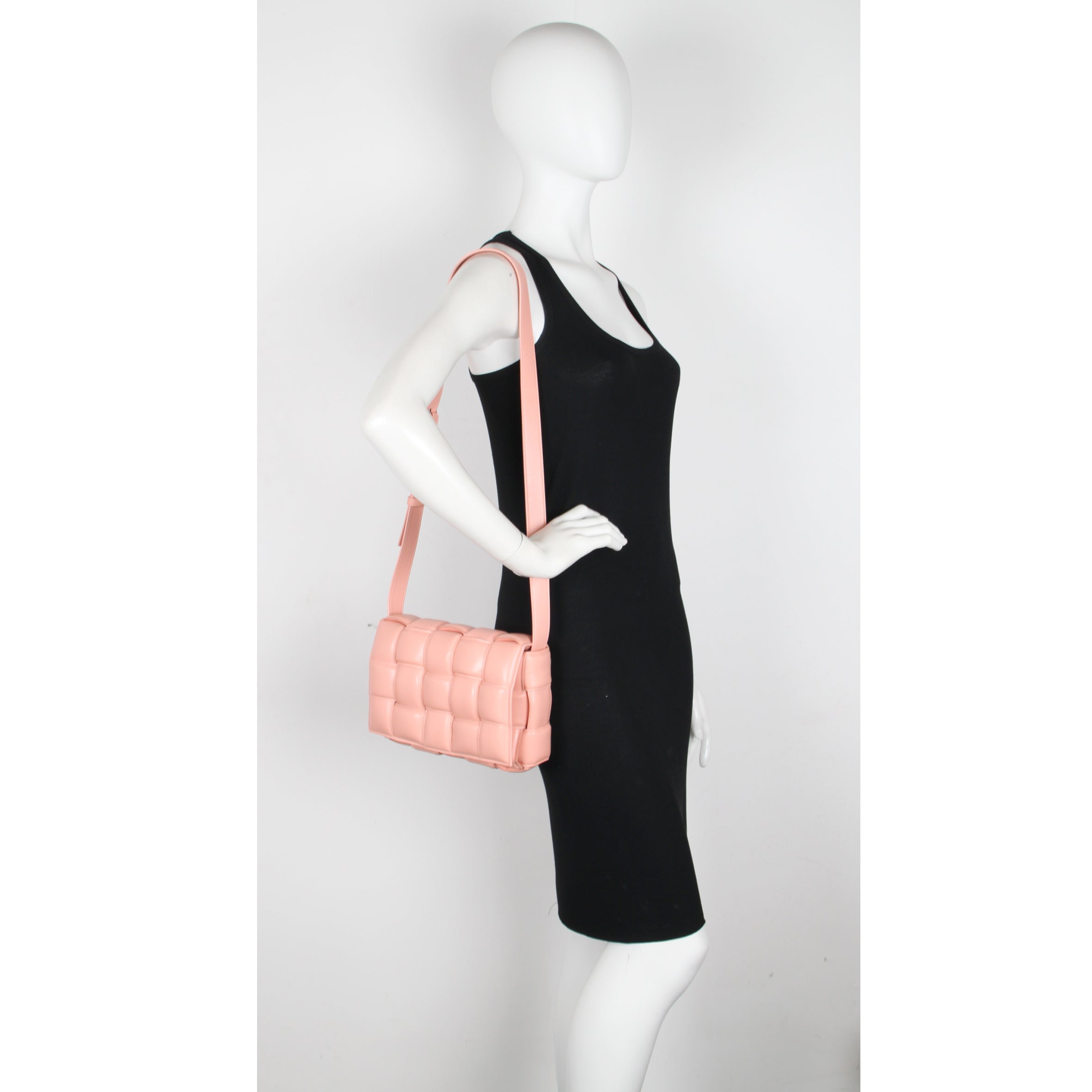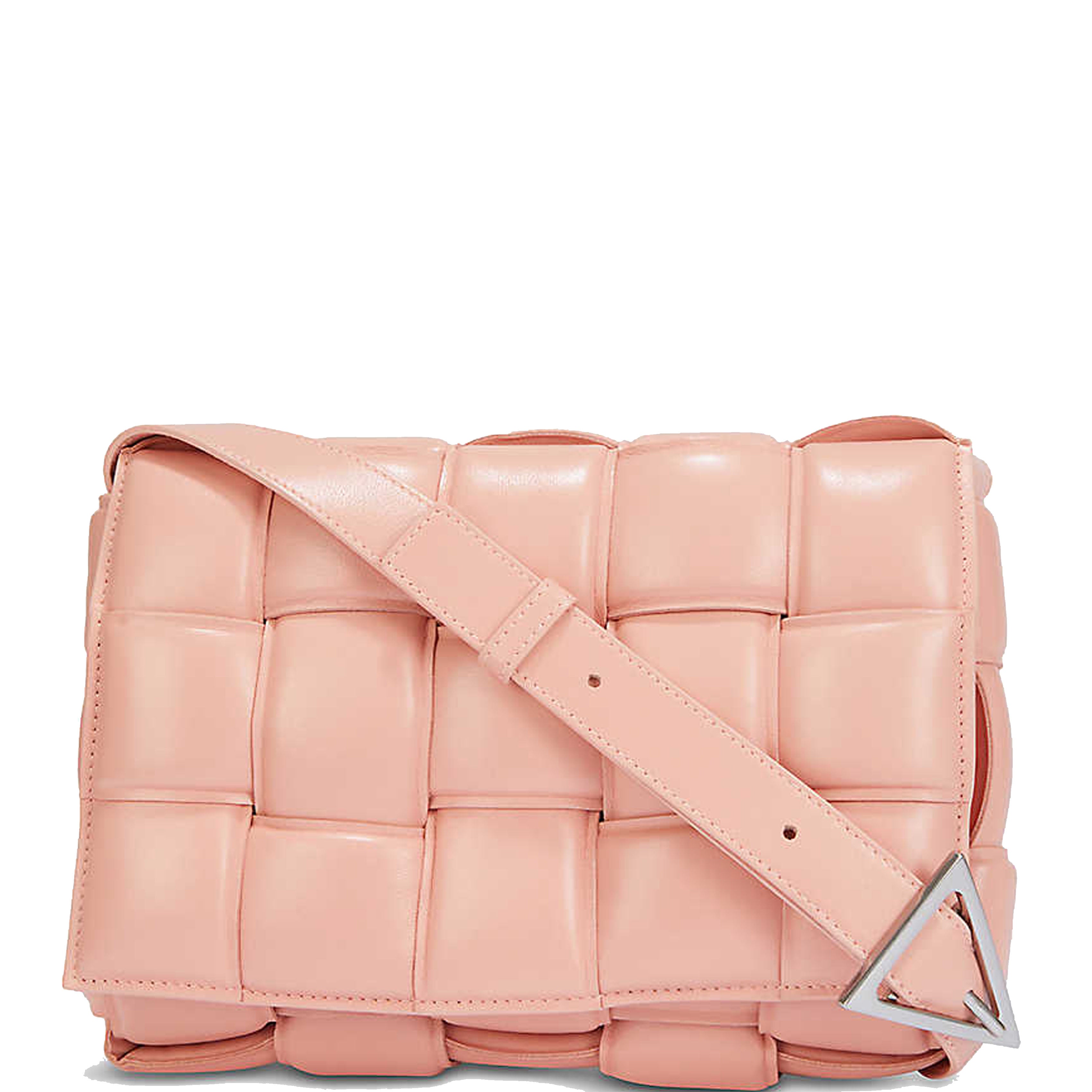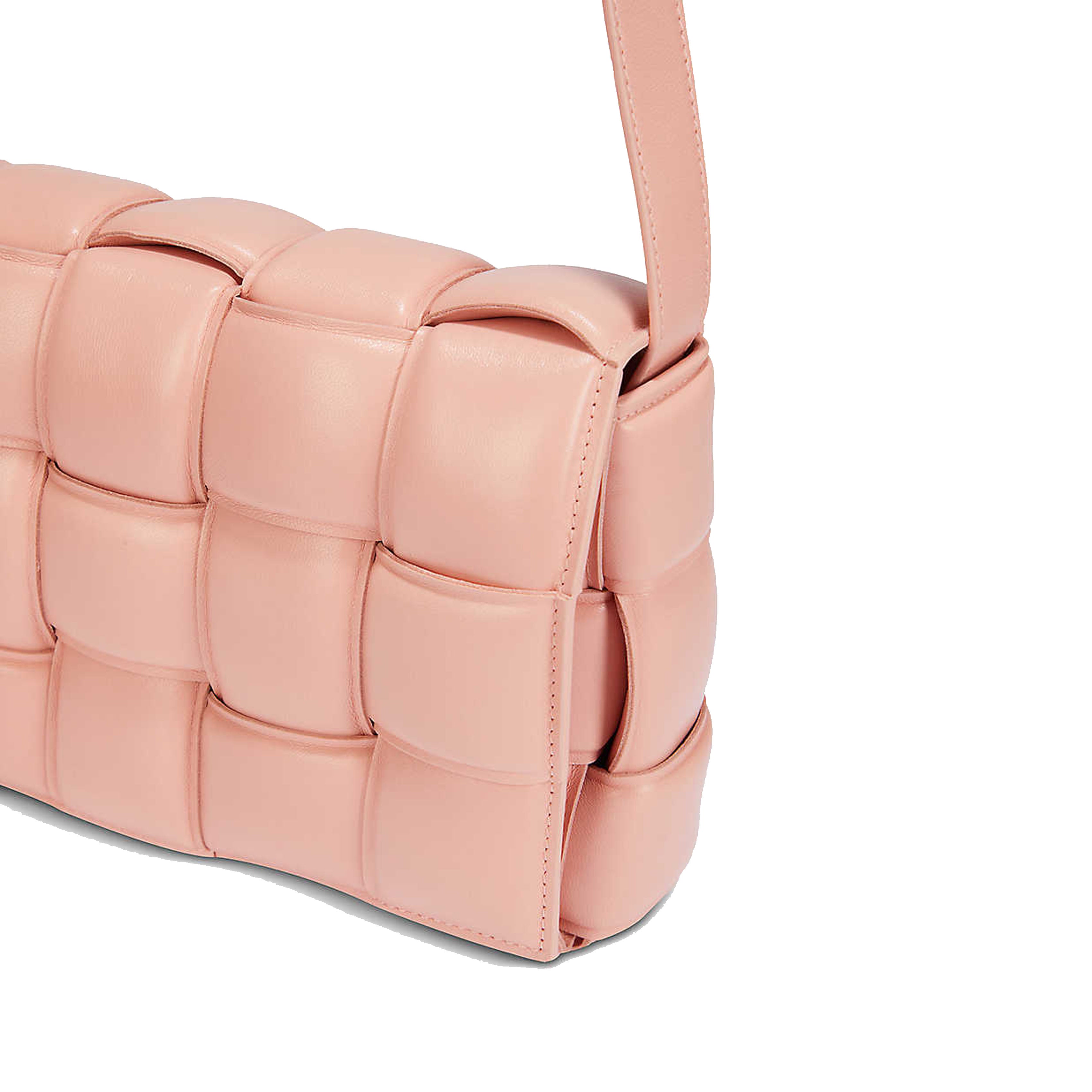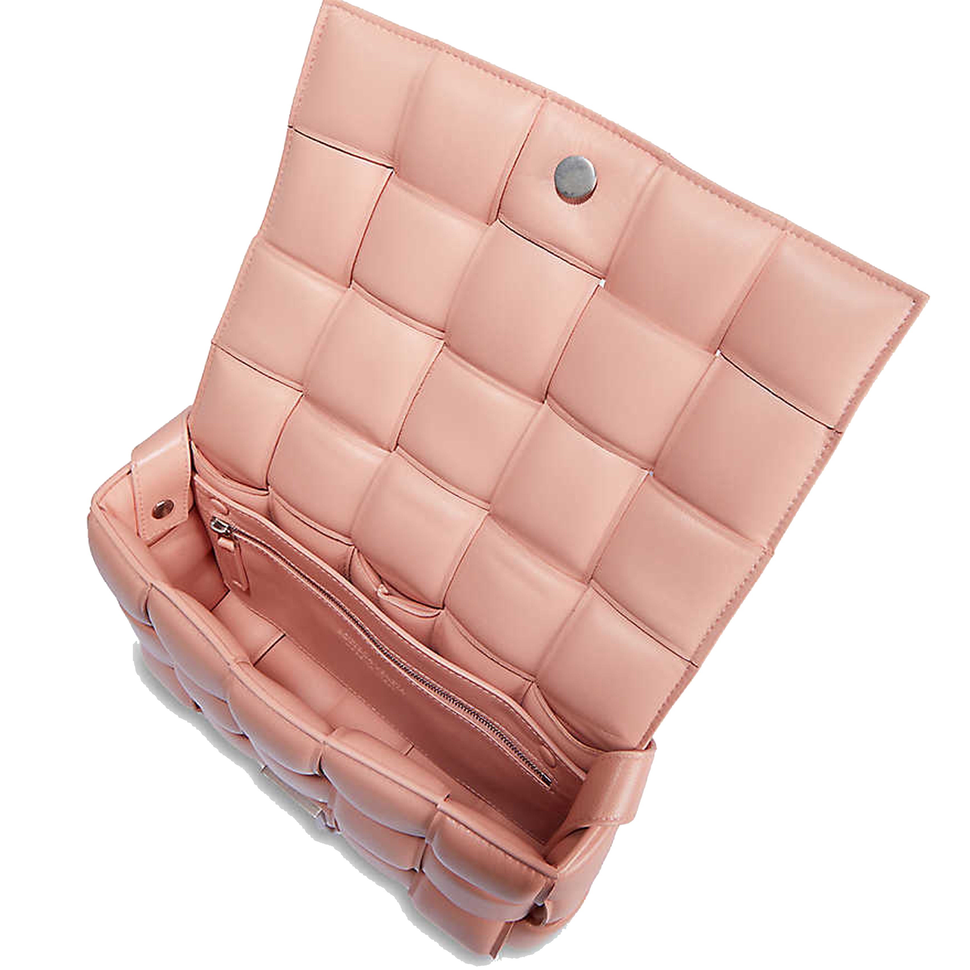 Crossbody bag in a double-face maxi weave. Made with wide double-face Nappa strips in an orthogonal weave. Interior is identical to exterior; fitted with a zipped pocket and magnetic closure. Adjustable shoulder strap folds inside the bag to carry as a clutch.