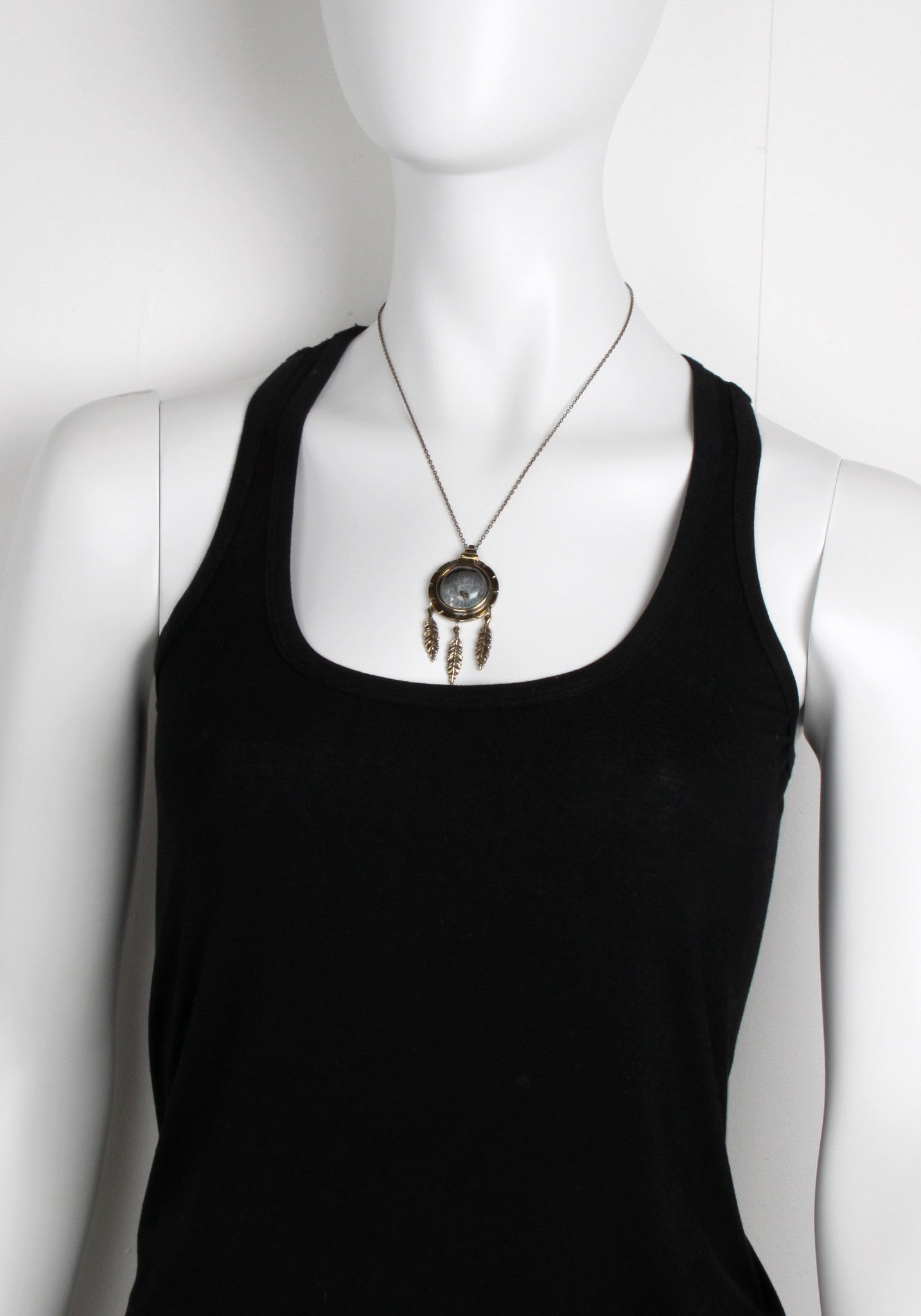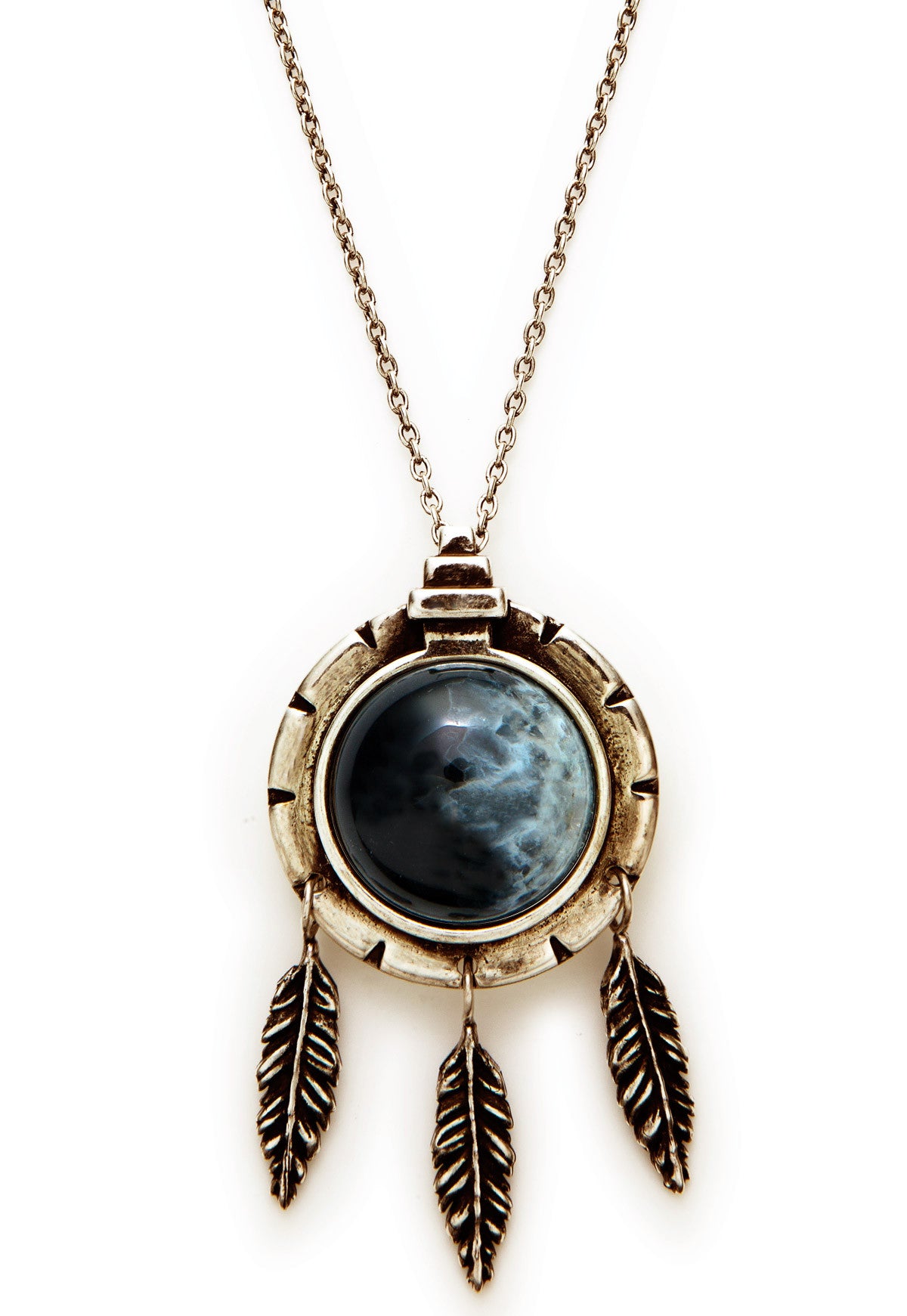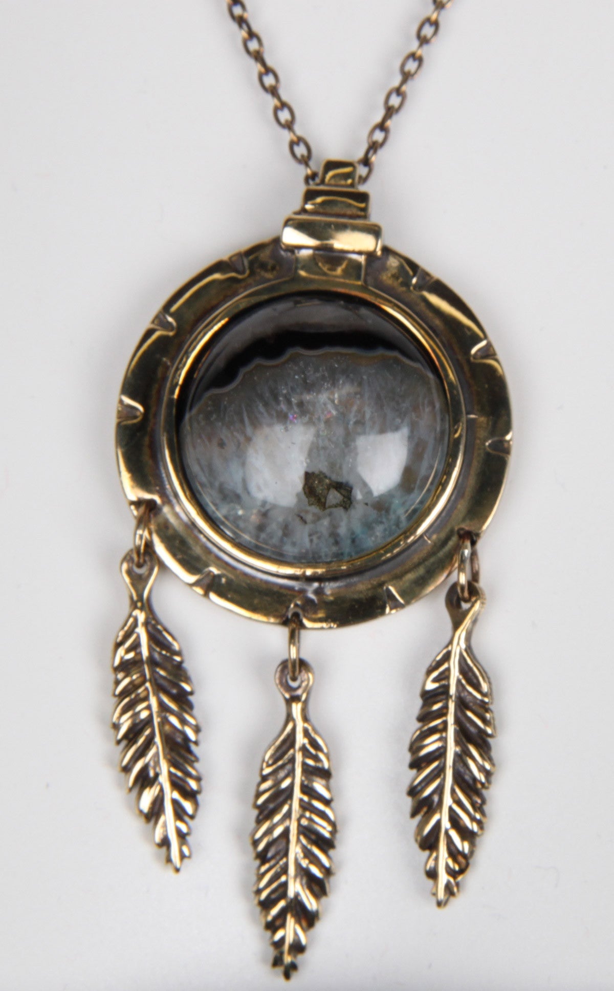 Delicate feathers hang from this beautiful black agate disc pedant. Black agate protects against negative energies and promotes goodwill.
