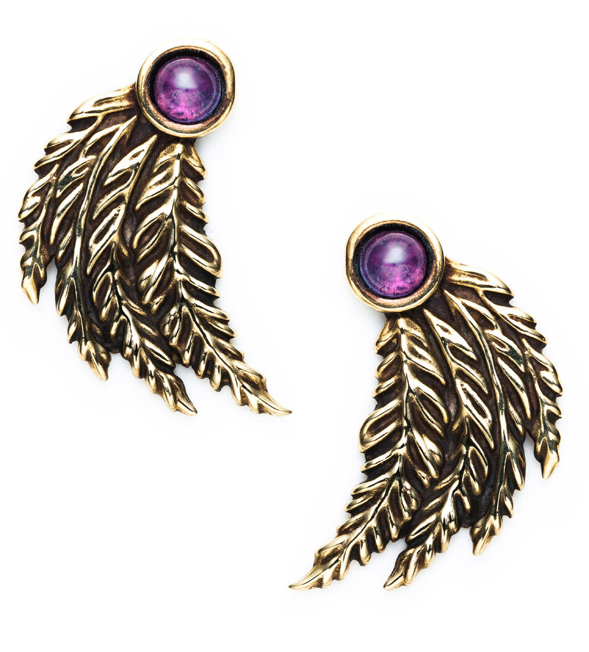 Delicate brass feather earrings with Amethyst stone. Amethyst is a gemstone often worn by healers, as it has the power to focus energy.
