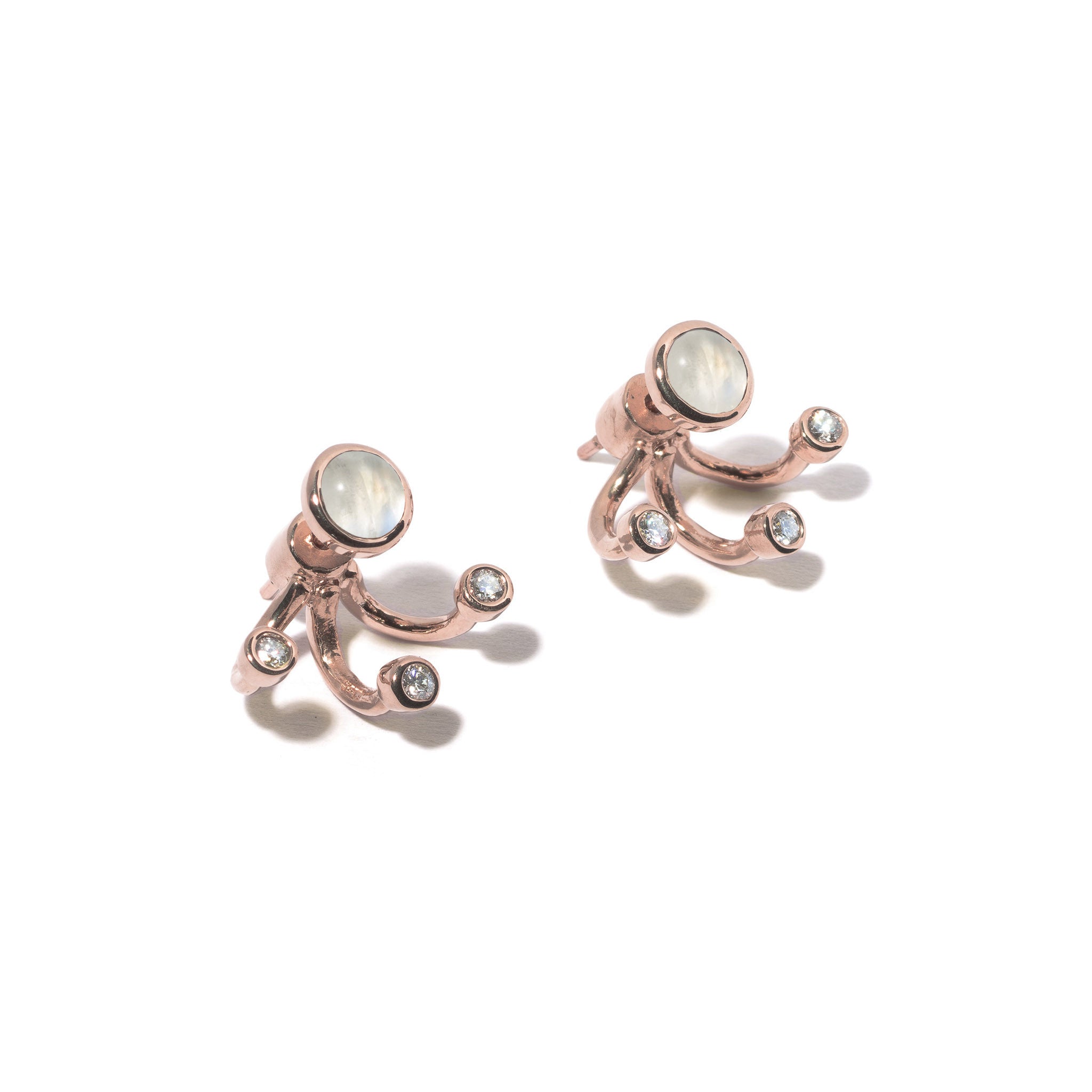 Pamela Love's gravitation earrings create a modern, feminine look. A moonstone cabochon set in rose gold features three curved white topaz-accented arms that extend from behind the ear, giving the illusion of the earring hugging the lobe. Adorn you ears with charm and wear in the earlobe or the cartilage.