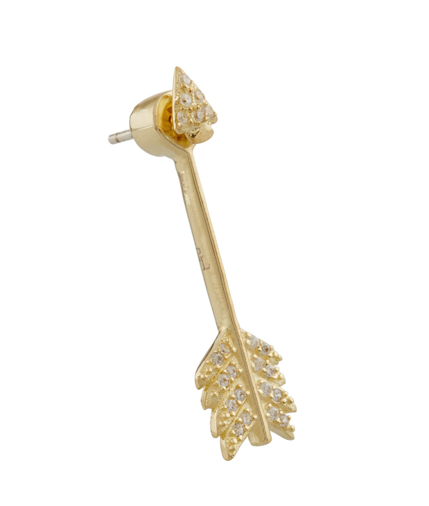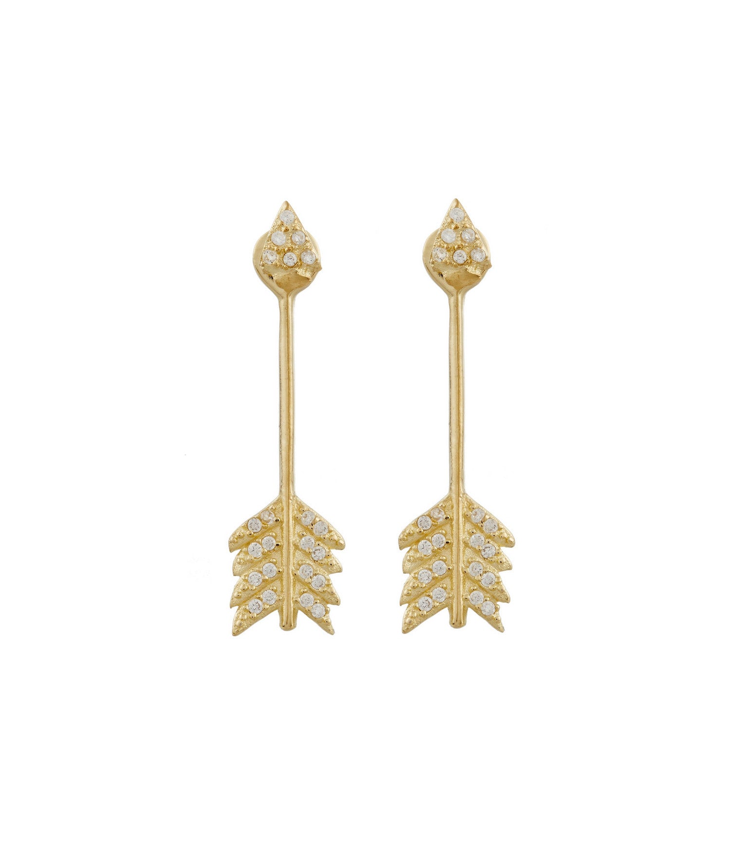 Pamela Love's shooting arrow earrings are handcrafted from gold plated sterling silver and feature white pave topaz stones to create a subtle shimmer. Featuring a triangular stud pave front and a slim arrow shaped backing these look as though they float on the ears creating everyday charm.