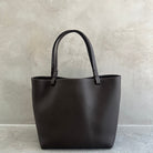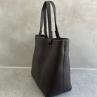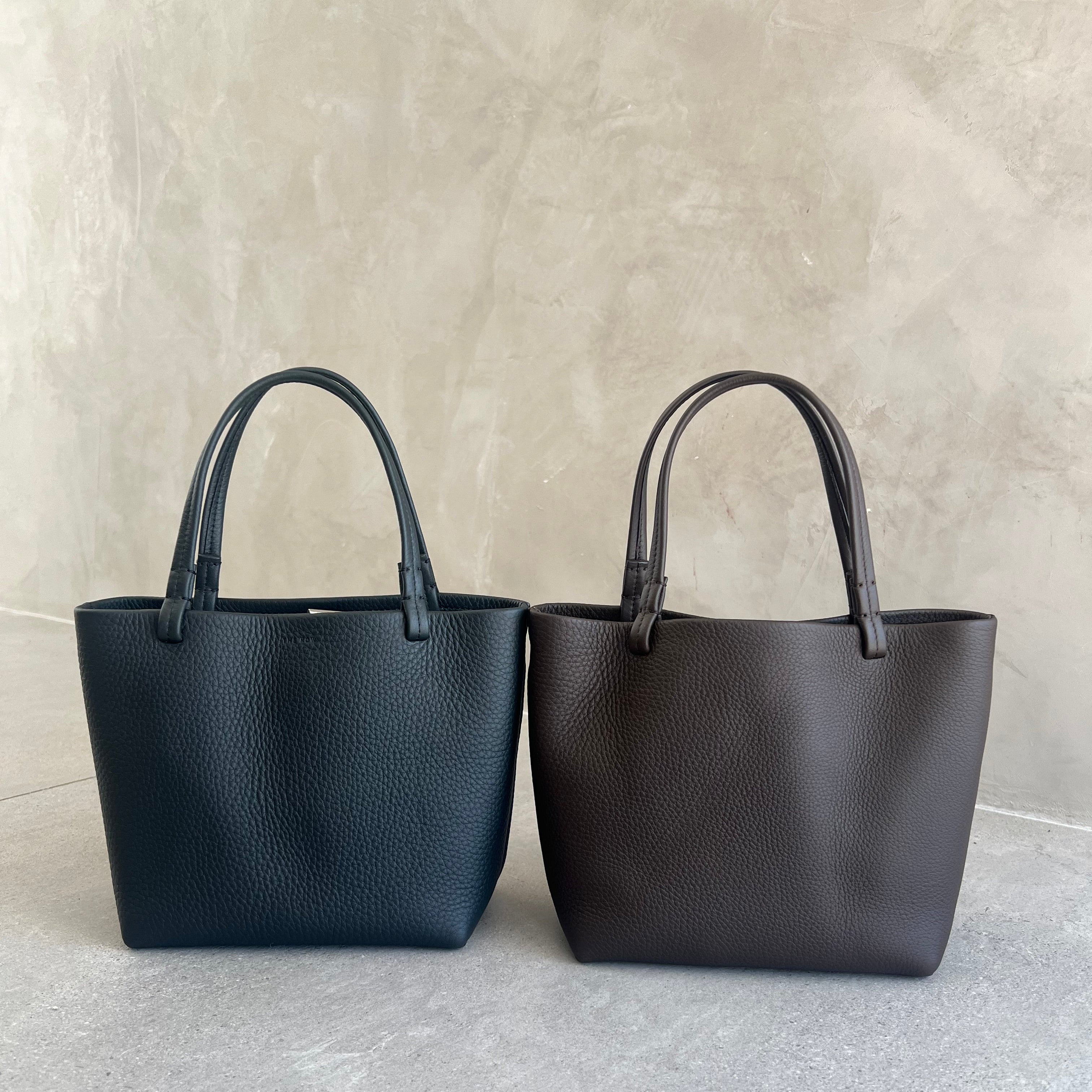 Small classic tote bag in textured calfskin leather with detachable shoulder strap, interior toggle closure, and flat handles.