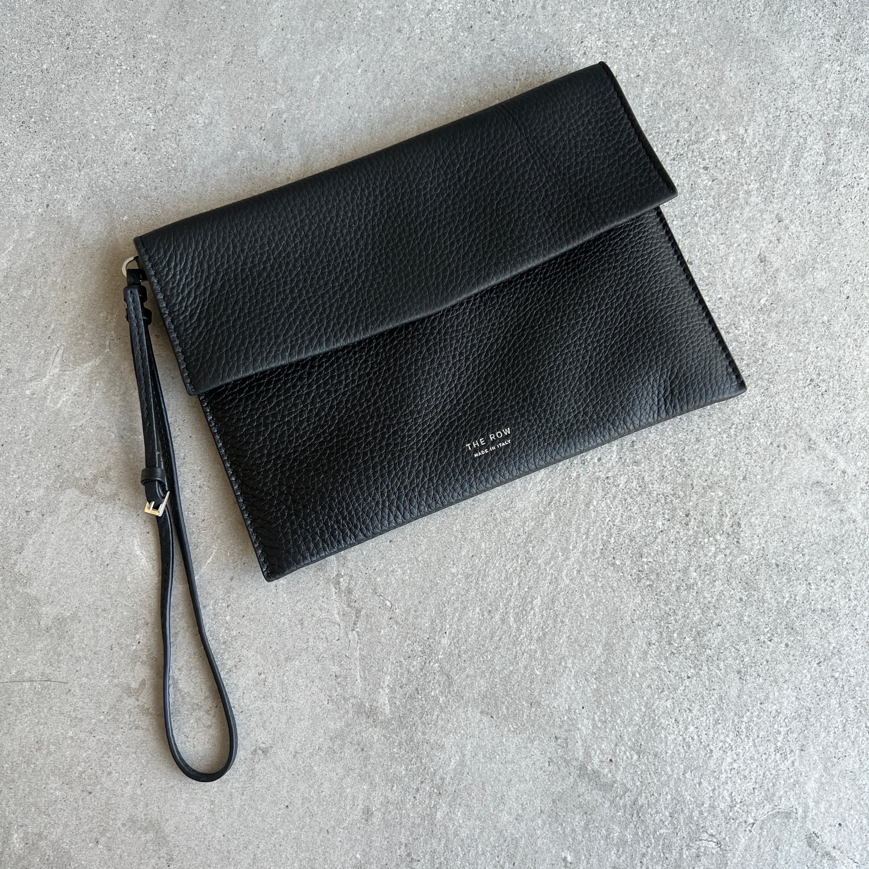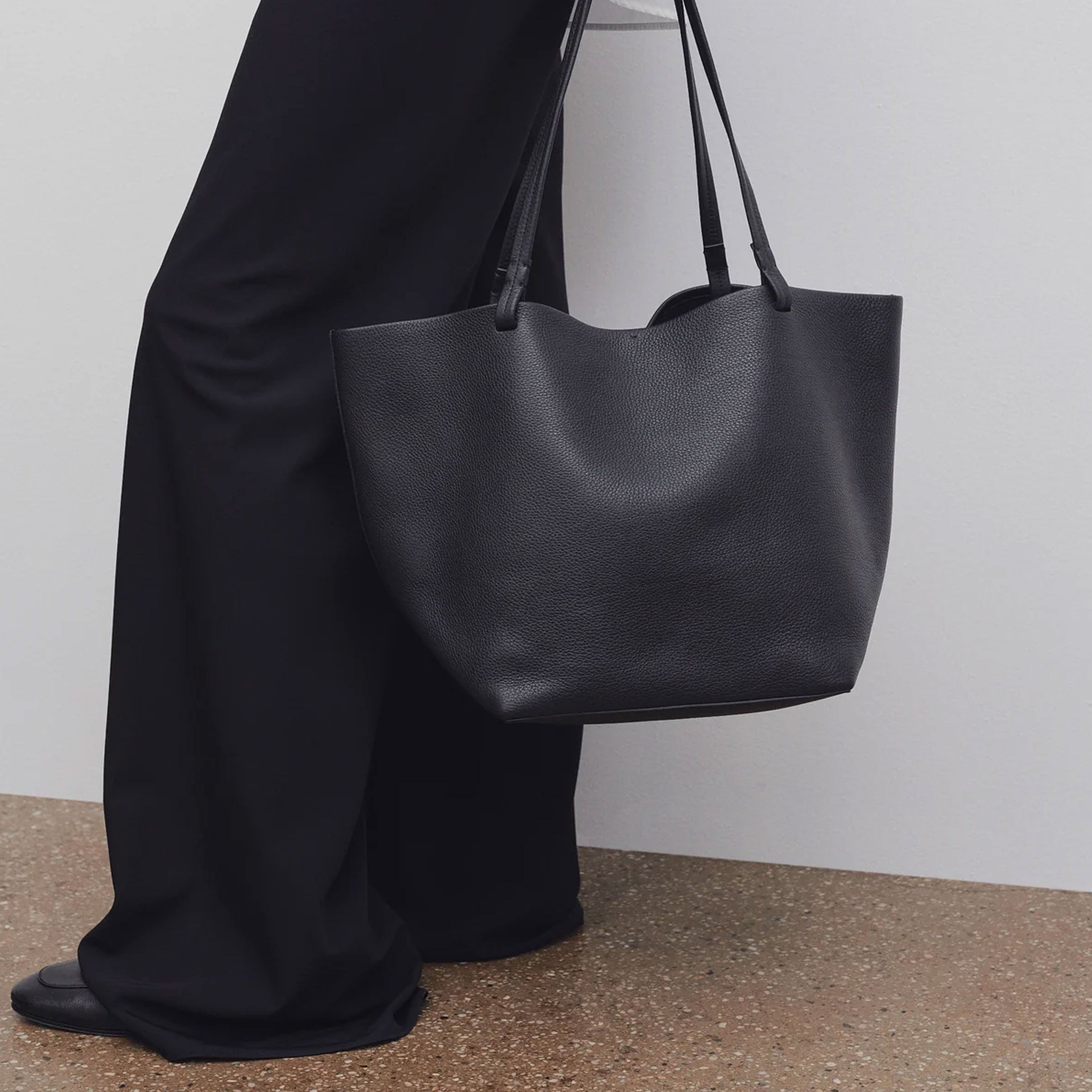 Classic tote bag in textured calfskin leather with interior toggle closure, flat handles, and interior wristlet with adjustable strap. Minimally finished, the natural grain surface is left intact, giving the leather a supple hand and refined texture that develops character over time.