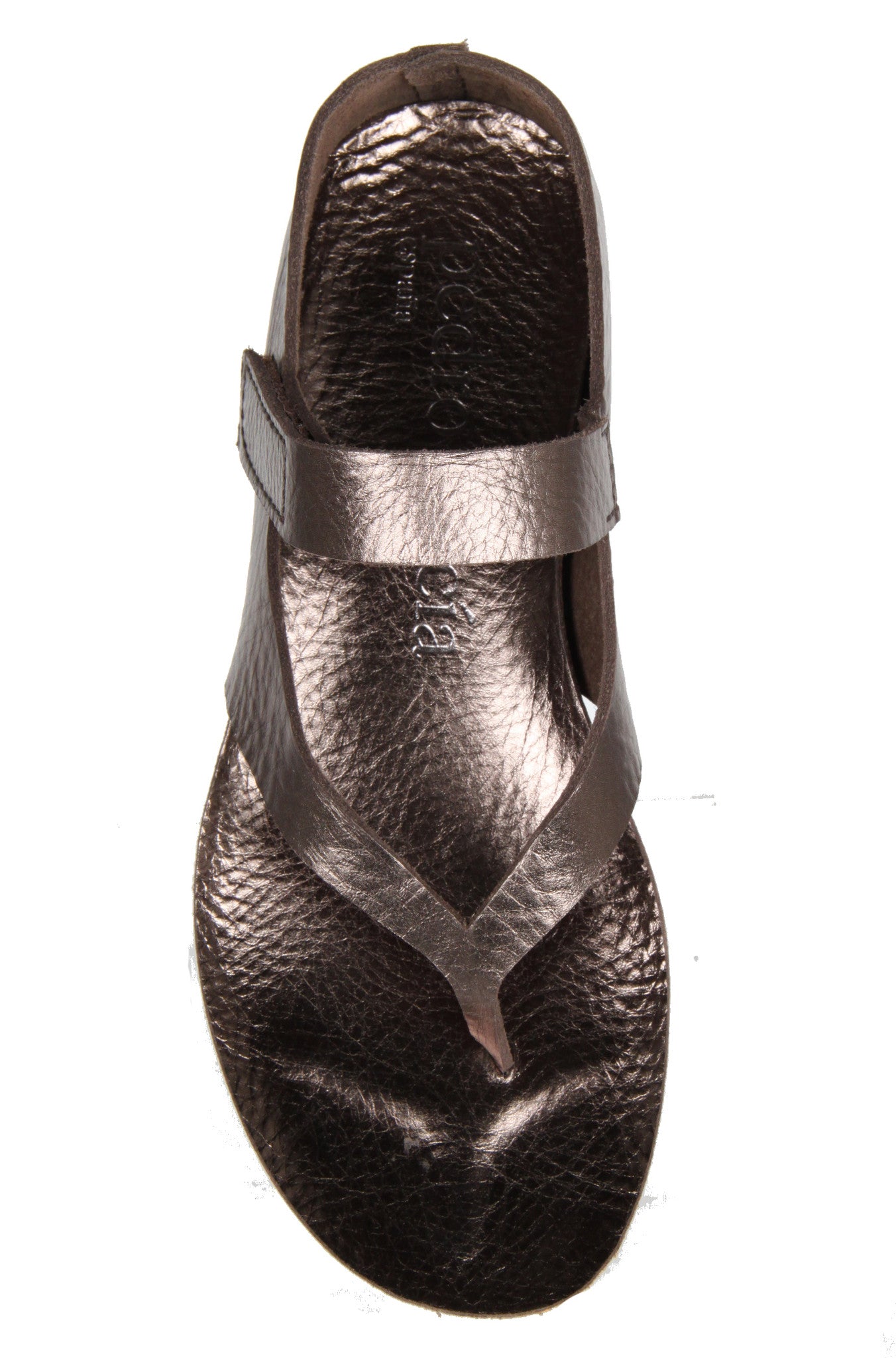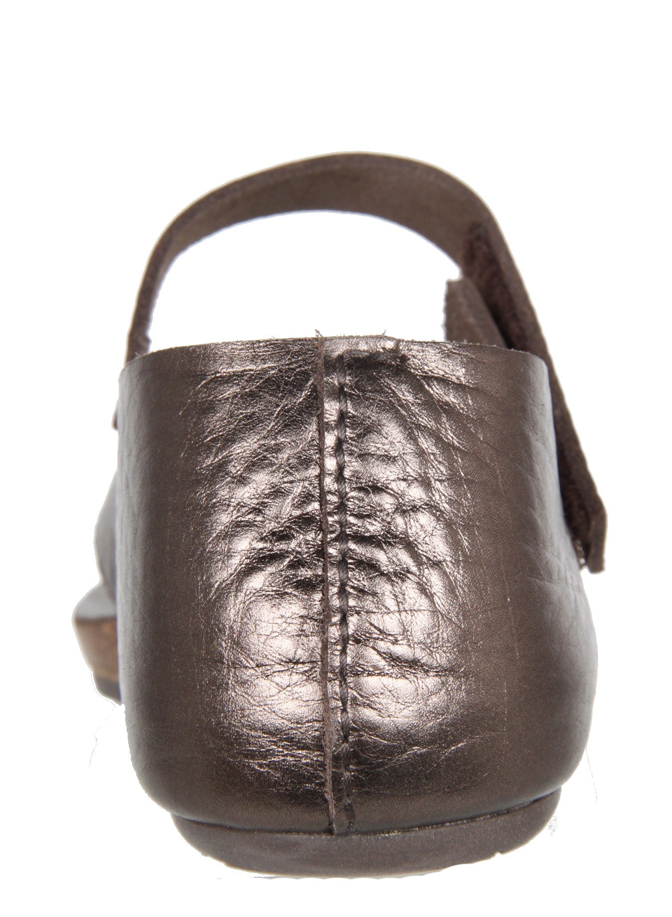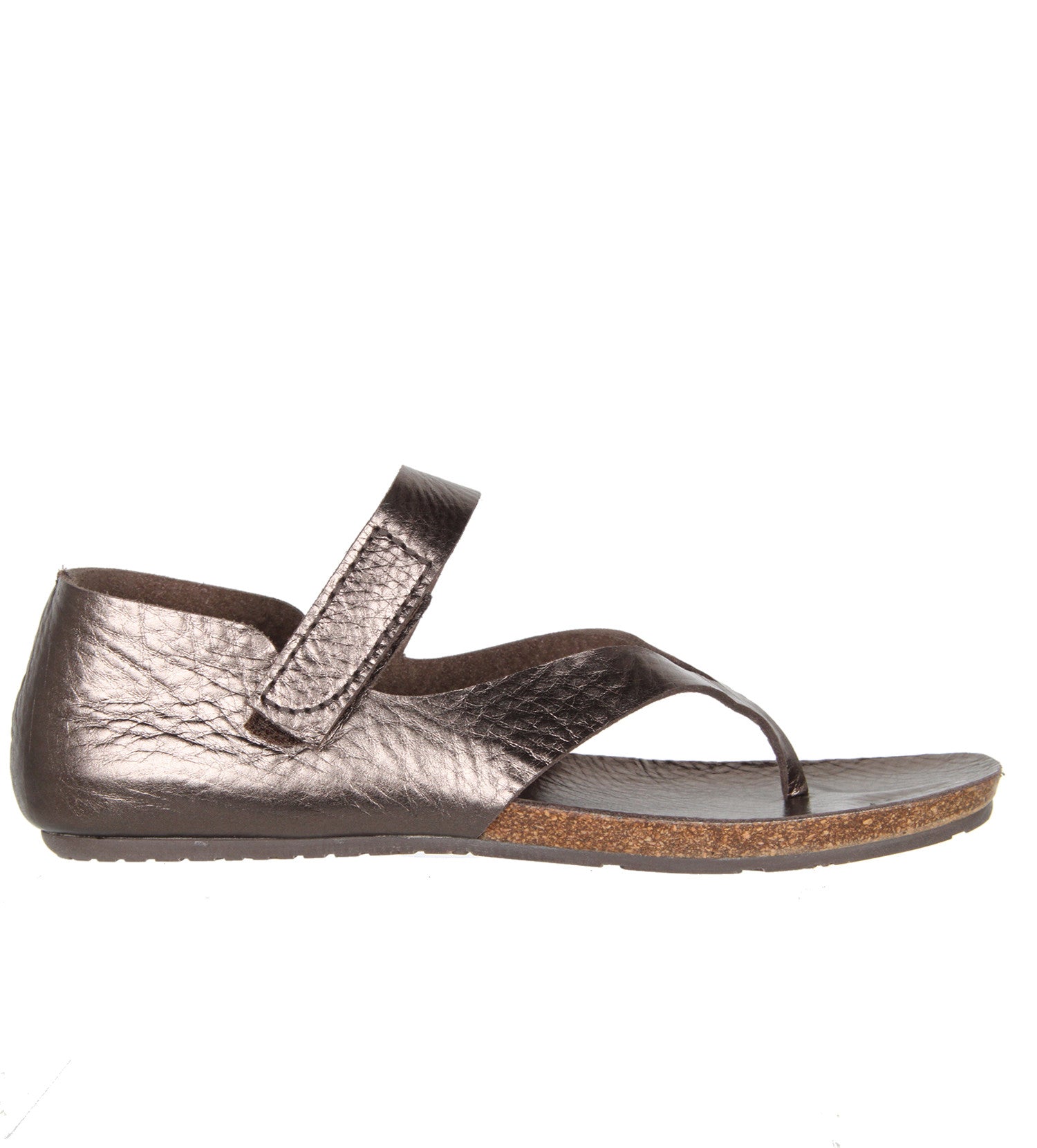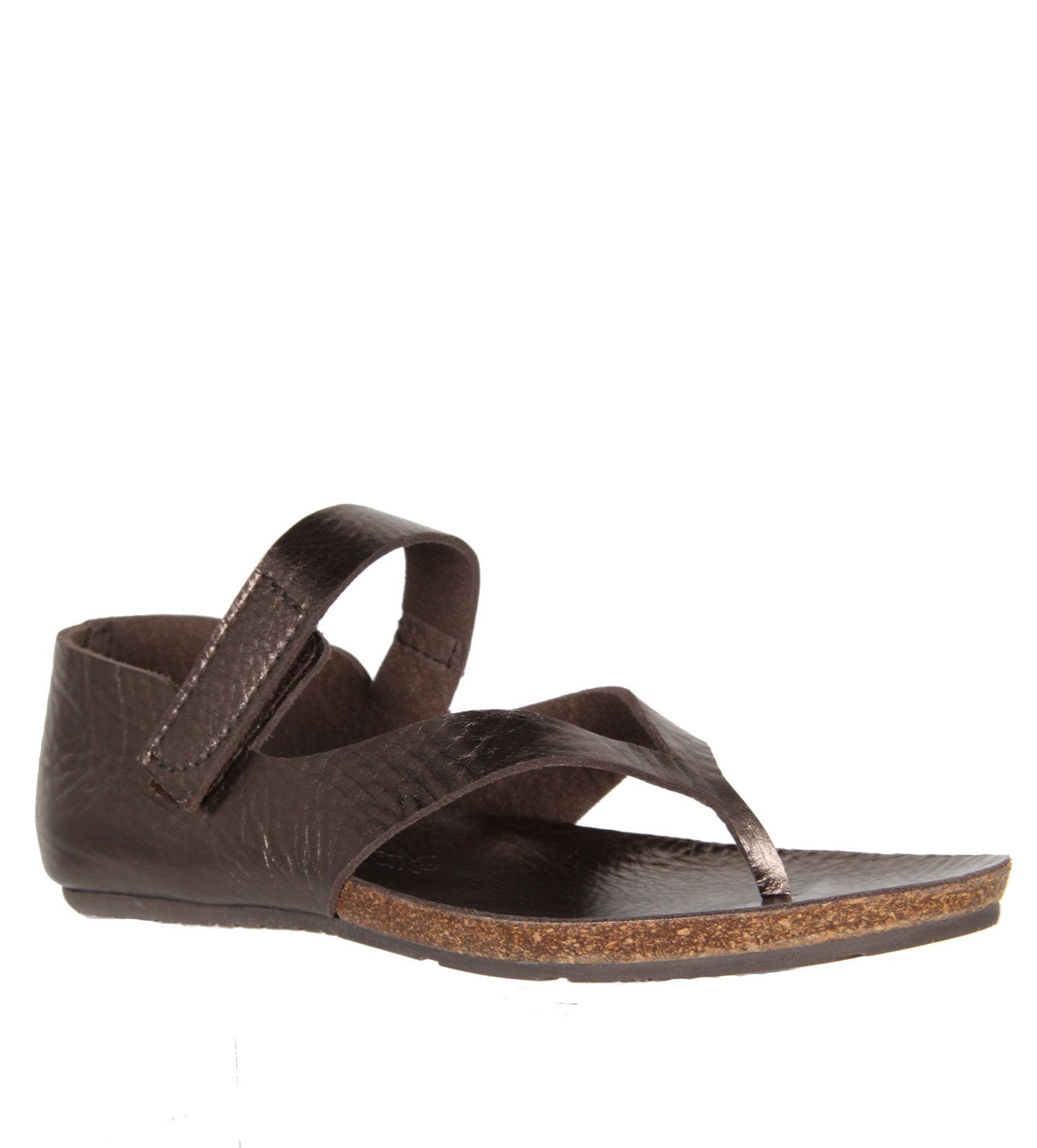 Flat sandals feature a metallic pebble leather with a comfortable cork foot bed. A velcro strap wraps across the front of the ankle for a secure fit.