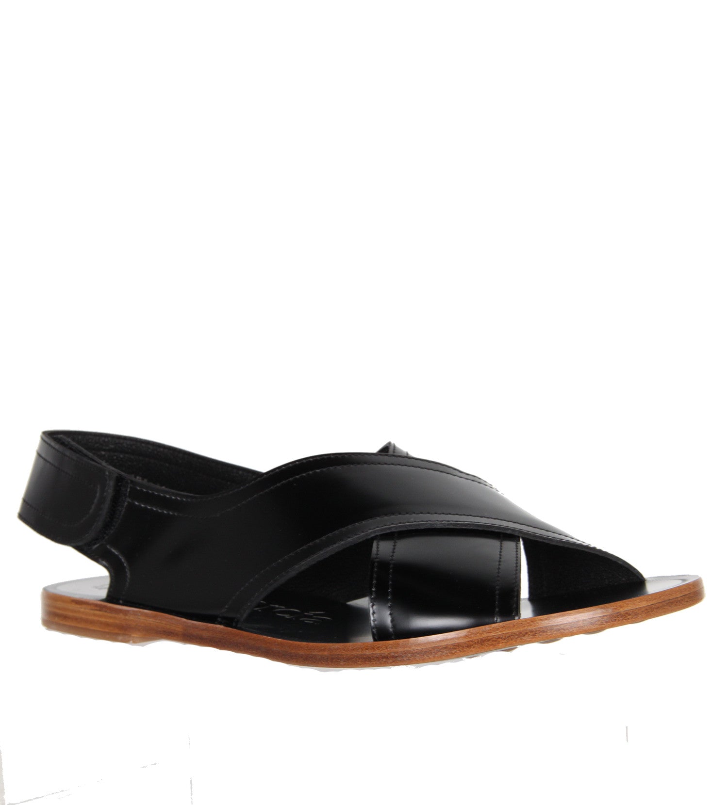 Flat crossover sandal in black Bakelite-calf. Calfskin upper, Velcro closure, textured goatskin lining, matching leather insole and sole with anti-slip TPU nibs, providing a base that offers outstanding abrasion resistance, toughness, and flexibility.