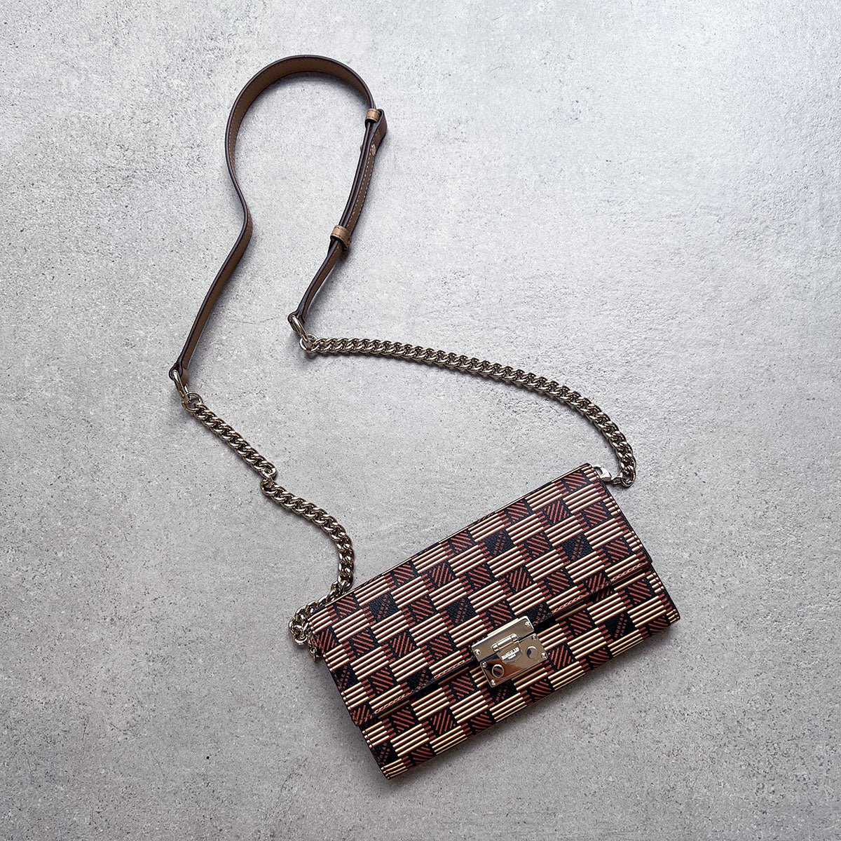 The Phone Clutch holder is the perfect light day-to-night bag which can be worn as a shoudler or cross body bag, or even as a clutch. Featuring Moreau's signature pattern, secure latch, and adjustable chain/leather strap for optimal comfort.