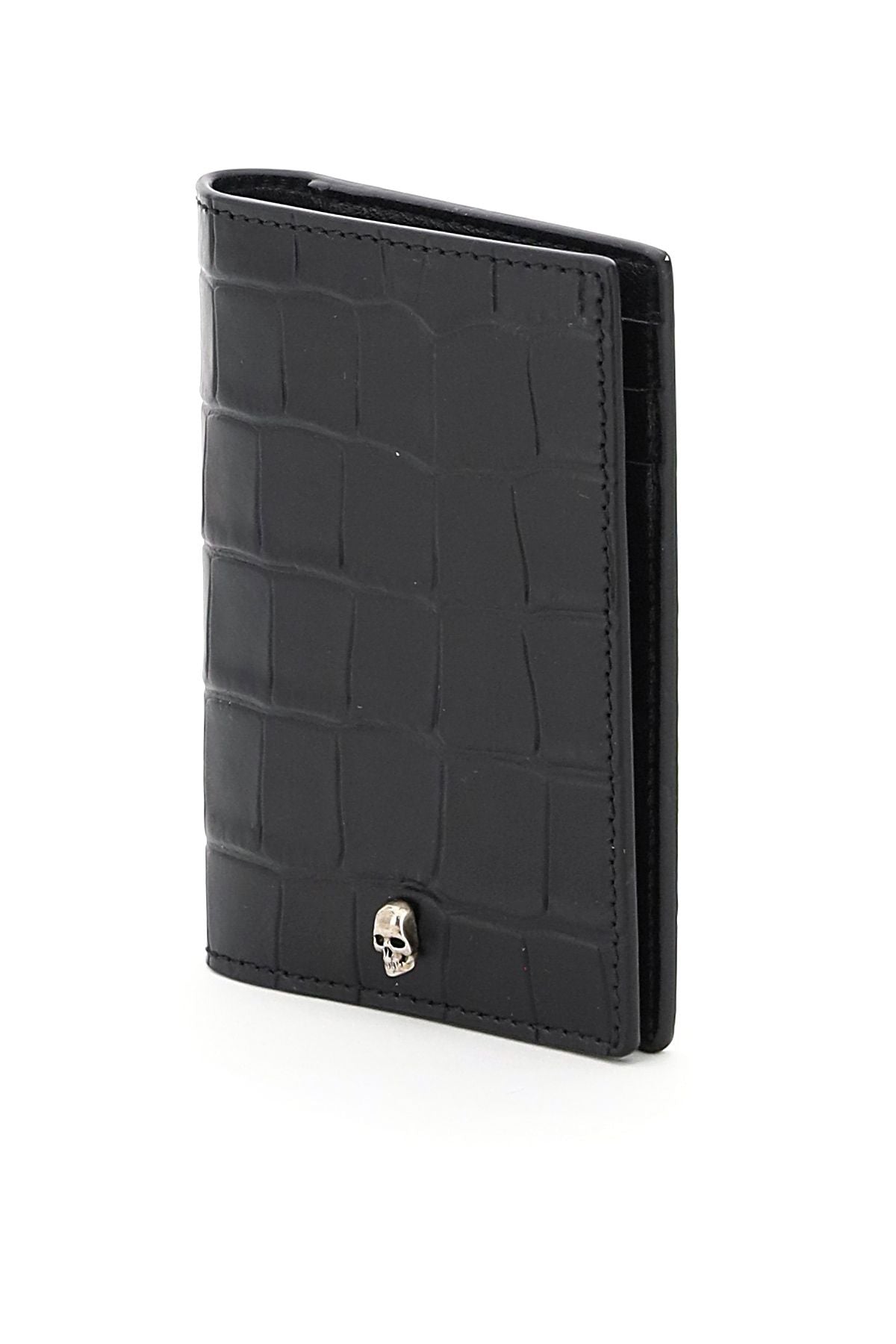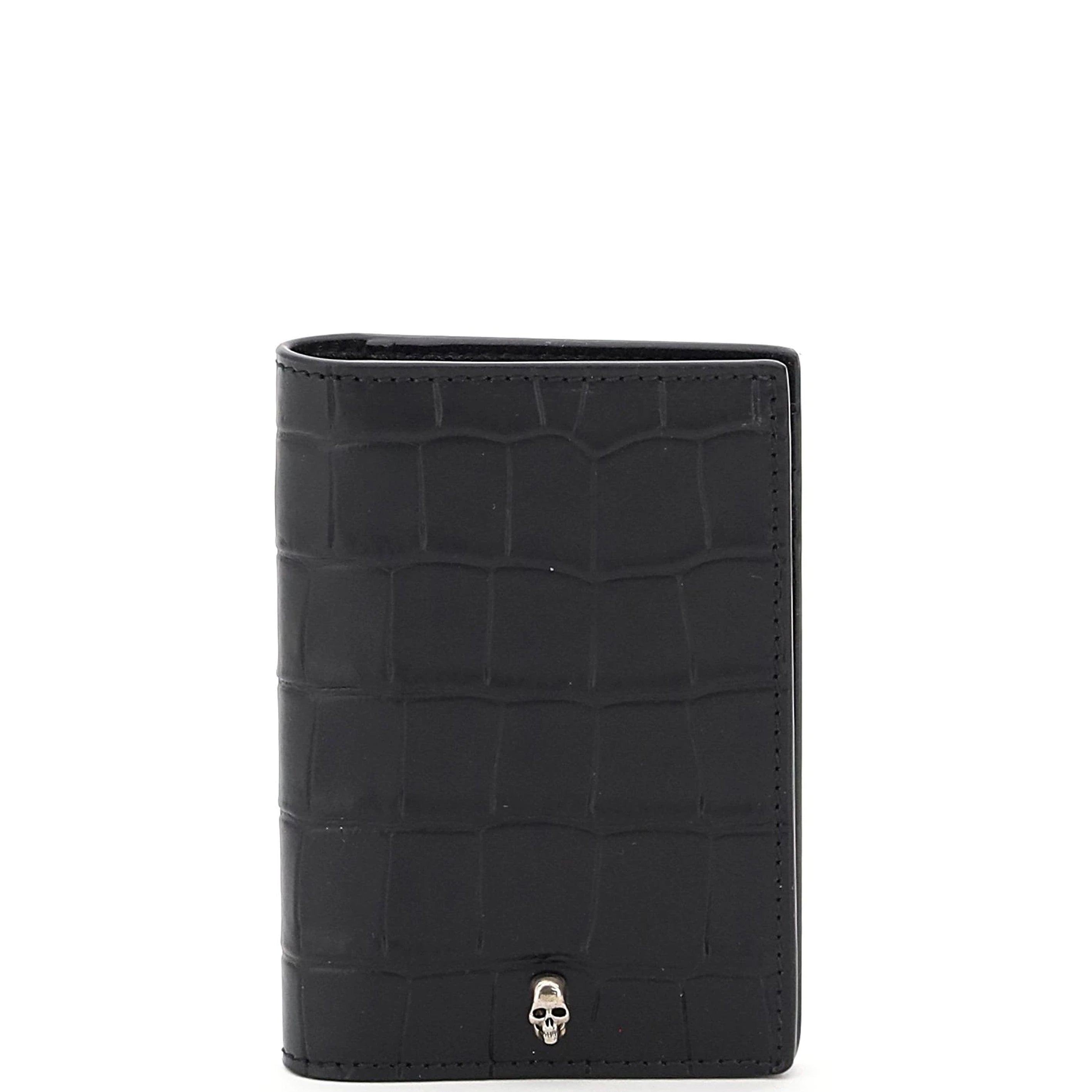 Alexander McQueen bi-fold pocket organizer in crocodile-embossed leather with the iconic silver-tone metal Skull applied on the front. Leather and fabric interior with two ticket pockets, six credit card slots, embossed logo.