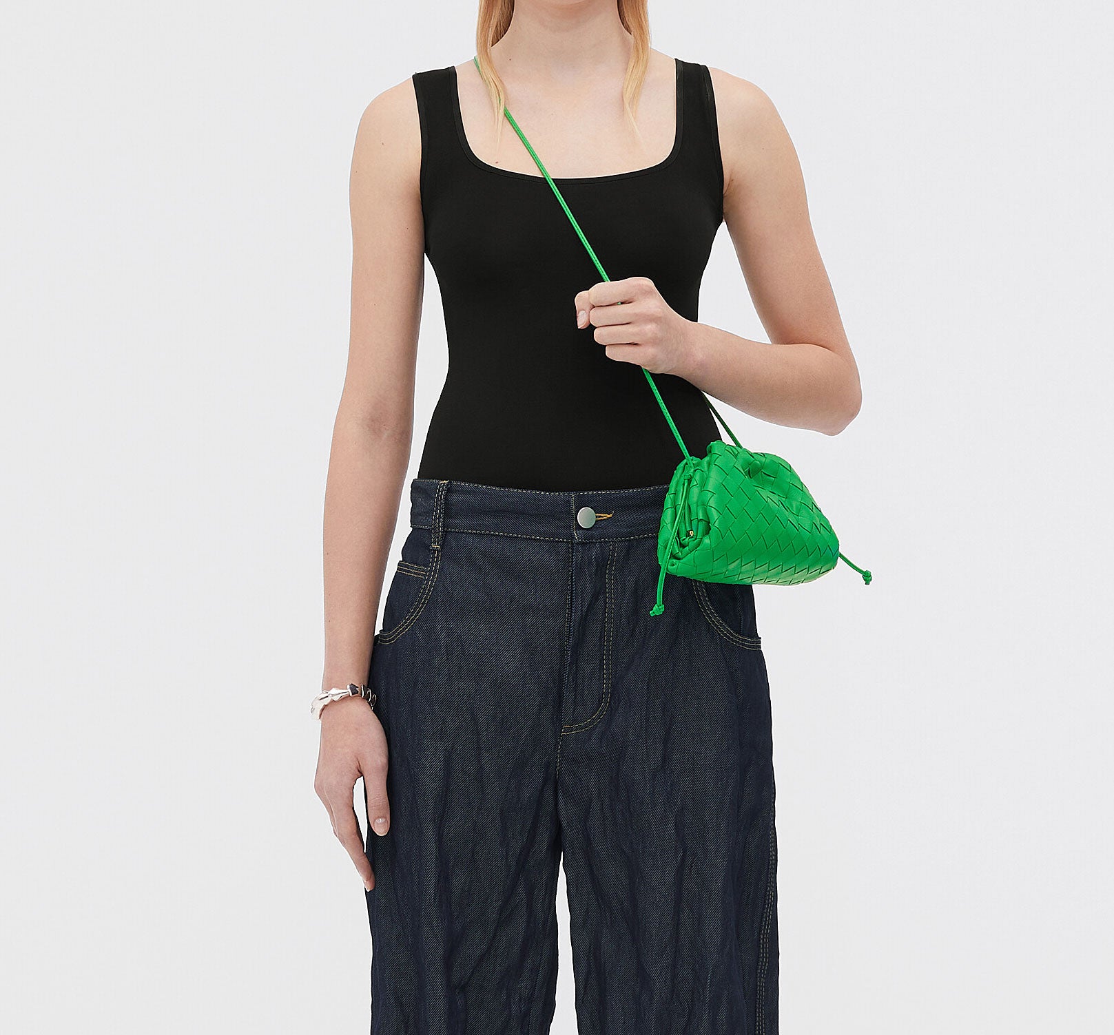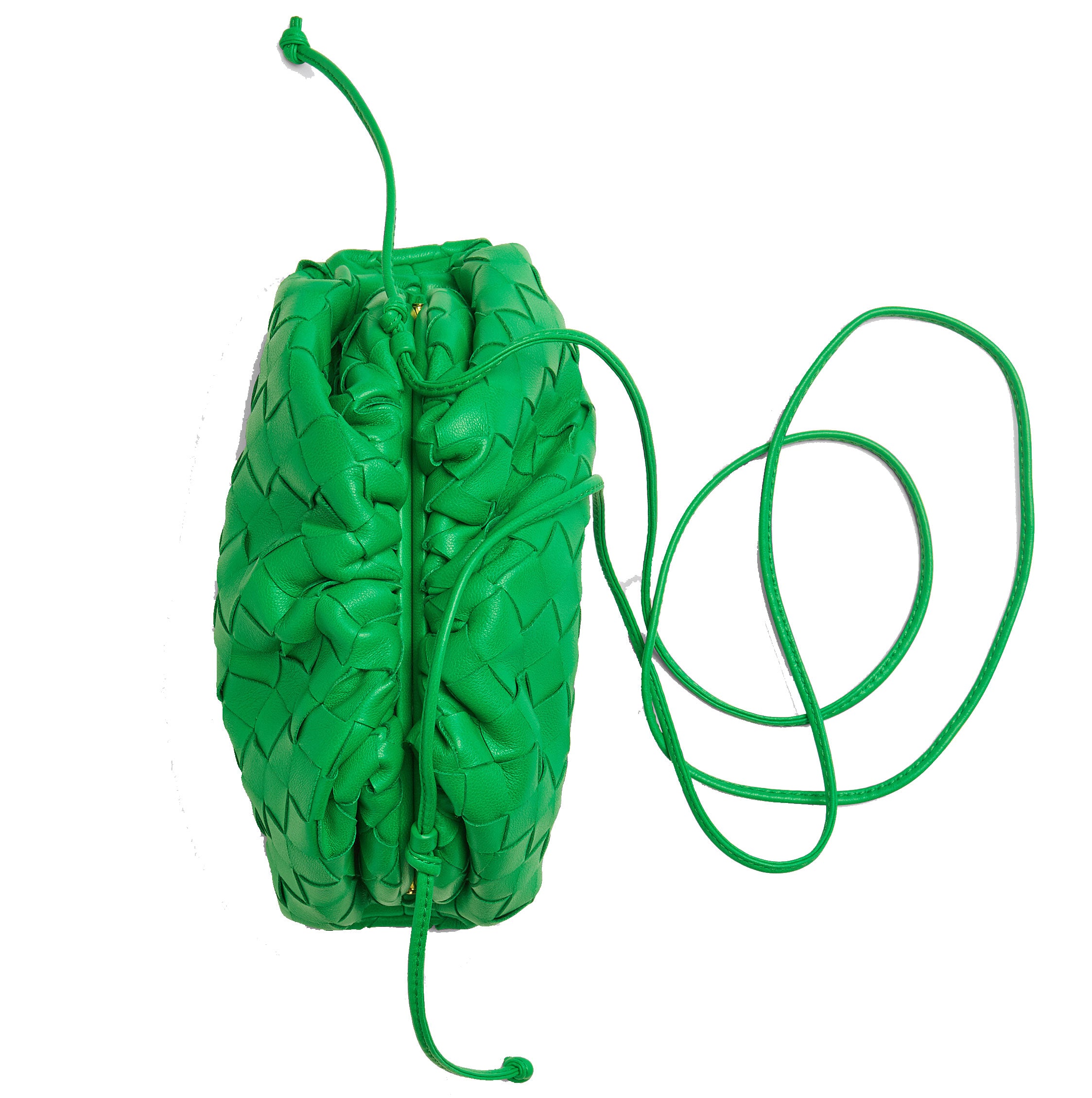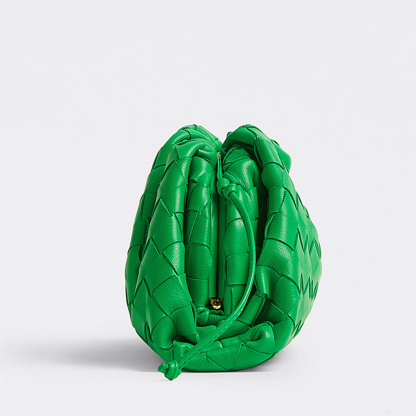 Soft voluminous clutch in woven leather. Magnetic frame covered in folds of handwoven leather. Iconic intrecciato weave in a subtly amplified new dimension. Single compartment lined in nappa. Slim leather shoulder strap. Smaller style of The Pouch, a brand icon that reflects Bottega Veneta’s heritage with a modern attitude