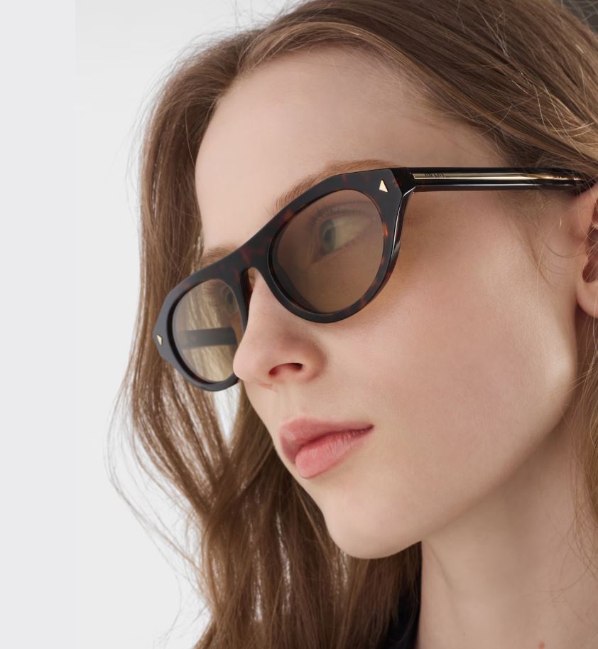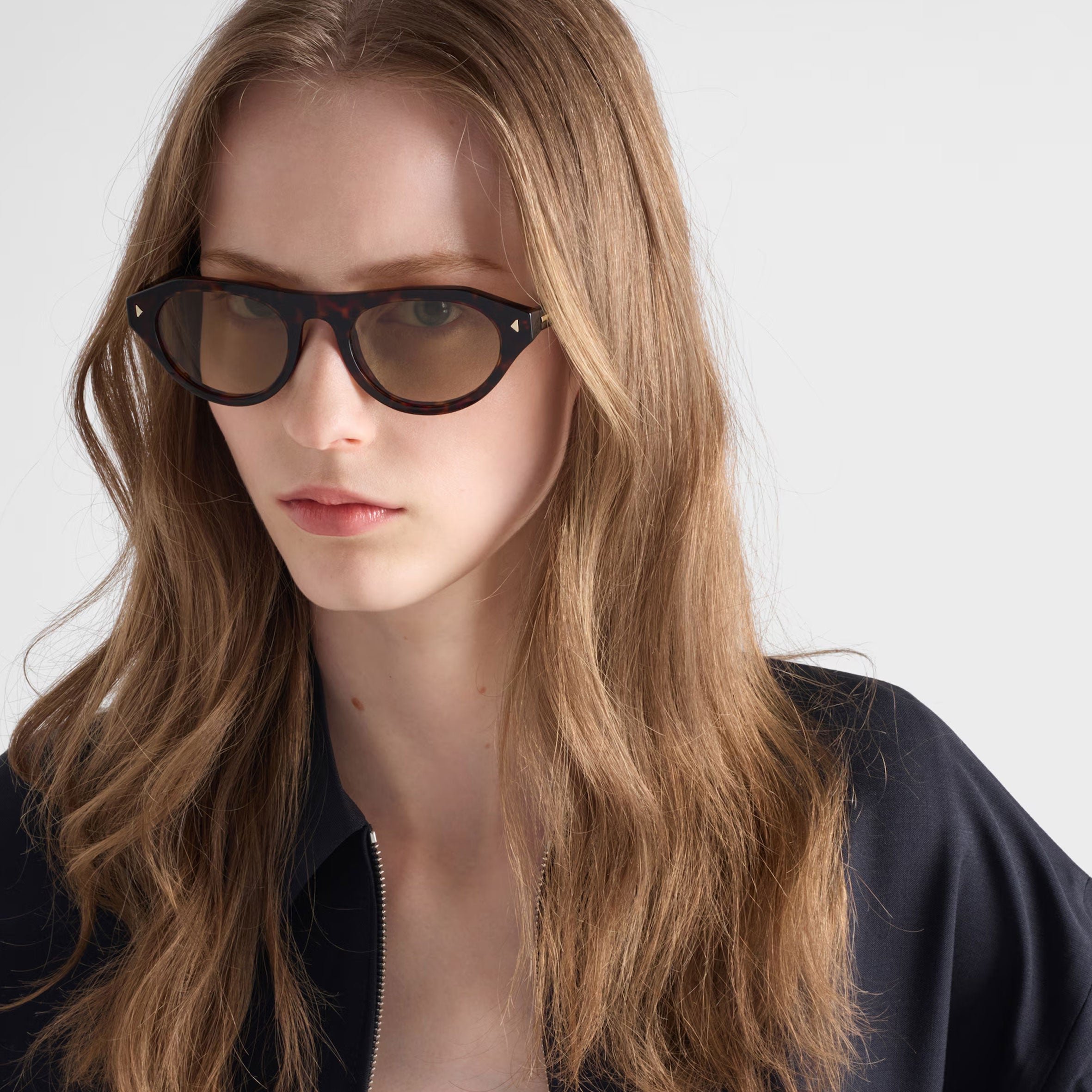A sleek aesthetic meets the refined touch of details in these new Prada sunglasses. The acetate frame front features sophisticated triangular rivets while the temples highlight the iconic metal element enriched with the Prada lettering logo.