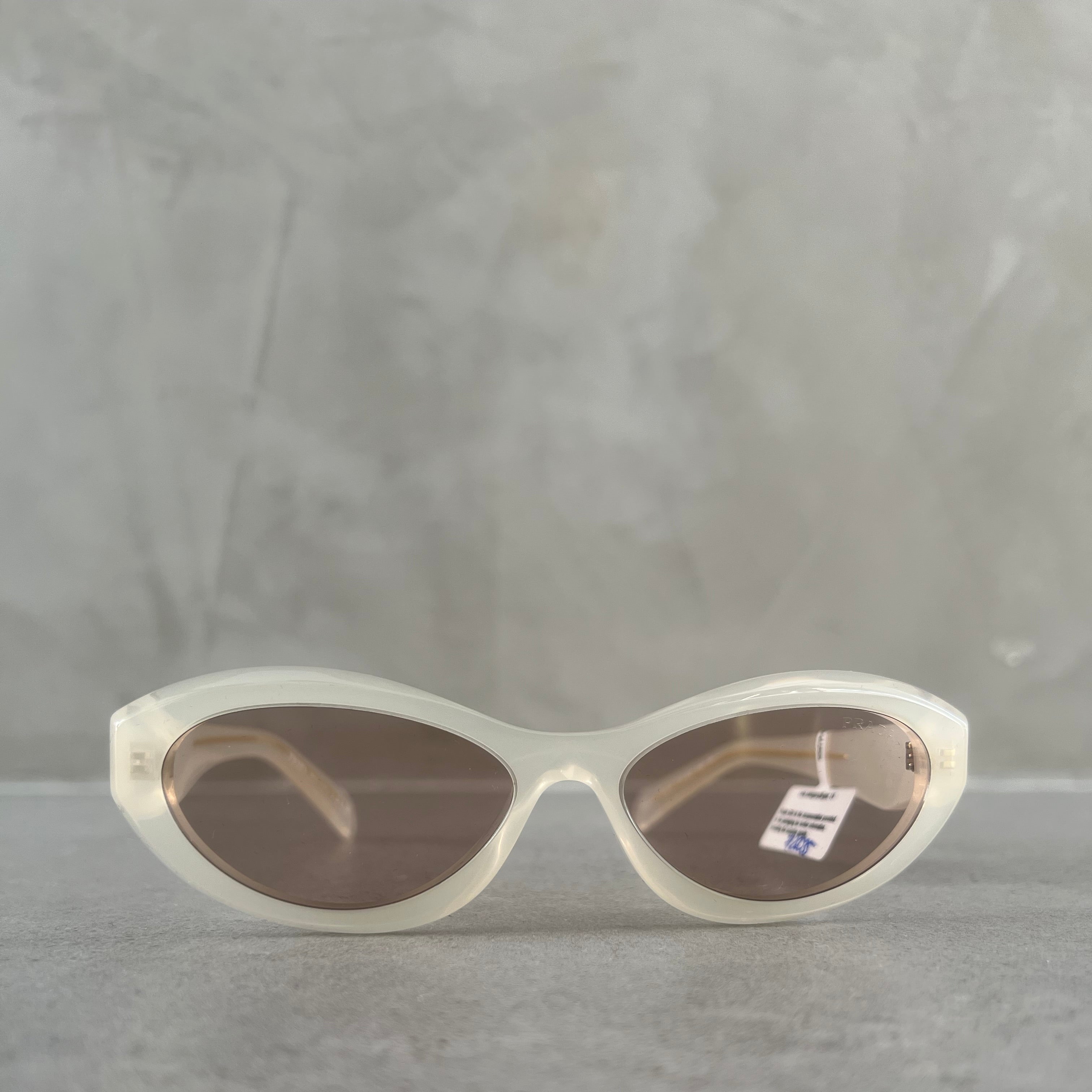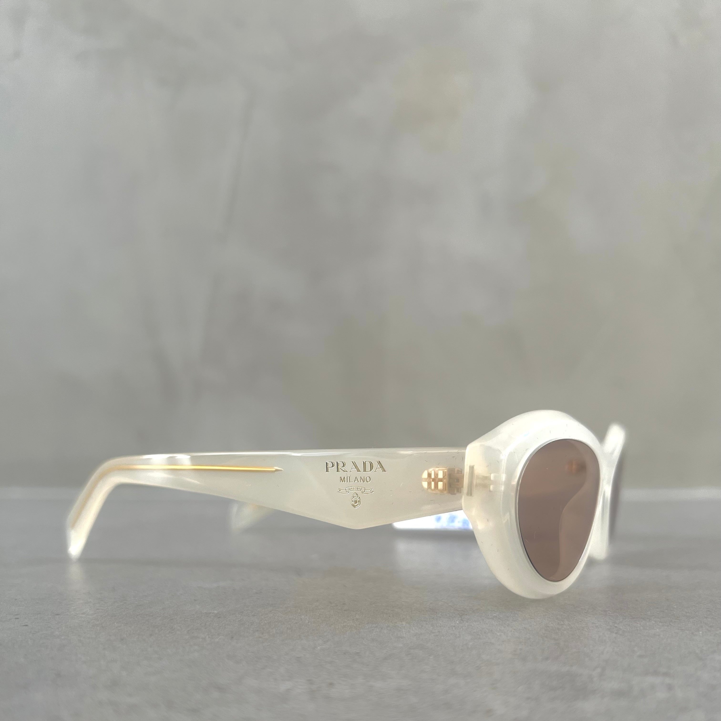 Prada Catwalk collection sunglasses model PR 26ZS opal with light brown lens. The slim temples are emphasized by a refined three-dimensional detail that iconographically interprets the triangle logo of the fashion house.
