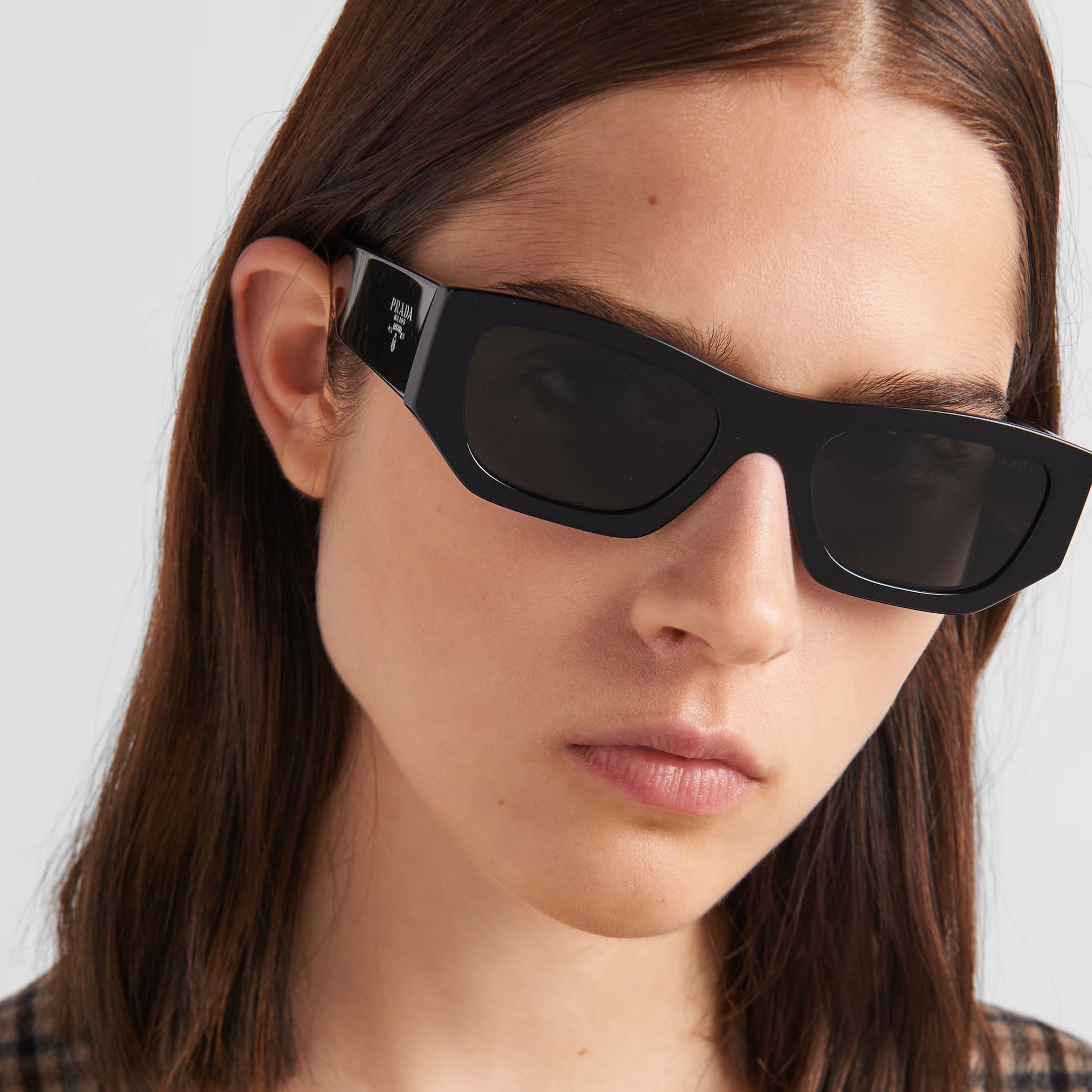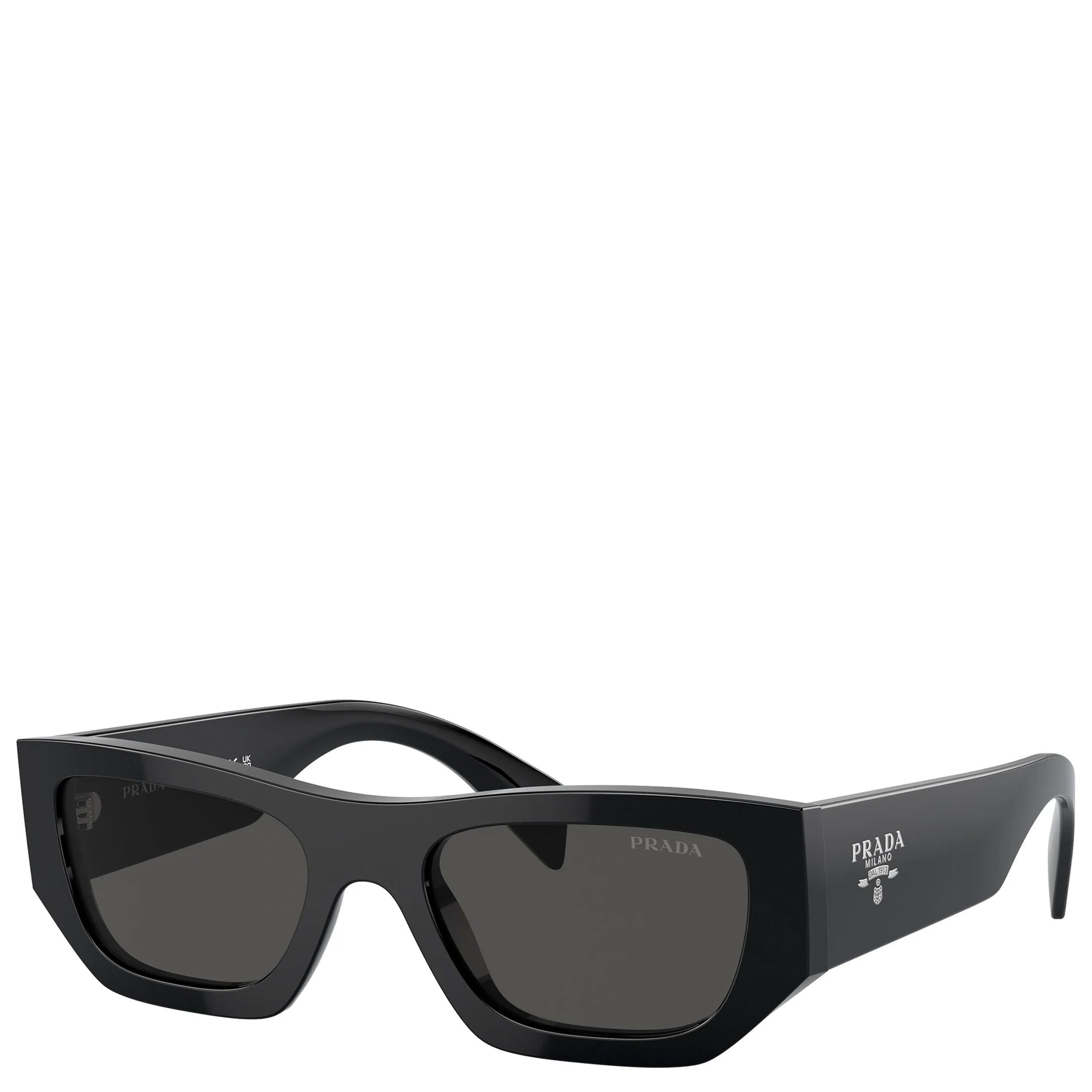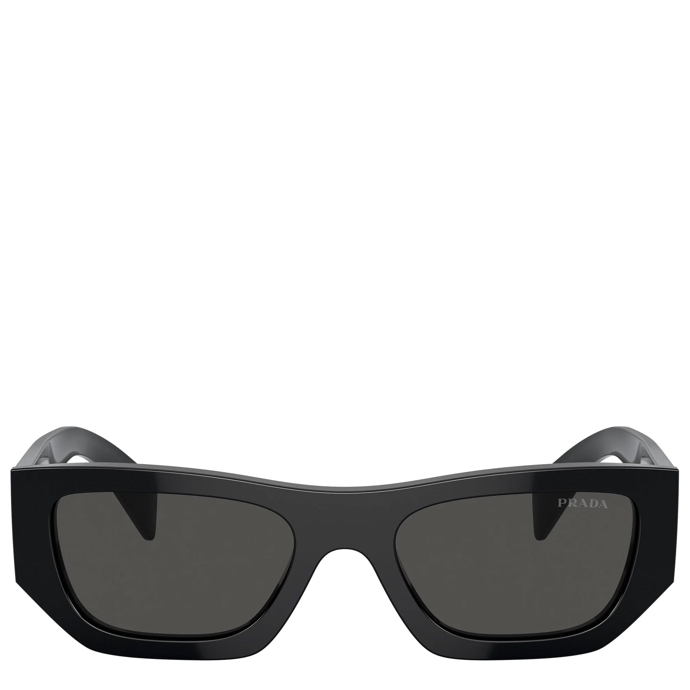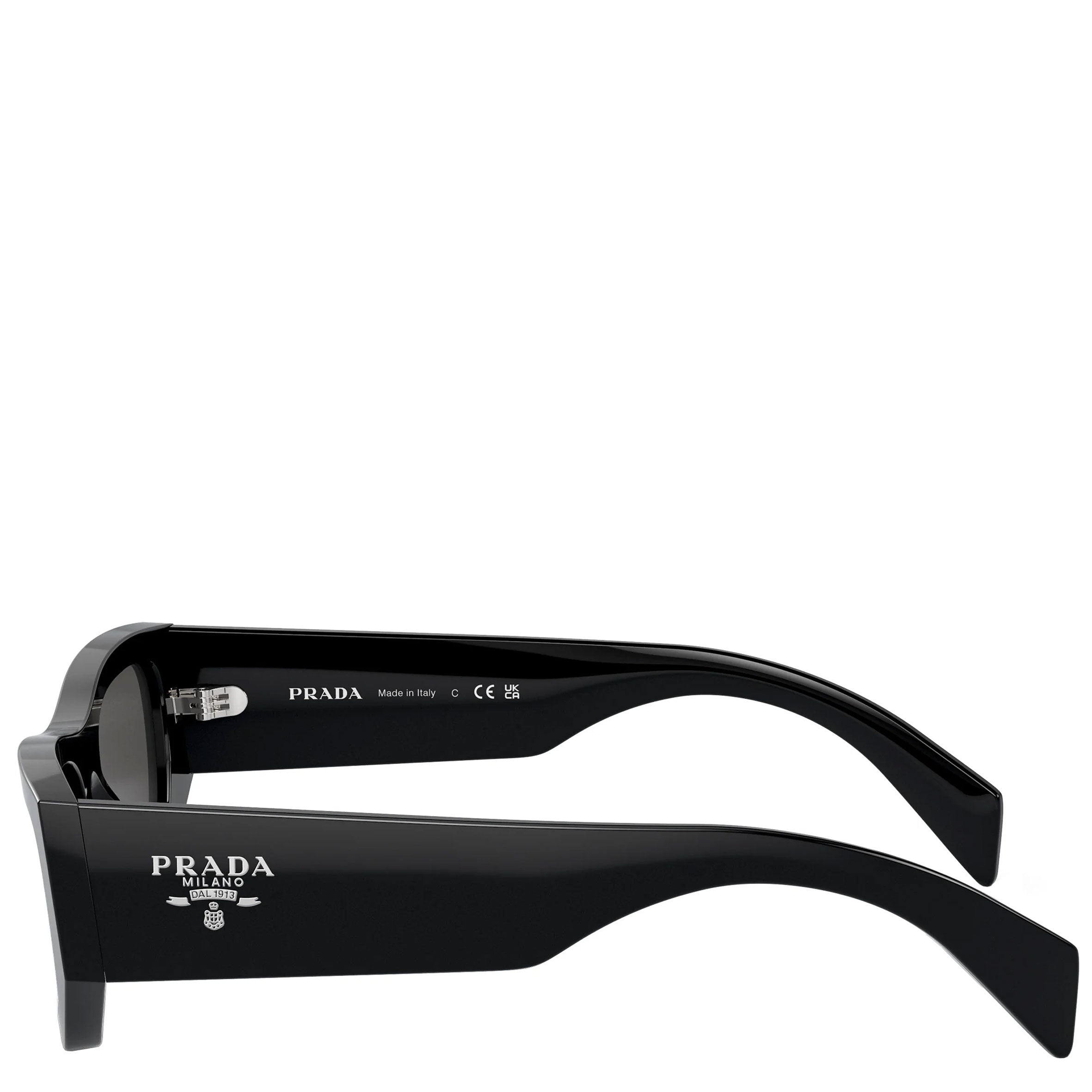 Prada sunglasses unisex model A01S featuring black frame and dark grey lens with high bridge fit. The sophisticated front with bold rims is combined with chunky temples embellished with the iconic Prada logo.