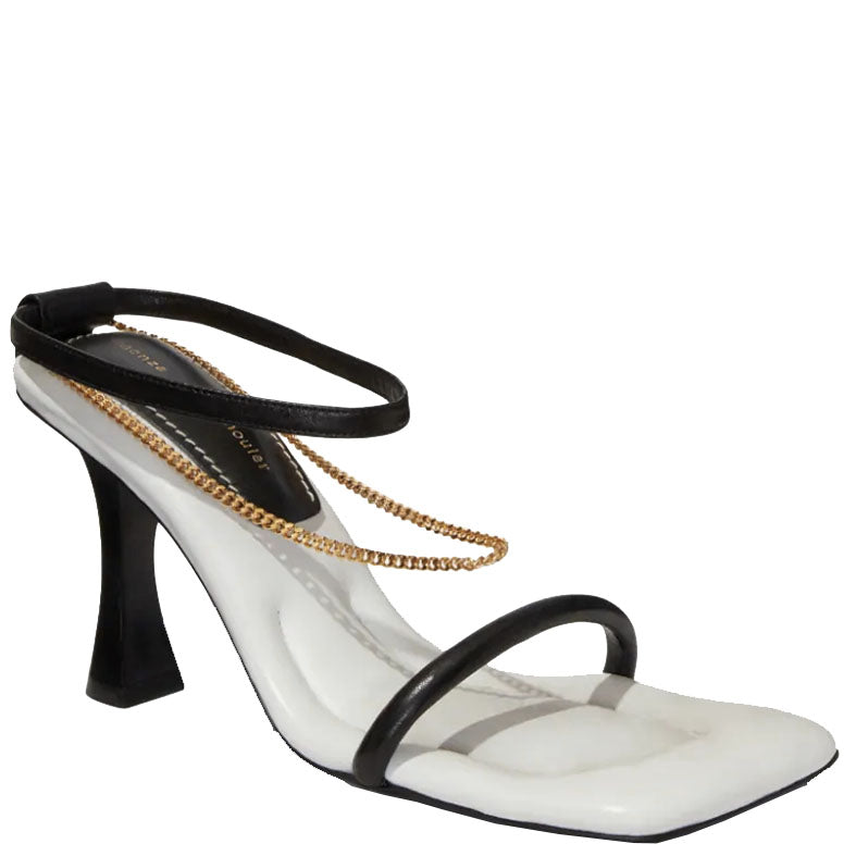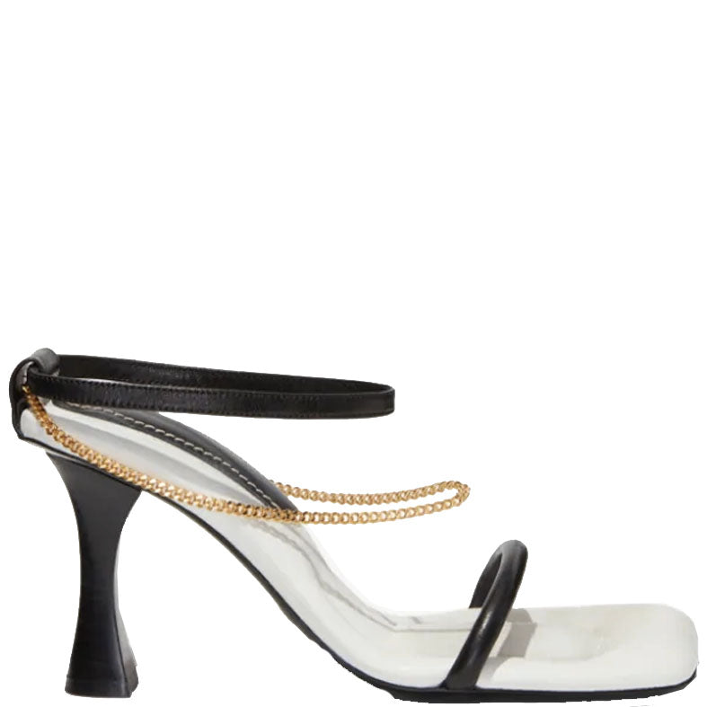 The Chained High Heel Sandals in black and white are crafted in supple leather and feature a padded front strap and a slim ankle strap. Gold-tone metal ankle chain. Contrast padded insole. Slip-on design. Open square toe. Fluted high heel. Contrasting leather sole.