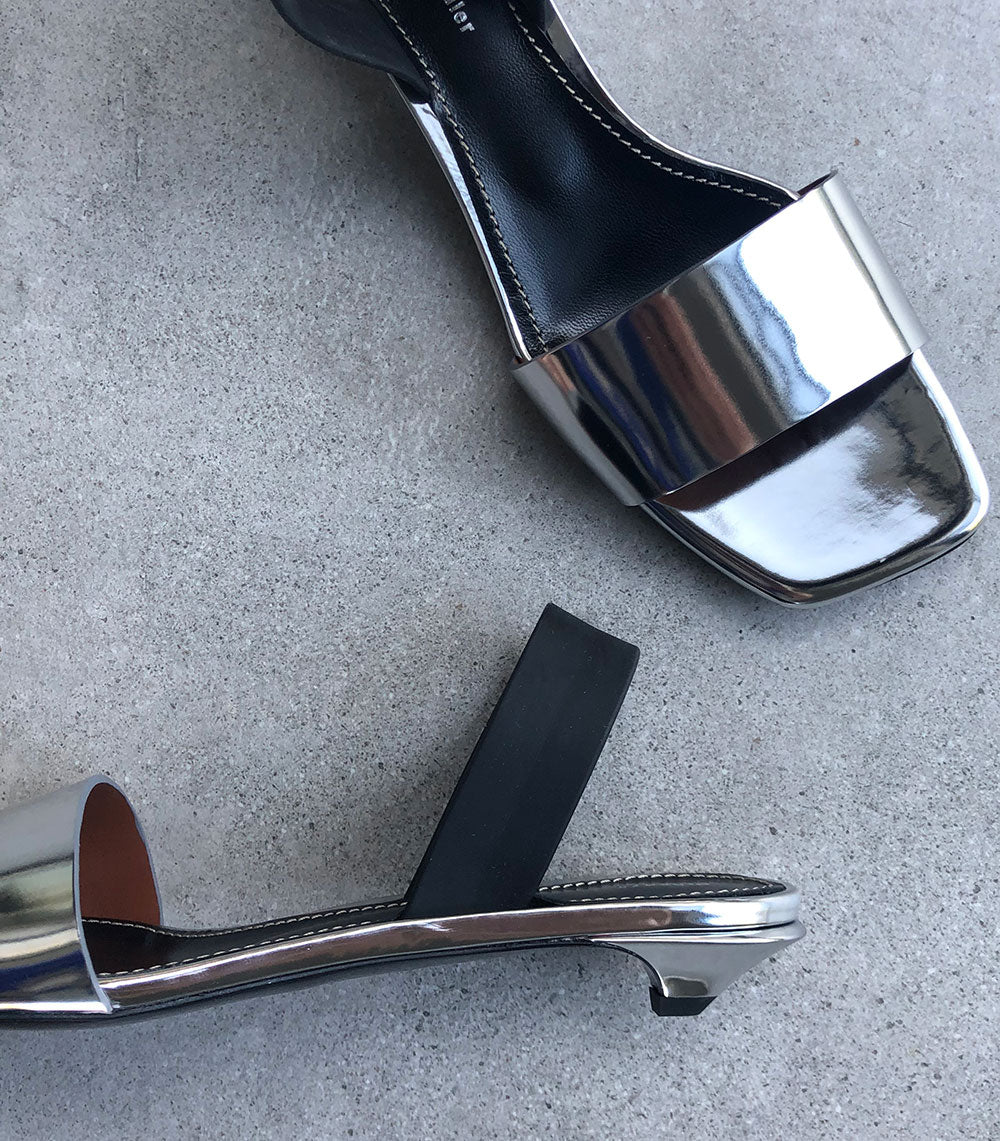 The Open Slingbacks feature an open toe and an angular kitten heel. They are crafted in smooth patent silver leather and secured with a rubberized slingback.