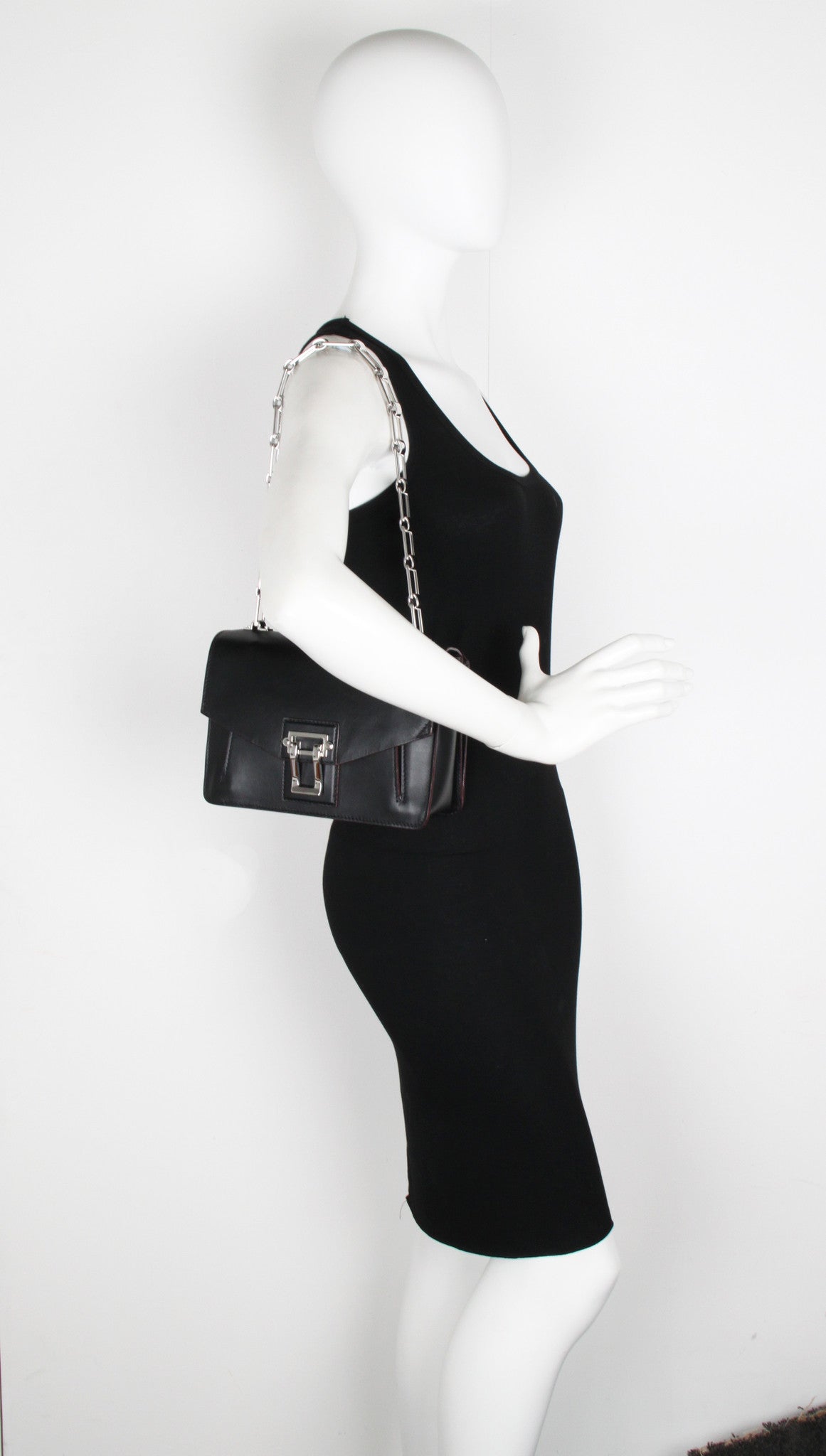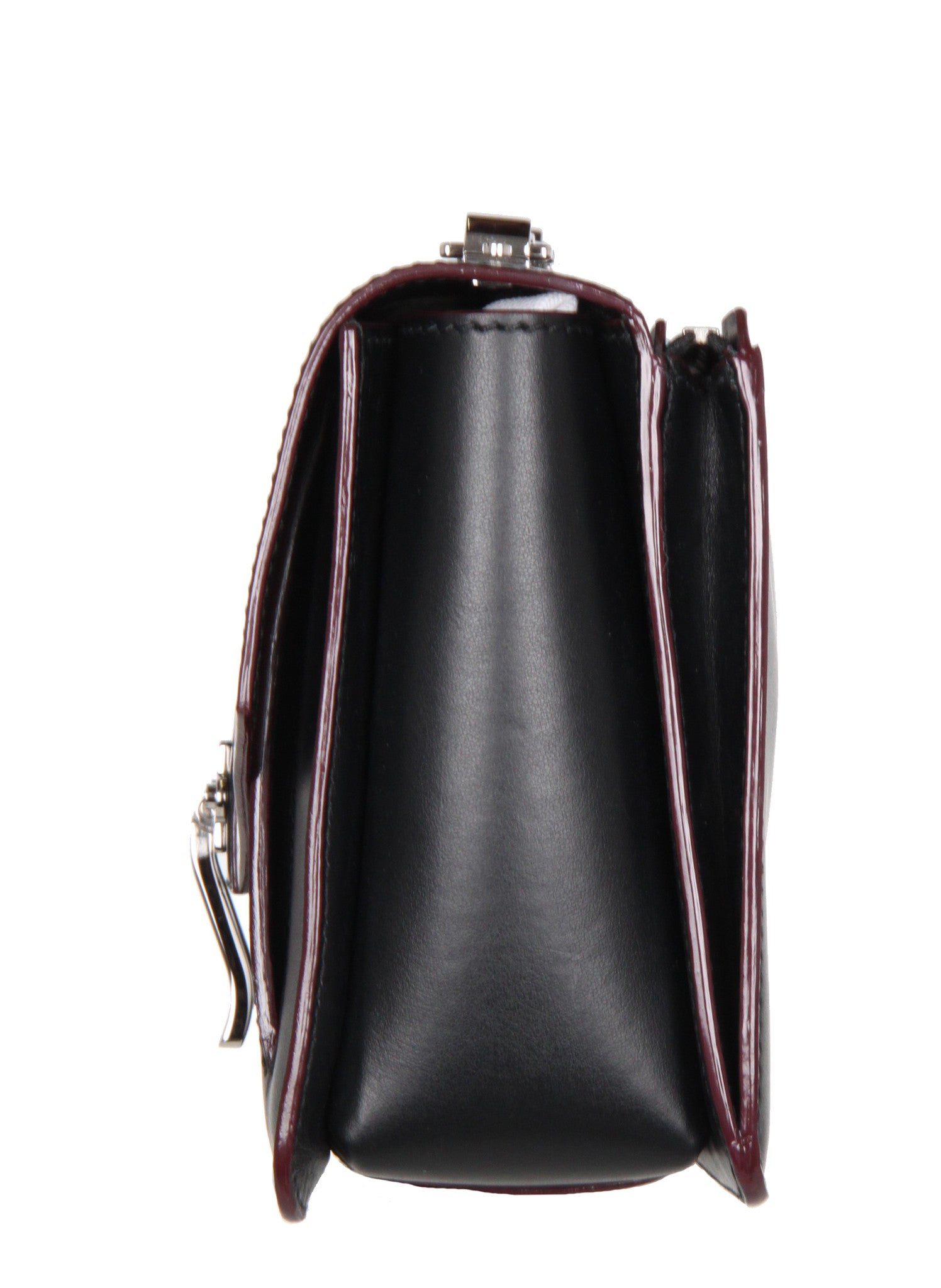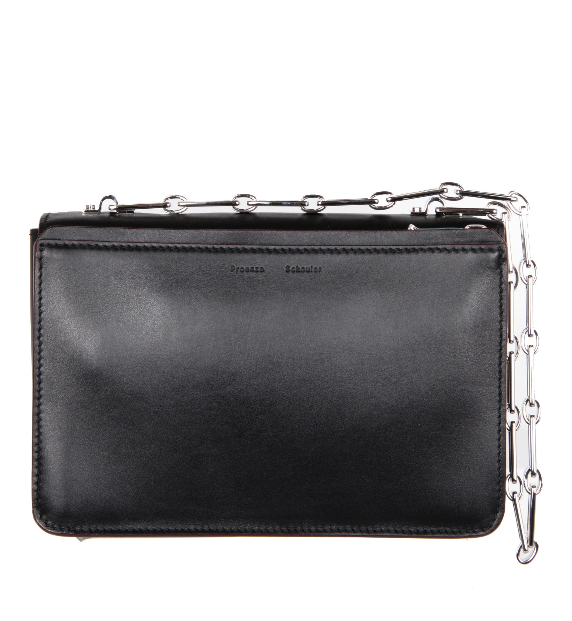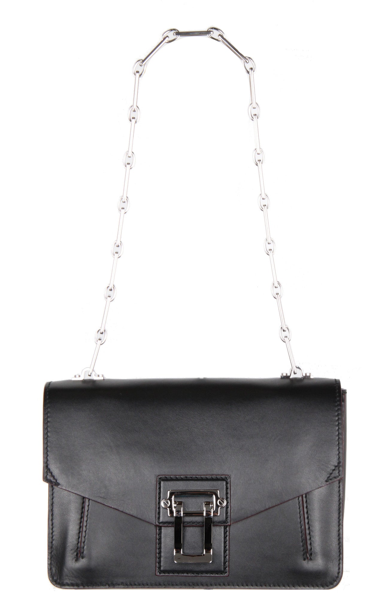 Leather flap front bag with top handle, adjustable shoulder strap, and push lock closure. Additional front compartment accessible through hidden zippered closure. Sides slightly expandable with small leather covered snaps. One compartment with inner zipper pocket. One back zipper pocket. Proenza Schouler stamped on center back.