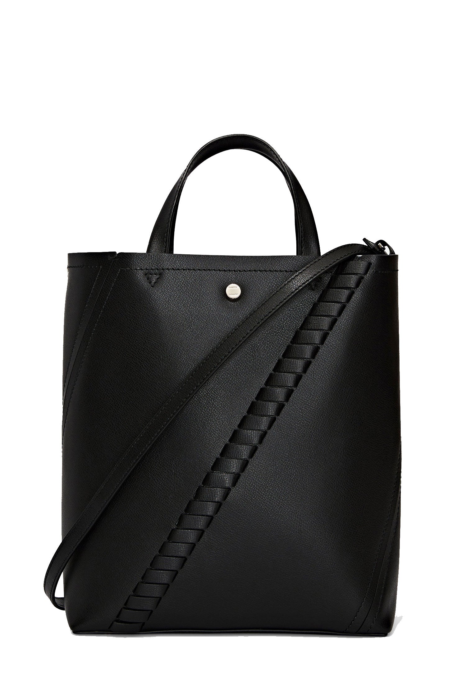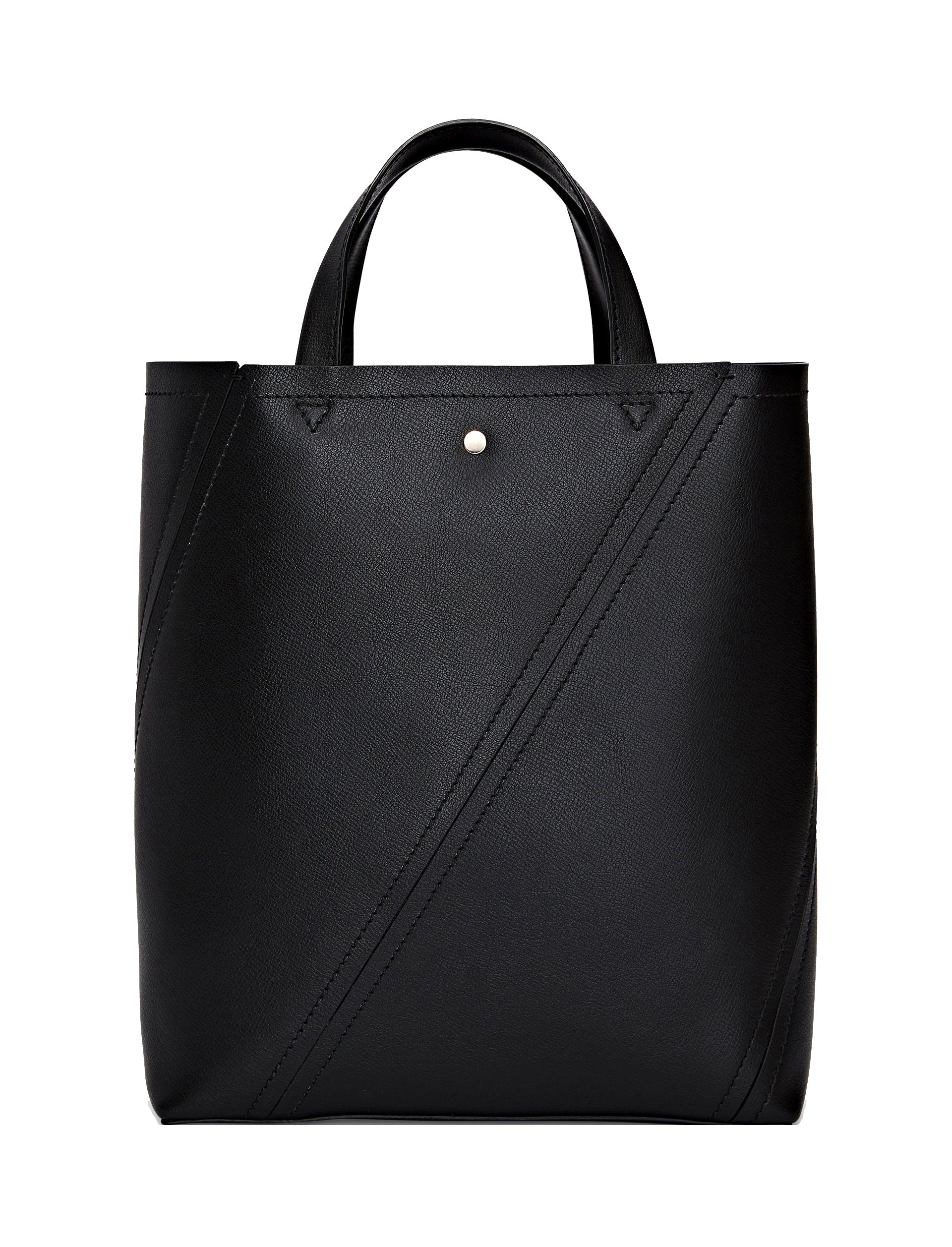 From an elegantly structured silhouette, this Hex Tote combines classic design elements including asymmetric top-stitching and whip-stitch details. Sculpted from a sleek calf leather, a unique spiral construction is highlighted amongst the natural leather composition and hardware. The top handles allow the piece to be carried by hand, and the removable and adjustable strap allows the bag to be carried on the shoulder or across the body. Magnetic snap closure.