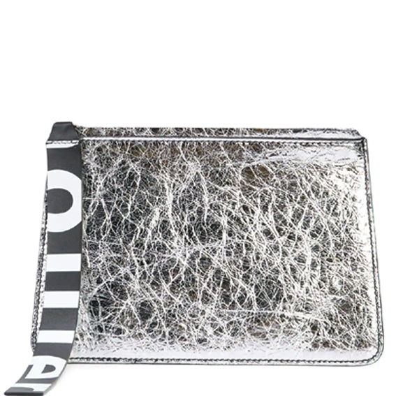 Crafted in silver crinkled calf leather, the Metallic Medium Pouch features a geometric shape, top zip closure, and spacious interior compartment. Includes a logo printed leather tag and logo embossing on the front.